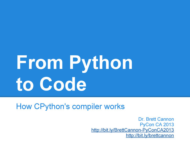 How the heck does CPython take a blob of bytes you call source code and create another blob of bytes called bytecode which it is able to execute to make the magic of Python programs work? This talk's aim is to provide a conceptual answer to that question. The overall process of tokenizing, parsing, creating an AST, and then finally emitting bytecode will be covered.