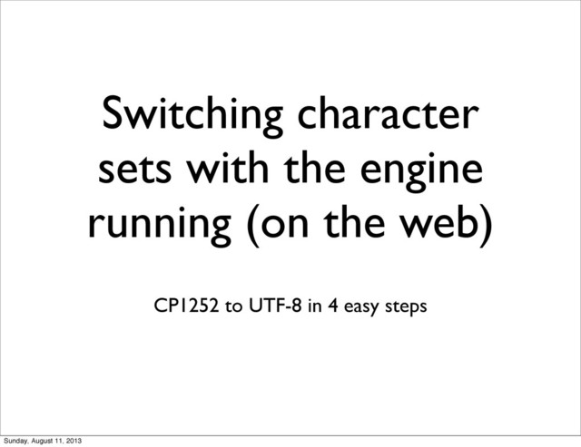 the web, and handle UTF-8 data internally • Change the DB connection charset to utf8 • (I had to do this for a PHP app, where everything is a bytestring in an unspecified encoding; the implicit charset went from cp1252+entities to utf8) Sunday, August 11, 2013