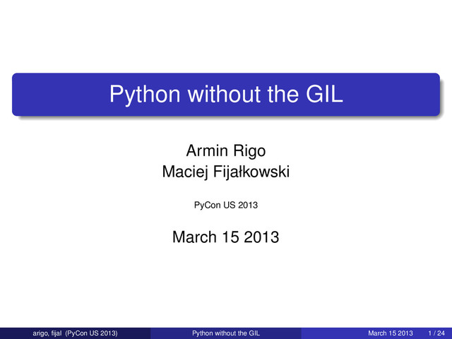 with limited shared state etc.: tons of experiments that never caught on in the mainstream arigo, fijal (PyCon US 2013) Python without the GIL March 15 2013 8 / 24