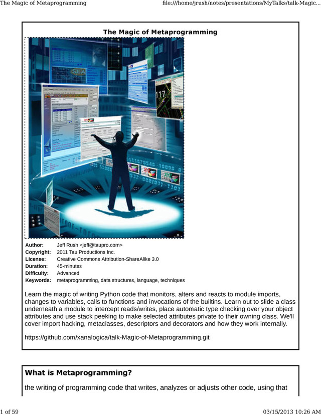 >>> main() >>> for h in vt.history: >>> print h (0, 'target_trackstate.py', 6, '__init__') (1, 'target_trackstate.py', 9, 'advance') (2, 'target_trackstate.py', 9, 'advance') (3, 'target_trackstate.py', 9, 'advance') import sys, inspect class ValueTracker(object): # a descriptor def __init__(self, tgt_cls, aname): self.attrname = aname self.history = [] setattr(tgt_cls, aname, self) def __get__(self, obj, type=None): return instance.__dict__[self.attrname] def __set__(self, obj, value): instance.__dict__[self.attrname] = value finfo = inspect.getframeinfo(sys._getframe(1) ) self.history.append((value, finfo.filename, finfo.lineno, finfo.function)) Example 7: Tracking Changes in a Value The Magic of Metaprogramming file:///home/jrush/notes/presentations/MyTalks/talk-Magic... 58 of 59 03/15/2013 10:26 AM