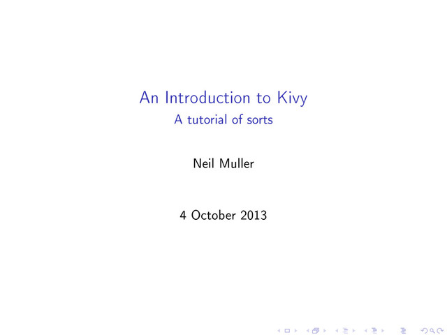 People attending the tutorial are encouraged to install kivy before the tutorial. The instructions on the kivy site cover most cases. If installing in a virtualenv, note that kivy requires pygame and cython to install. For experimenting with kivy on android devices, I recommend that kivy launcher from the google play store.