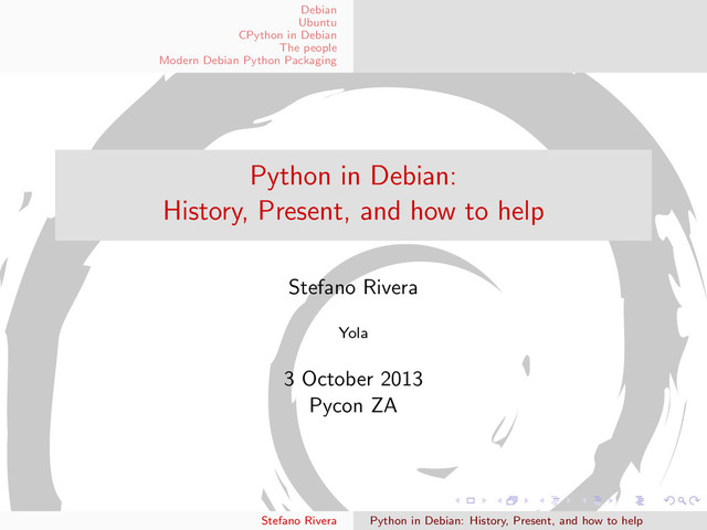 Packaging Python in Debian: History, Present, and how to help Stefano Rivera Yola 3 October 2013 Pycon ZA Stefano Rivera Python in Debian: History, Present, and how to help