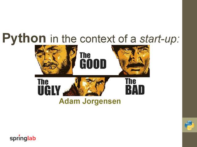 Python is great language for developing software that works well in a short time-span. The ability to produce code quickly that is of a reasonable quality is very important in a work environment where productivity is of extreme importance. It would thus seem to be very well suited for usage in a start-up environment. Is this really the case though?
