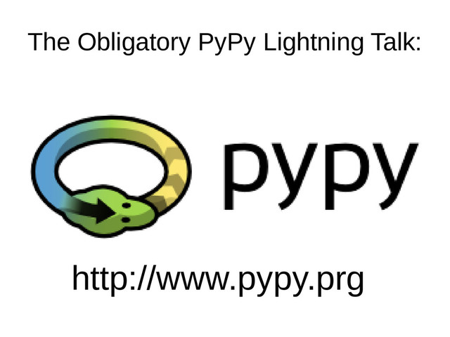 using a restricted form of Python called RPython • A JITing Python interpreter written in Python using RPython and the framework above • Why use PyPy? • Fast (6x faster than CPython on average thanks to JIT) • Compliant (No deal-breaking language changes) • Compatible (Many C extensions work out-of-the-box) • Memory usage (Goodbye ref-counting) • Coming soon: STM and the Death of the GIL • How can I help? • Use PyPy! • Port non-working libraries and extensions to PyPy! • Donate towards Py3K, STM, NumPy and general PyPy progress! • Promote PyPy!