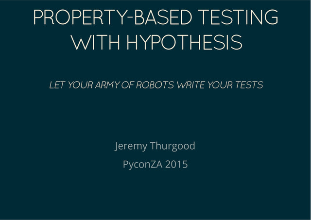 This talk will provide a practical introduction to property-based testing with Hypothesis, and show how you can use it to build more effective test suites with less effort.