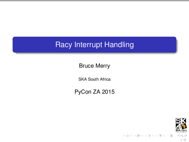 to C handler 2 Handler sets a flag to indicate interrupt happened 3 Handler requests interpreter to run PyErr_CheckSignals as soon as convenient 4 Main thread continues where it was interrupted Later, PyErr_CheckSignals runs the Python handler or raises KeyboardInterrupt. 2 / 5