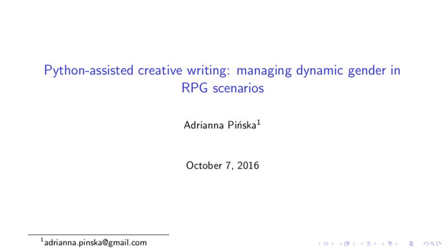 In this talk I will discuss why it is useful for the gender of characters in a live action roleplaying game scenario to be an easily changeable property, and introduce Genderiser, a Python script which is intended to assist non-technical writers in utilising this technique in their own work.