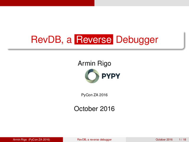 RevDB is an experimental "reverse debugger" for Python, similar to UndoDB-GDB or LL for C. You run your program once, in "record" mode, producing a log file; once you get buggy behavior, you start the reverse-debugger on the log file. It gives an (improved) pdb-like experience, but it is replaying your program exactly as it ran---all input/outputs are replayed from the log file instead of being redone.