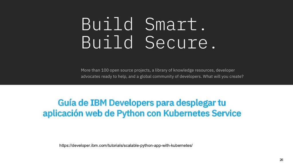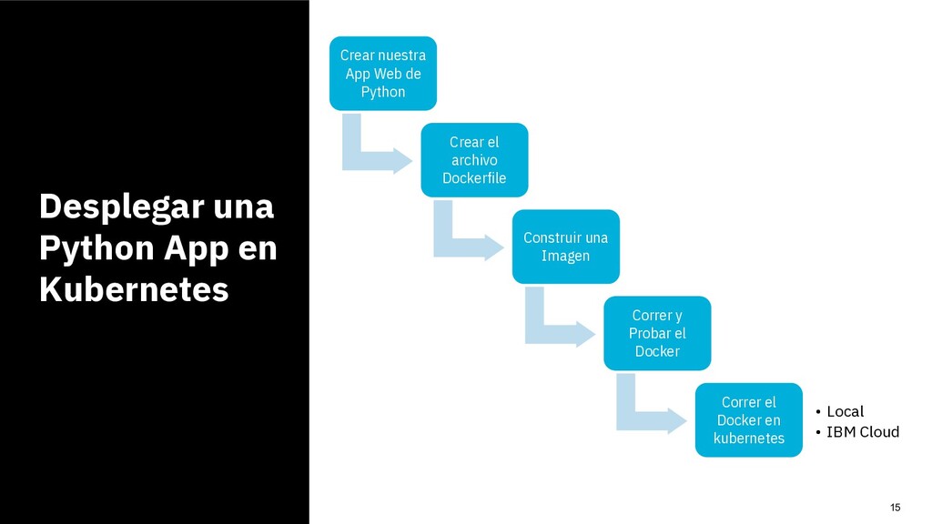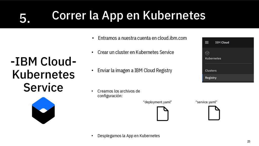 la imagen a IBM Cloud Registry • Creamos los archivos de configuración: -IBM Cloud- Kubernetes Service “deployment.yaml” • Desplegamos la App en Kubernetes “service.yaml” Correr la App en Kubernetes 5. • Entramos a nuestra cuenta en cloud.ibm.com