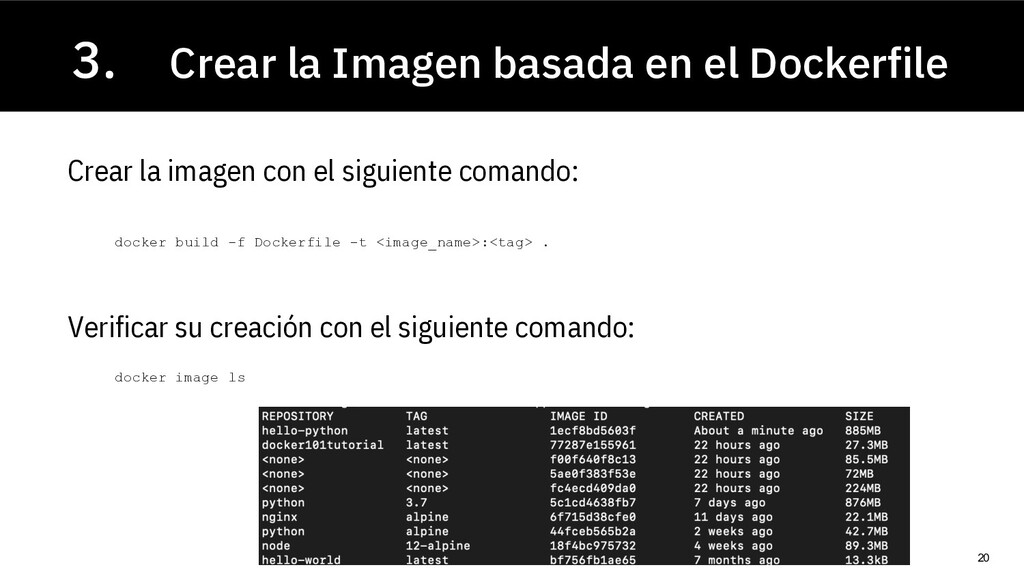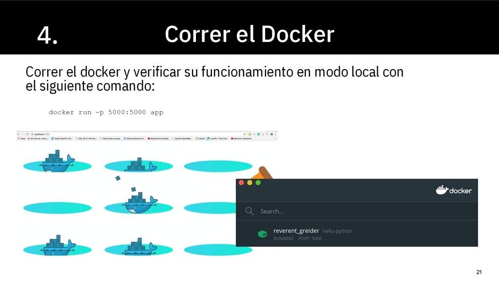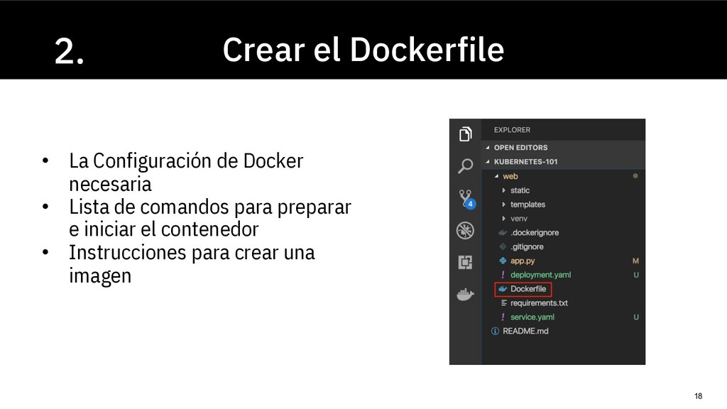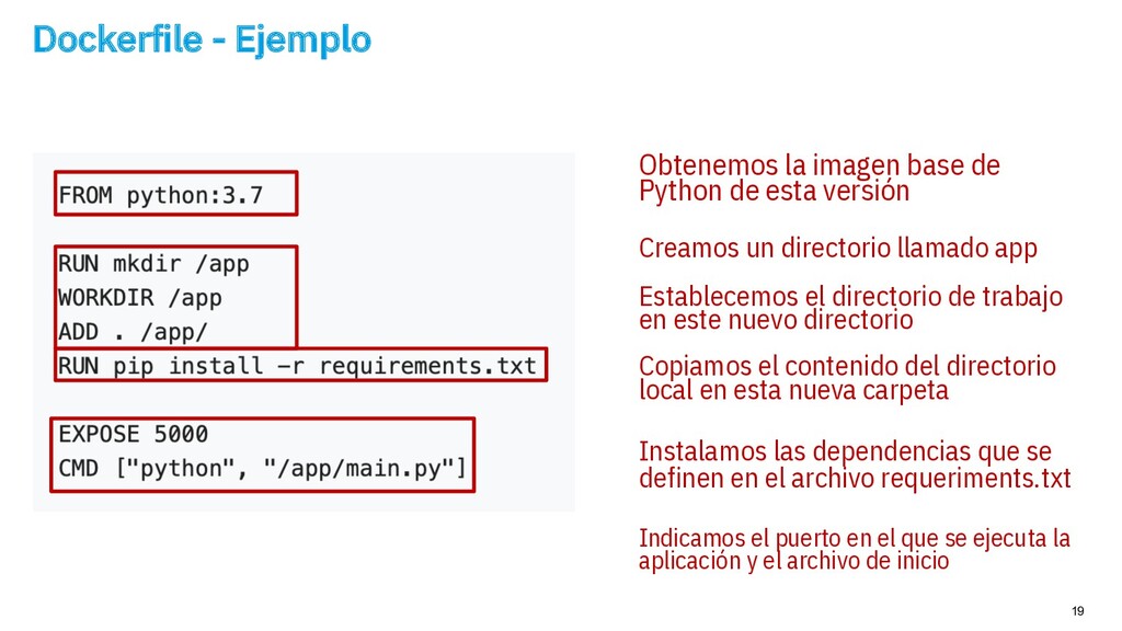 de esta versión Creamos un directorio llamado app Establecemos el directorio de trabajo en este nuevo directorio Copiamos el contenido del directorio local en esta nueva carpeta Instalamos las dependencias que se definen en el archivo requeriments.txt Indicamos el puerto en el que se ejecuta la aplicación y el archivo de inicio