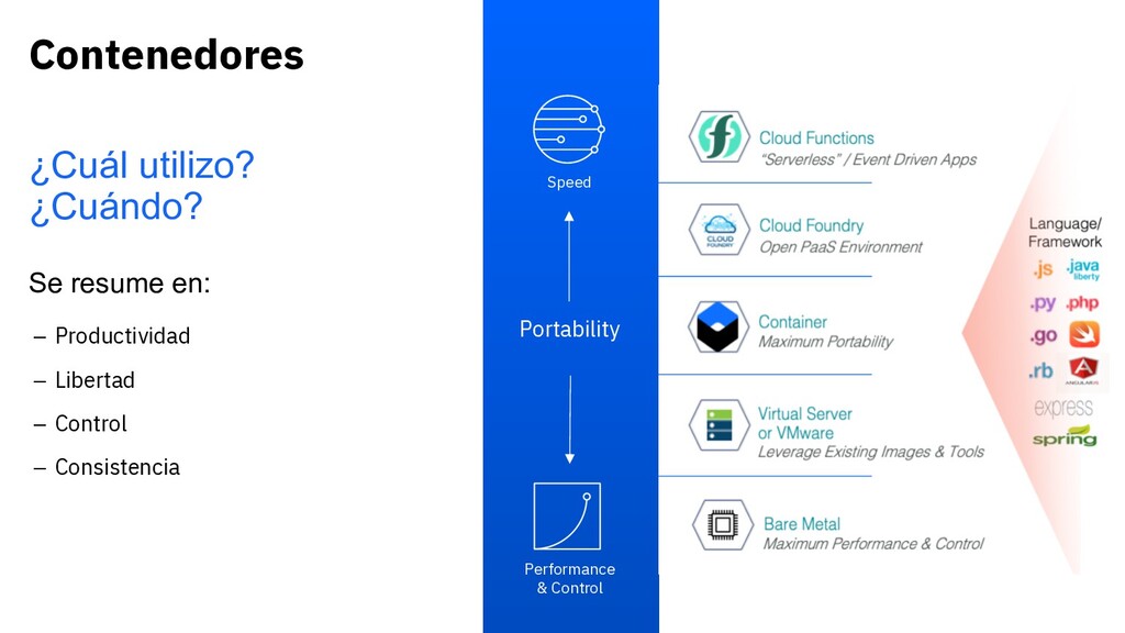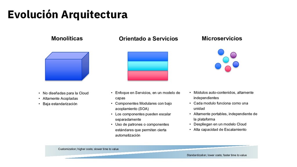 Cloud • Altamente Acopladas • Baja estandarización • Enfoque en Servicios, en un modelo de capas • Componentes Modulares con bajo acoplamiento (SOA) • Los componentes pueden escalar separadamente • Uso de patrones o componentes estándares que permiten cierta automatización • Módulos auto-contenidos, altamente independientes • Cada modulo funciona como una unidad • Altamente portables, independiente de la plataforma • Despliegan en un modelo Cloud • Alta capacidad de Escalamiento Customization; higher costs; slower time to value Standardization; lower costs; faster time to value Evolución Arquitectura