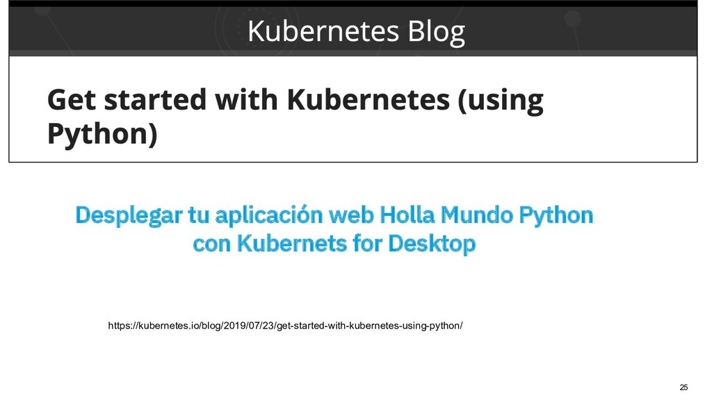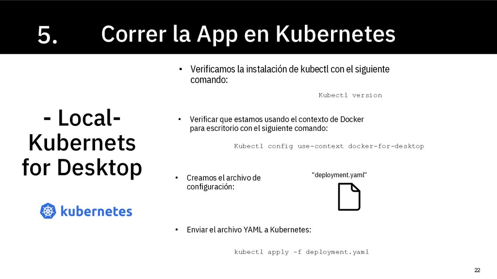 comando: Kubectl version • Verificar que estamos usando el contexto de Docker para escritorio con el siguiente comando: Kubectl config use-context docker-for-desktop - Local- Kubernets for Desktop “deployment.yaml” • Enviar el archivo YAML a Kubernetes: kubectl apply -f deployment.yaml • Creamos el archivo de configuración: Correr la App en Kubernetes 5.