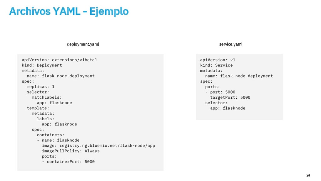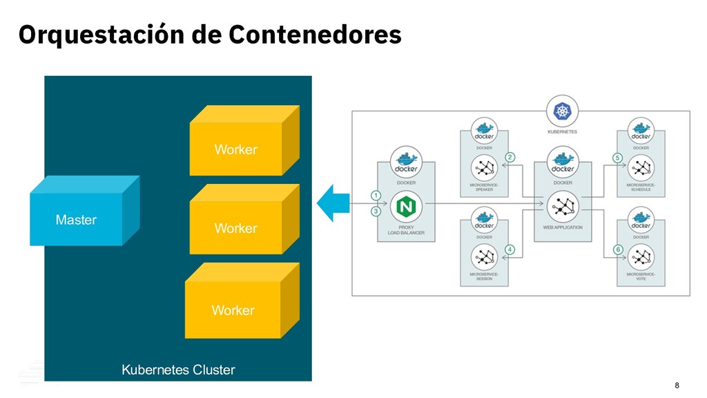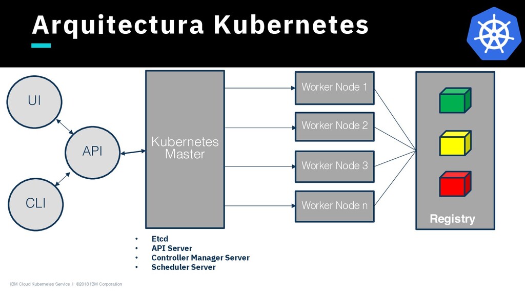 IBM Corporation Arquitectura Kubernetes API UI CLI Kubernetes Master Worker Node 1 Worker Node 2 Worker Node 3 Worker Node n Registry • Etcd • API Server • Controller Manager Server • Scheduler Server