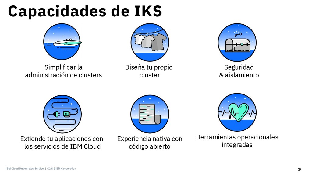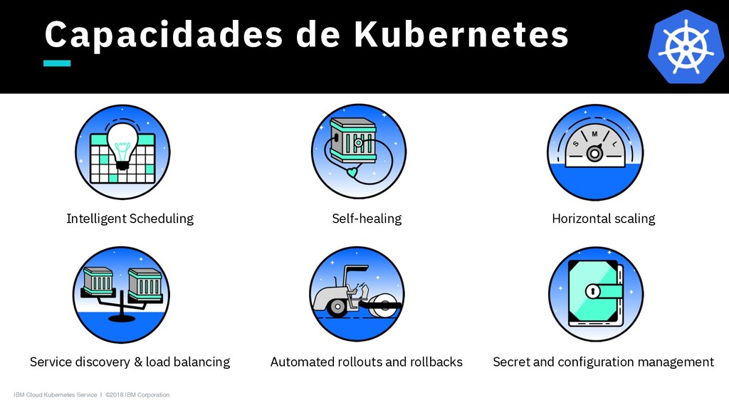 IBM Corporation Capacidades de Kubernetes Intelligent Scheduling Self-healing Horizontal scaling Service discovery & load balancing Automated rollouts and rollbacks Secret and configuration management