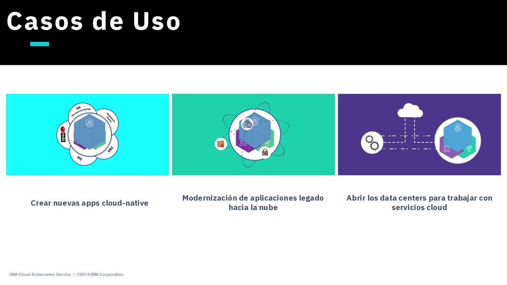 IBM Corporation Casos de Uso Crear nuevas apps cloud-native Modernización de aplicaciones legado hacia la nube Abrir los data centers para trabajar con servicios cloud