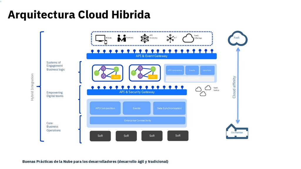 NoSQL API Composition SoR Core Business Operations Empowering Digital teams Systems of Engagement Business logic Mobile Partners SaaS Offerings API Economy IoT XaaS On-Premise Cloud affinity SoR Enterprise Connectivity Events Data Synchronisation Hybrid Integration SoR API & Event Gateway API & Security Gateway SoR API Composition Events Data Sync. “Digital” connectivity SaaS SoR(s) Buenas Prácticas de la Nube para los desarrolladores (desarrollo ágil y tradicional) Arquitectura Cloud Hibrida