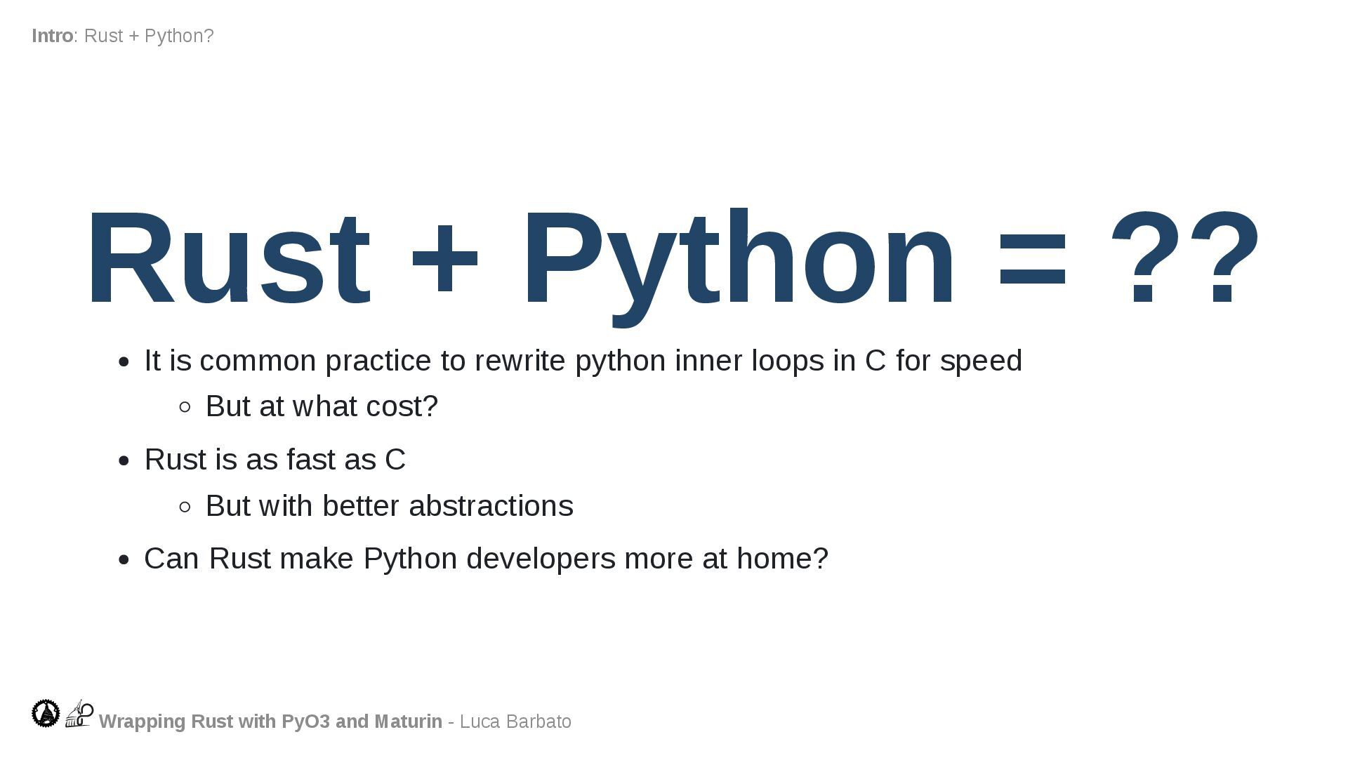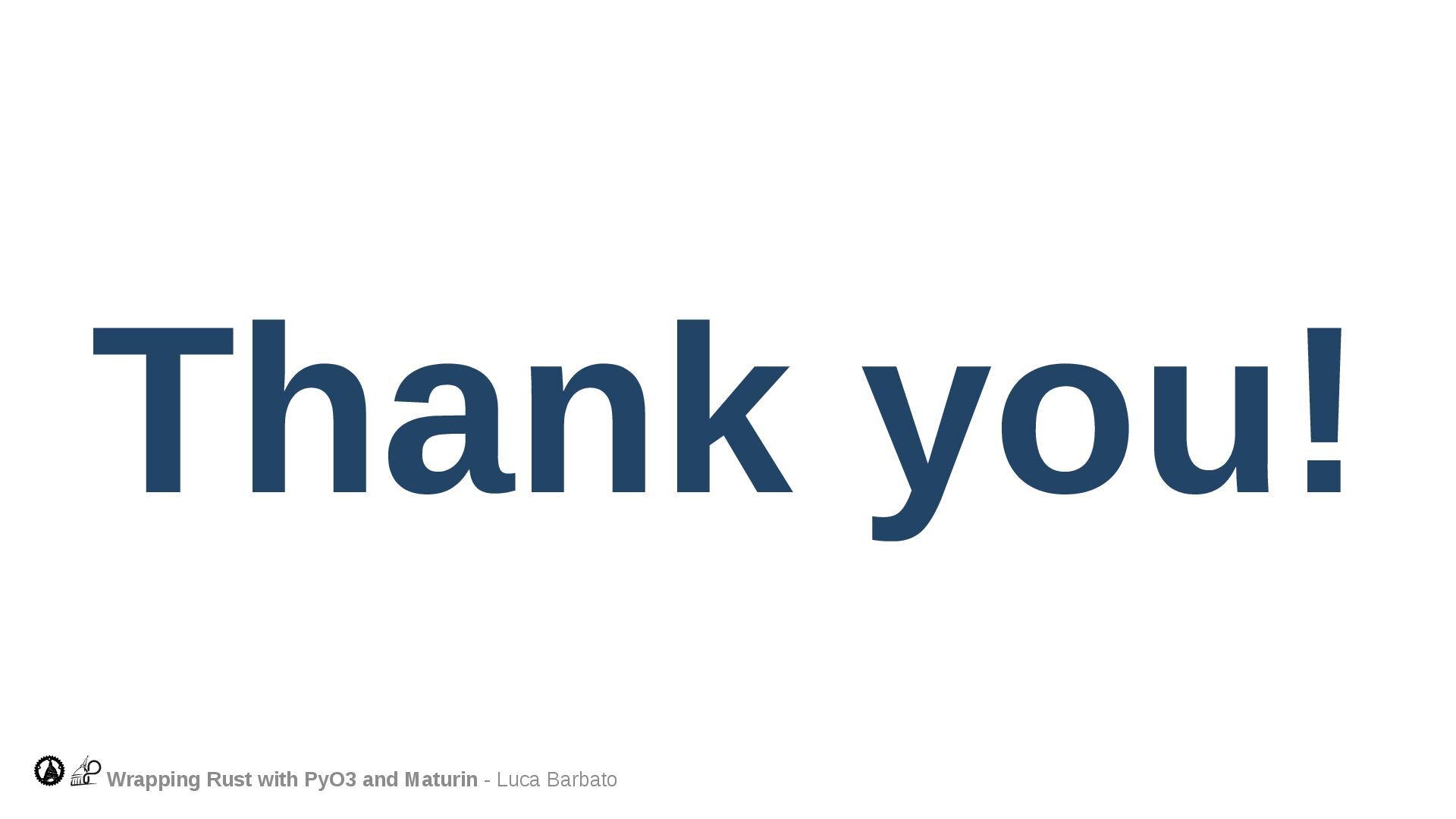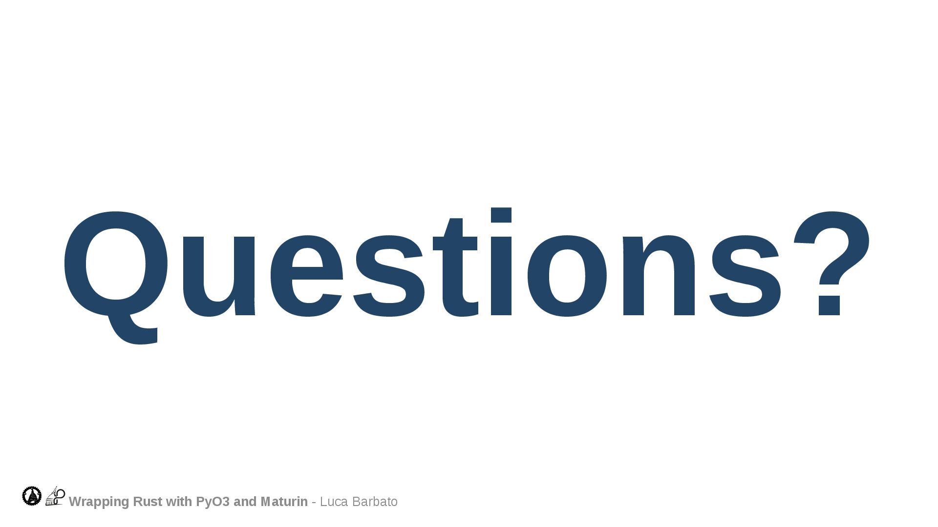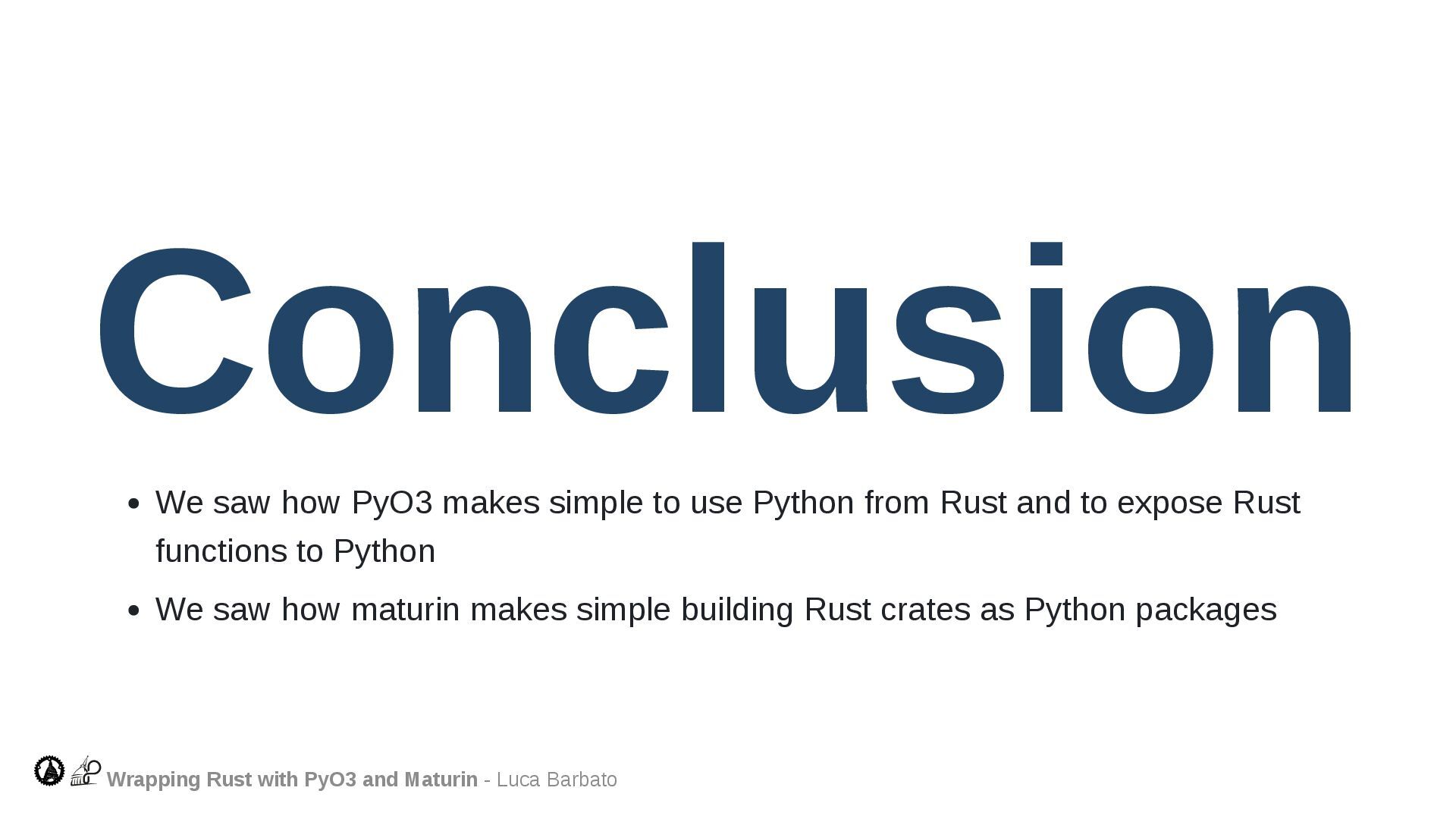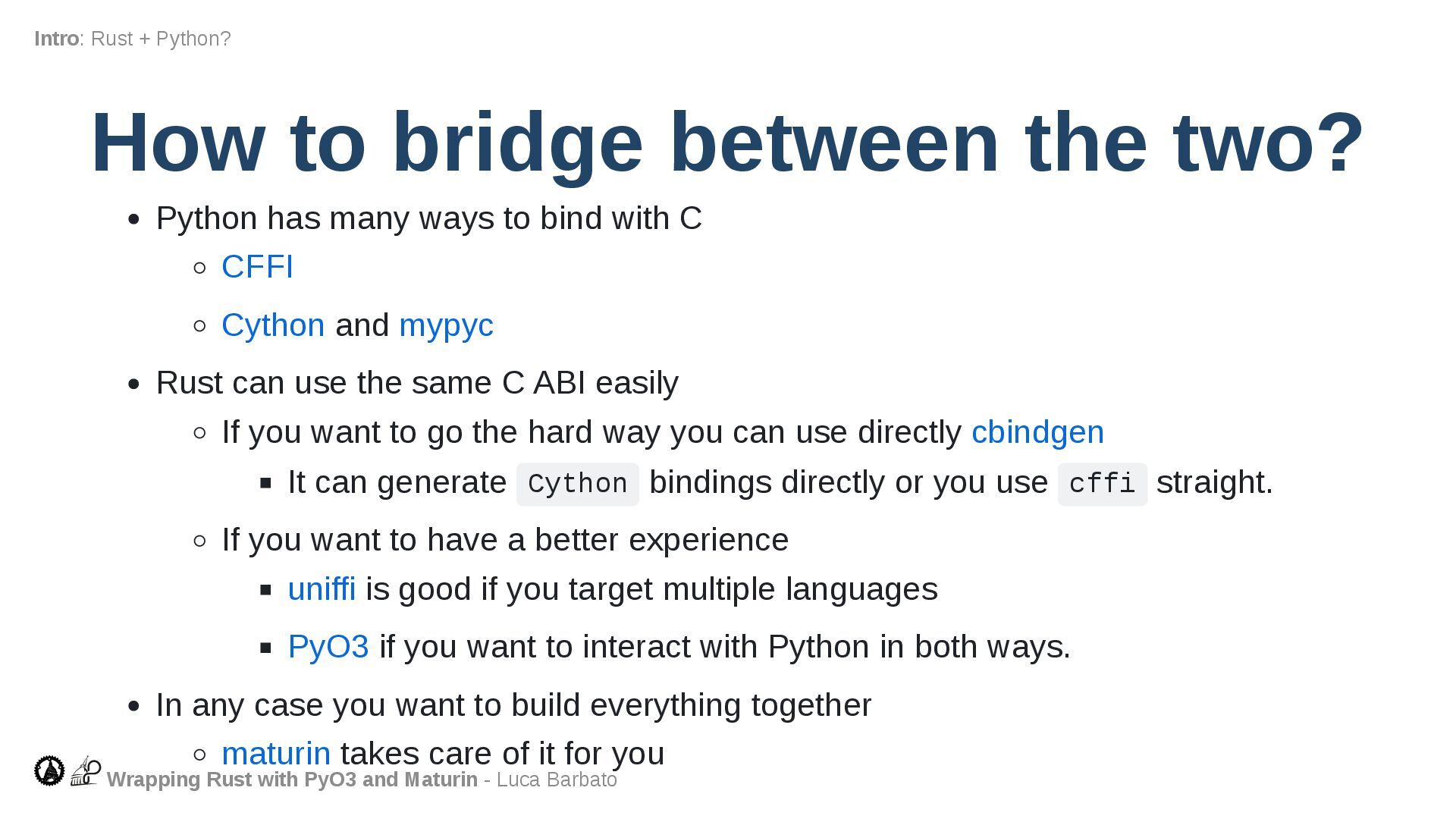 Successivamente, esploreremo insieme alcuni esempi pratici di come utilizzare queste librerie per avvolgere le nostre rust crate in pacchetti Python. Infine, cercheremo un piccolo crate che possa essere utile da avvolgere e proveremo a farlo insieme durante il workshop.