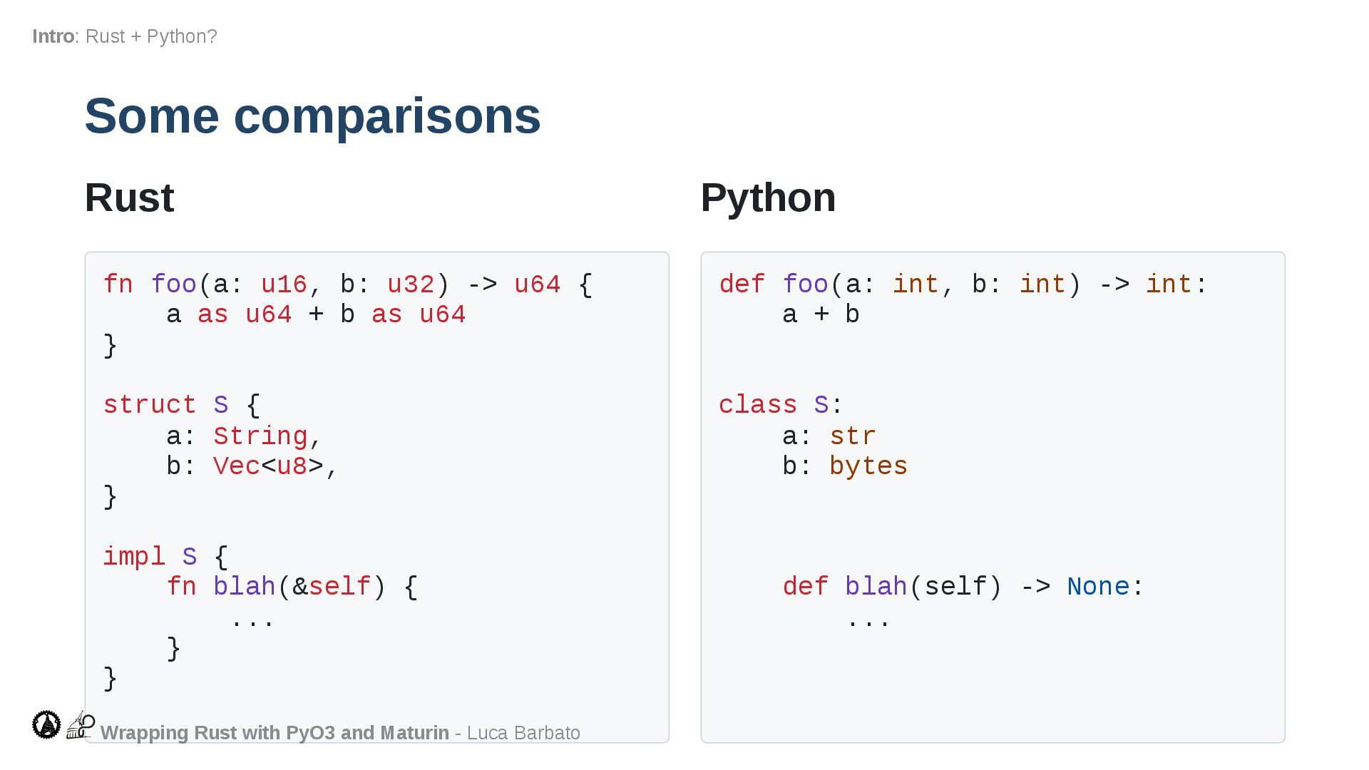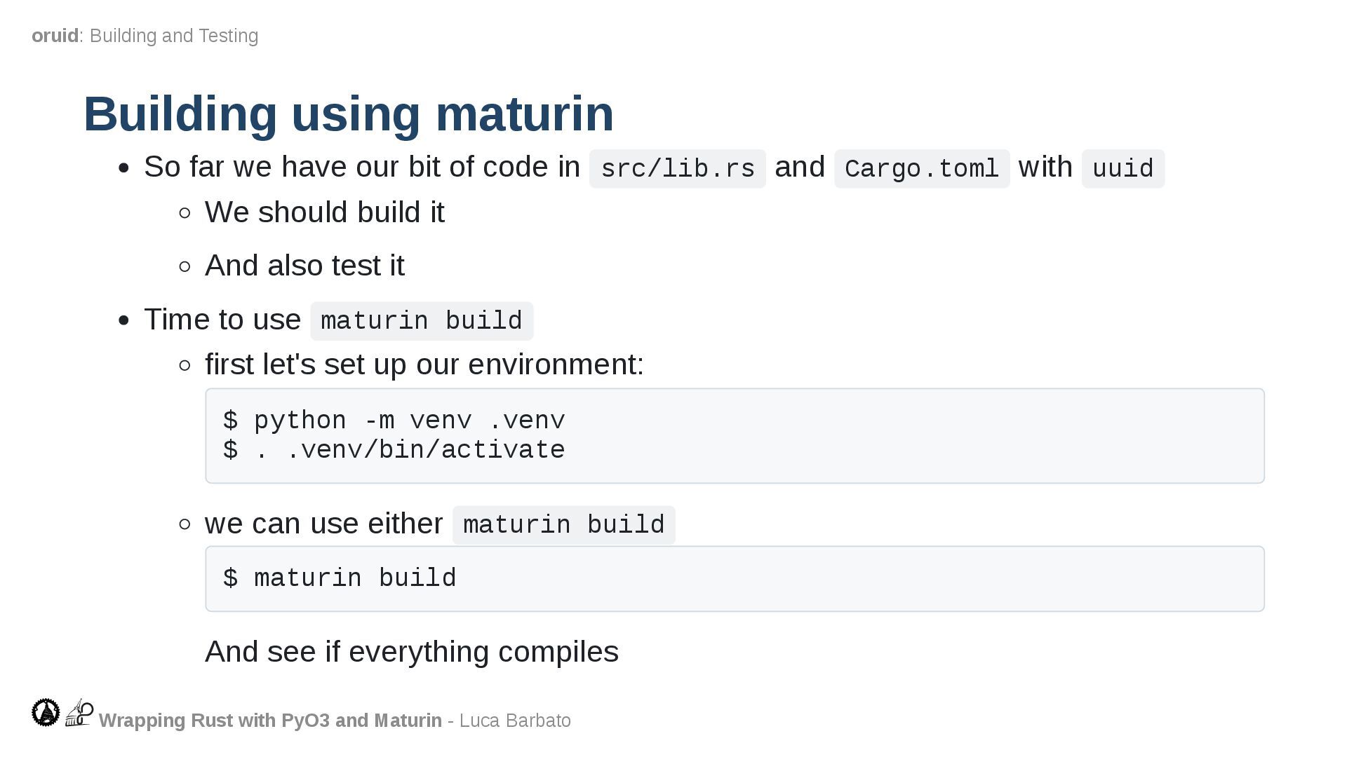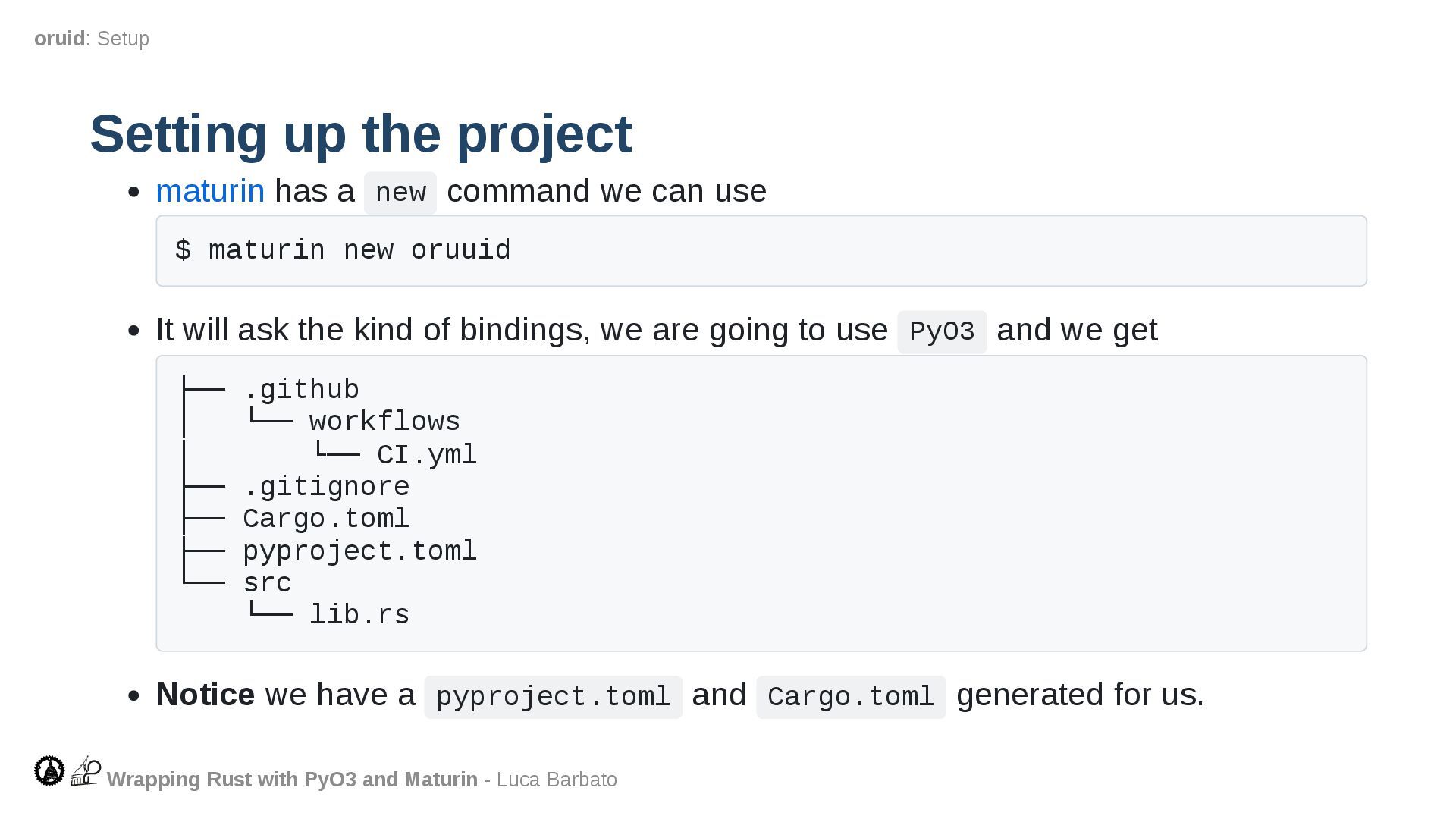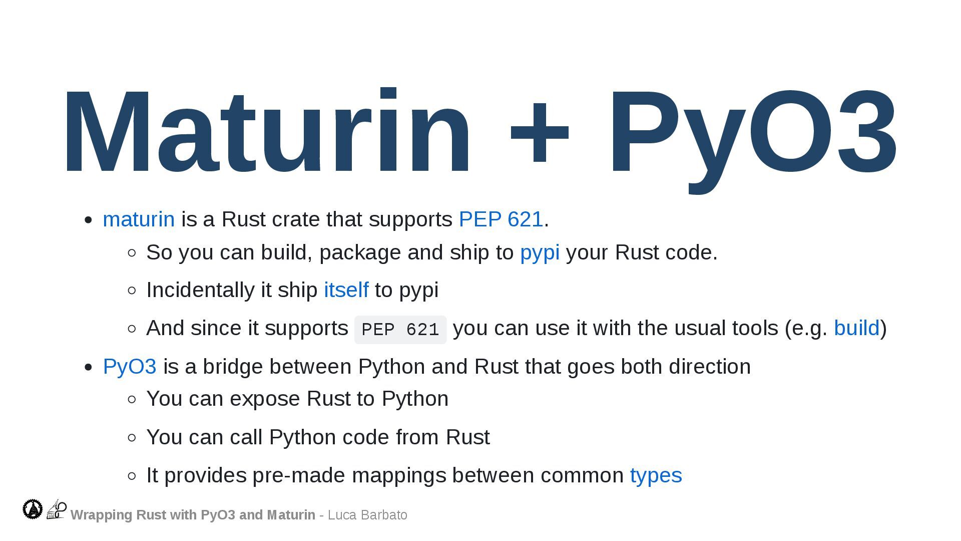 Successivamente, esploreremo insieme alcuni esempi pratici di come utilizzare queste librerie per avvolgere le nostre rust crate in pacchetti Python. Infine, cercheremo un piccolo crate che possa essere utile da avvolgere e proveremo a farlo insieme durante il workshop.