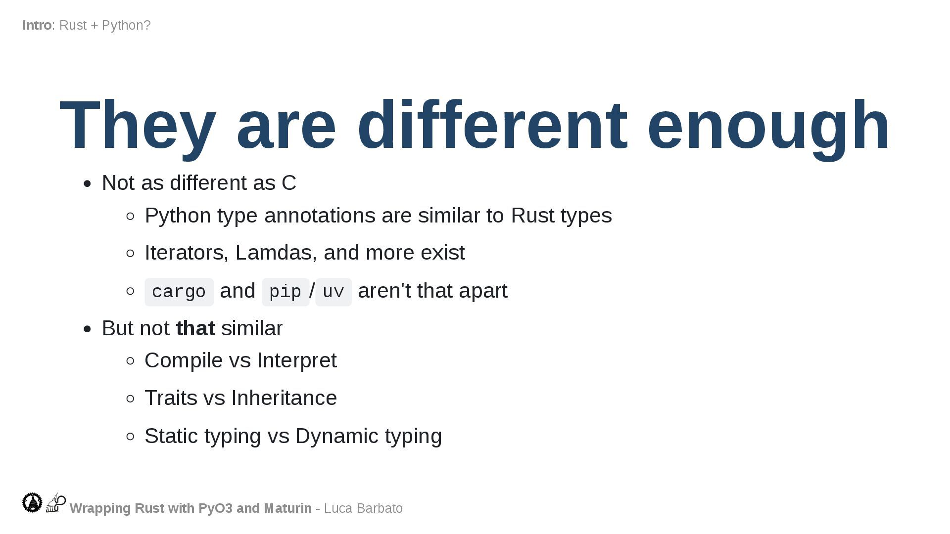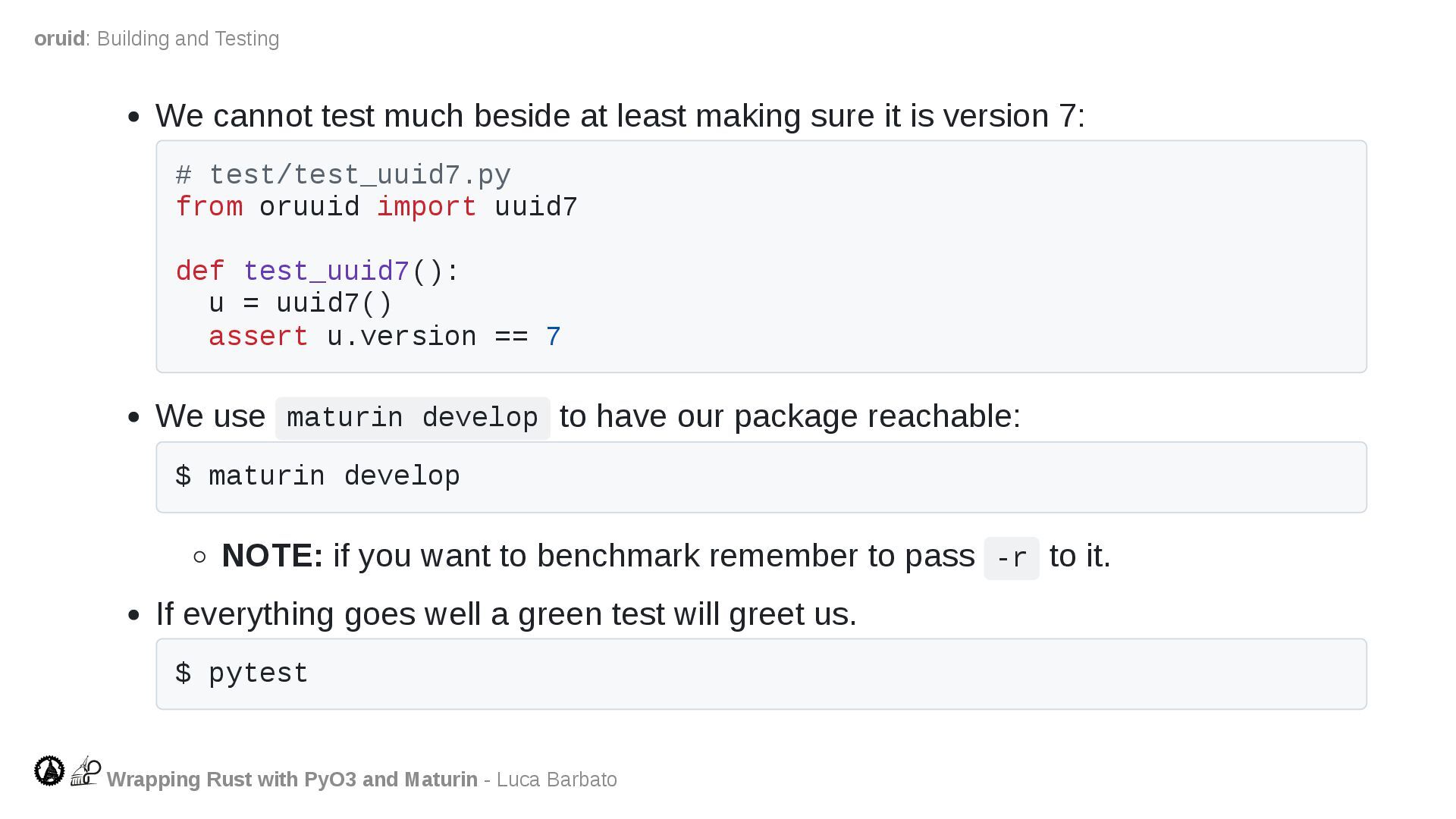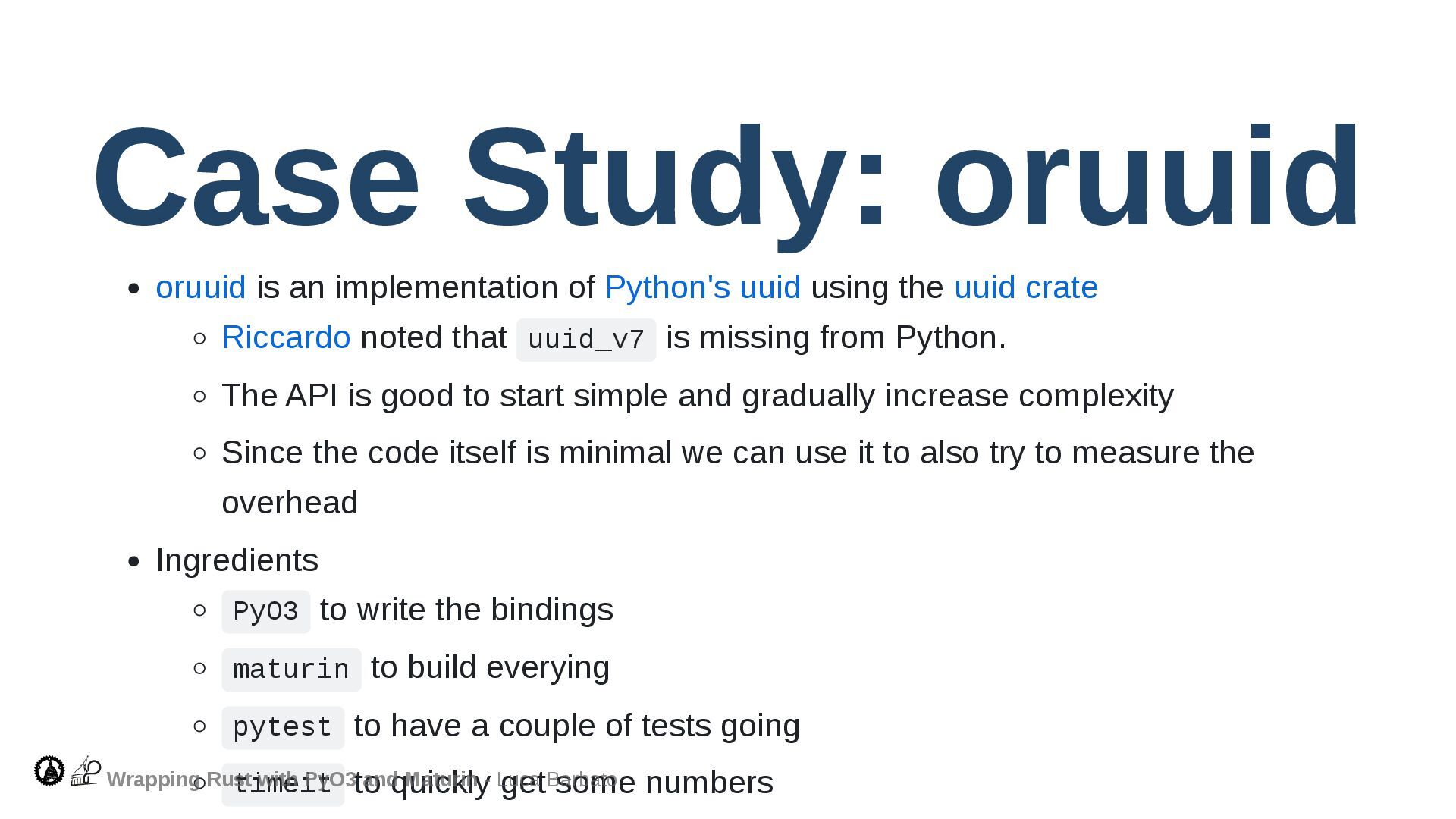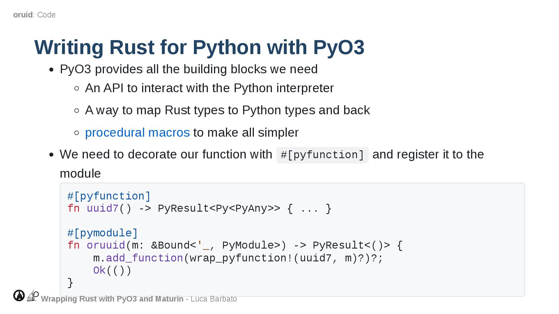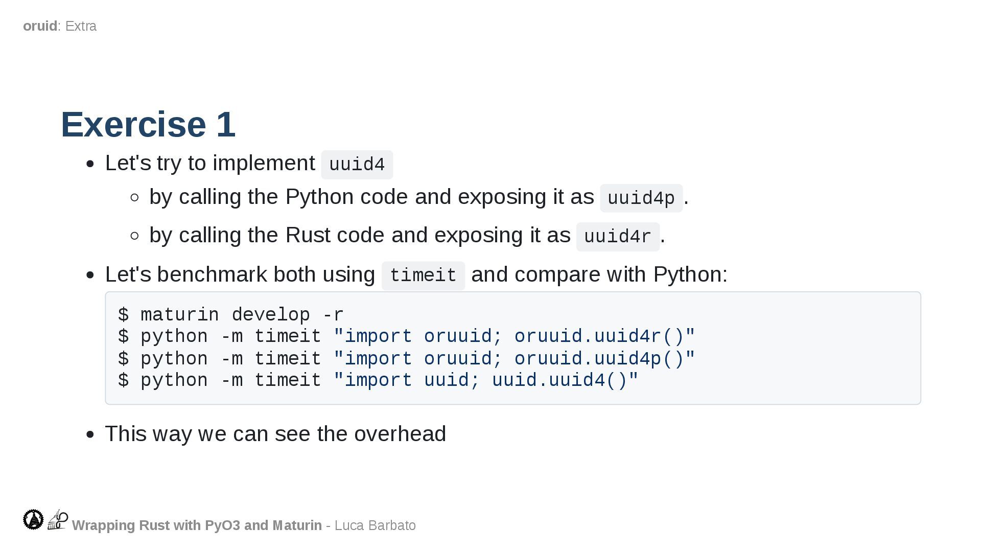 Successivamente, esploreremo insieme alcuni esempi pratici di come utilizzare queste librerie per avvolgere le nostre rust crate in pacchetti Python. Infine, cercheremo un piccolo crate che possa essere utile da avvolgere e proveremo a farlo insieme durante il workshop.