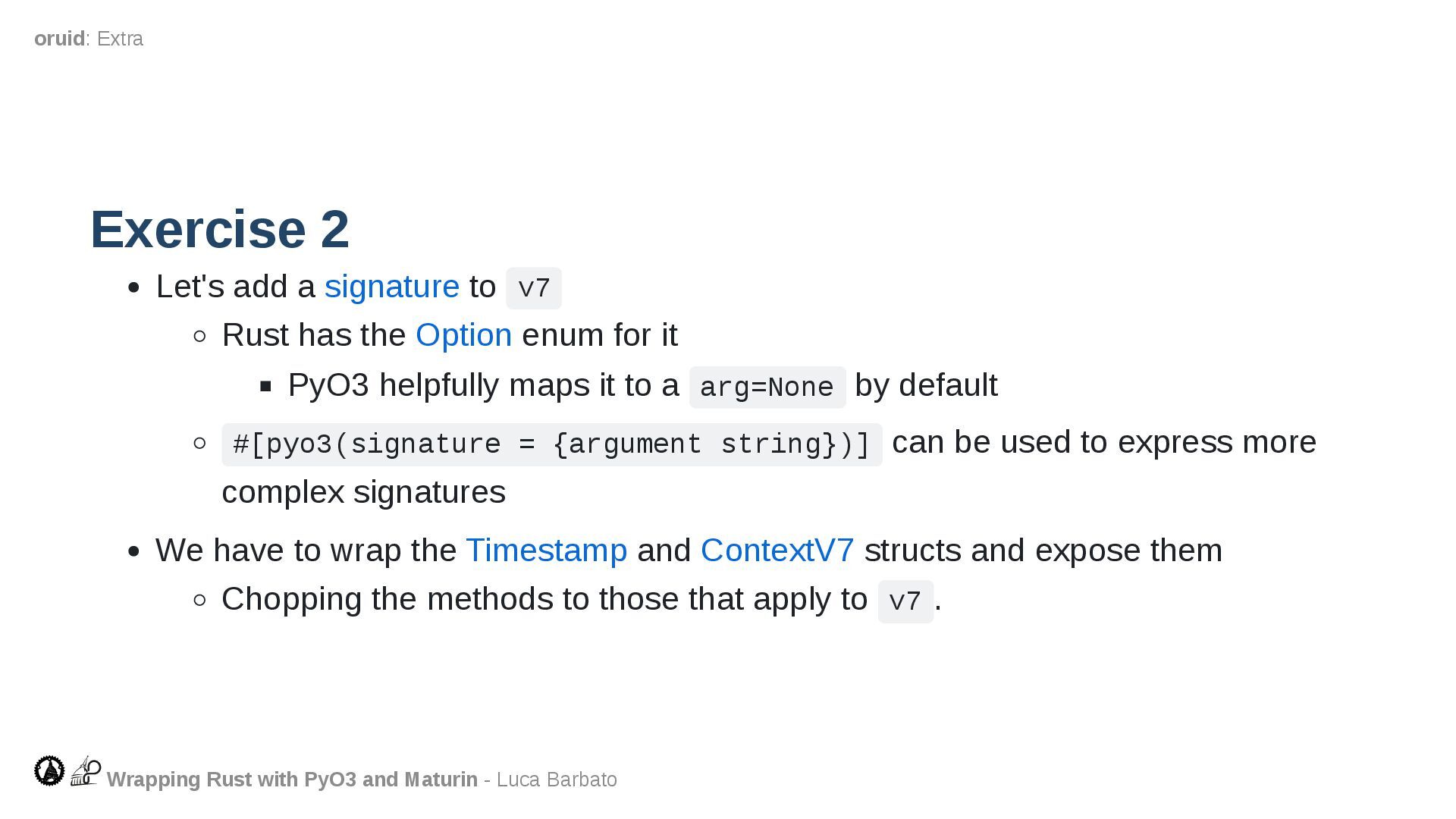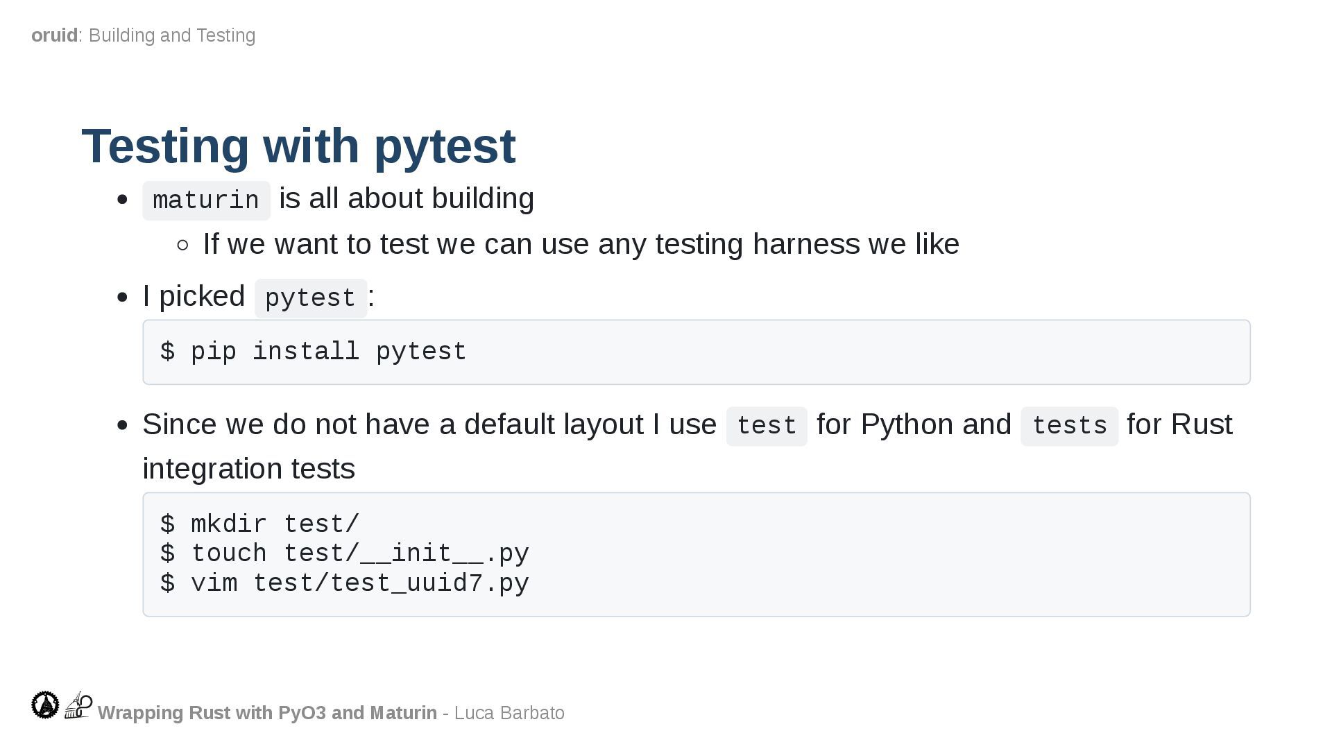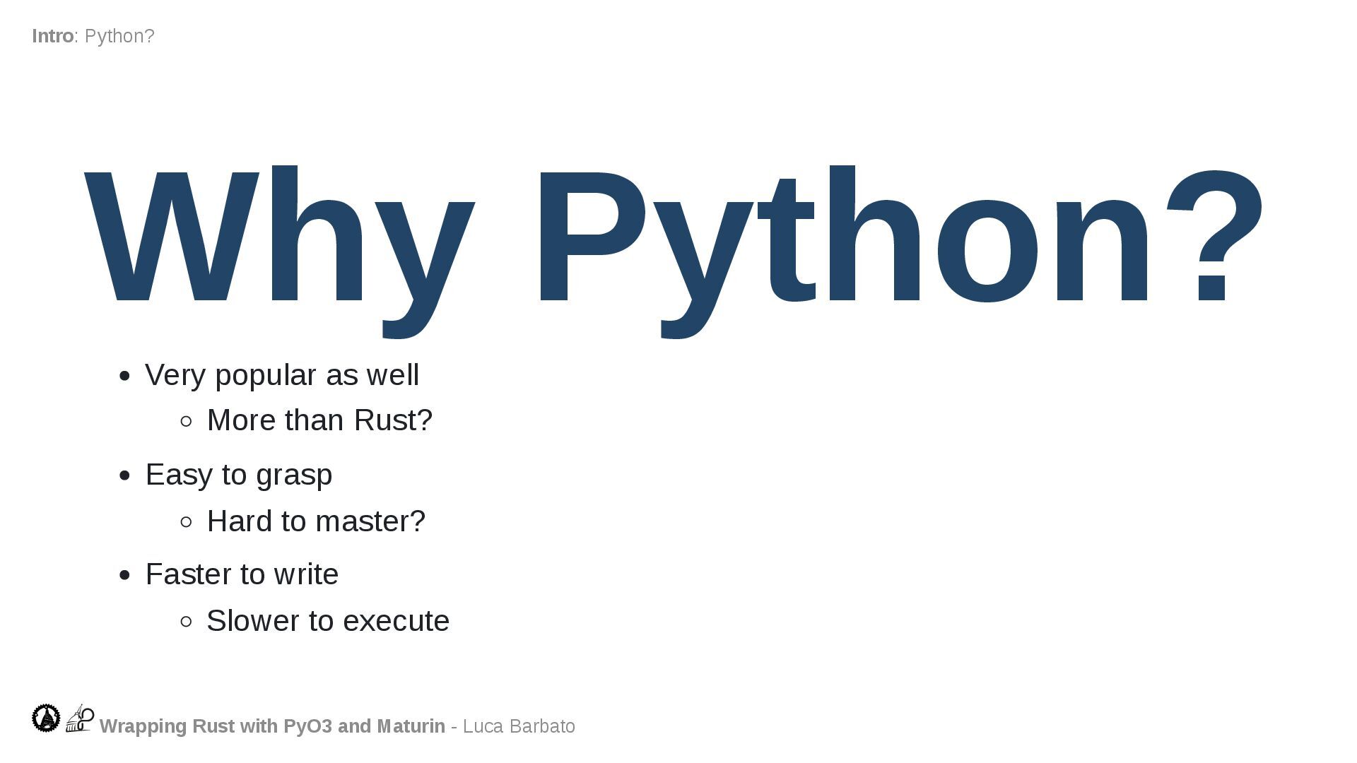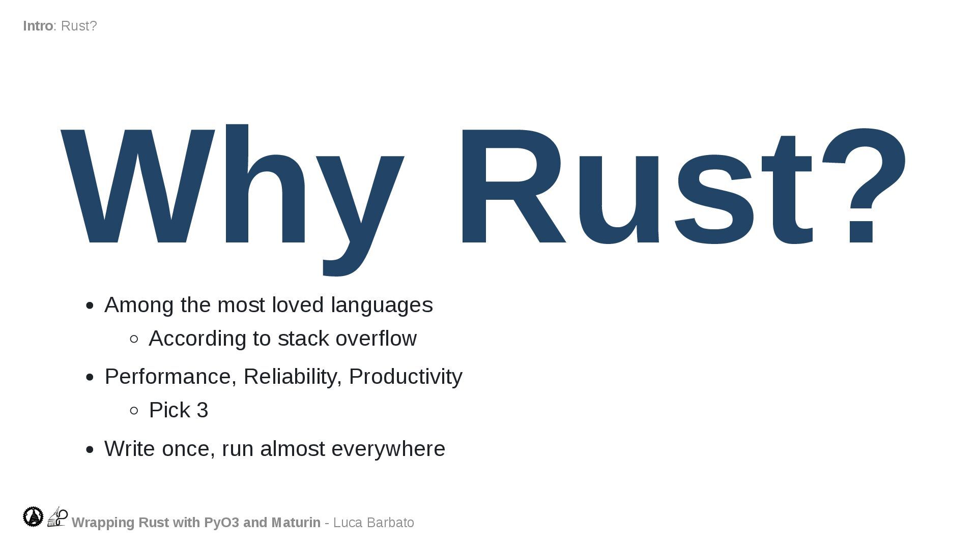Successivamente, esploreremo insieme alcuni esempi pratici di come utilizzare queste librerie per avvolgere le nostre rust crate in pacchetti Python. Infine, cercheremo un piccolo crate che possa essere utile da avvolgere e proveremo a farlo insieme durante il workshop.
