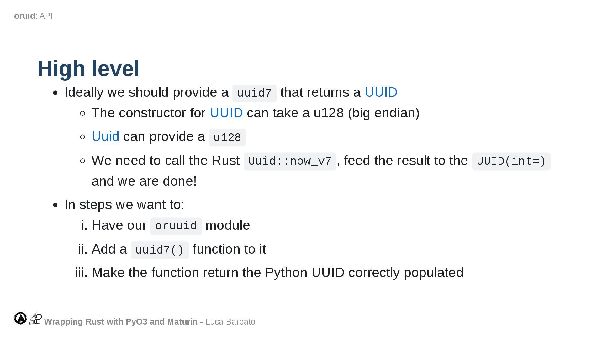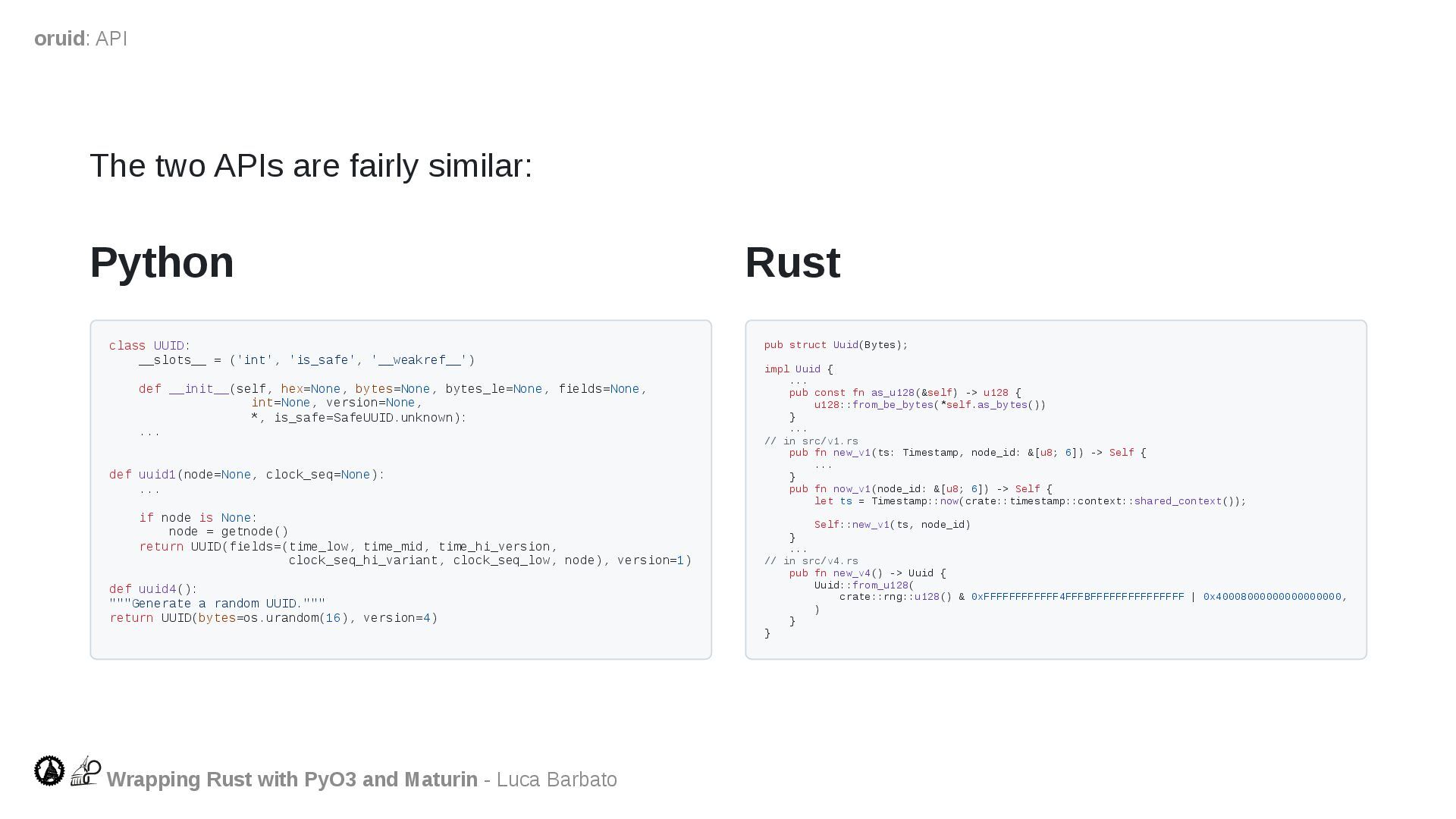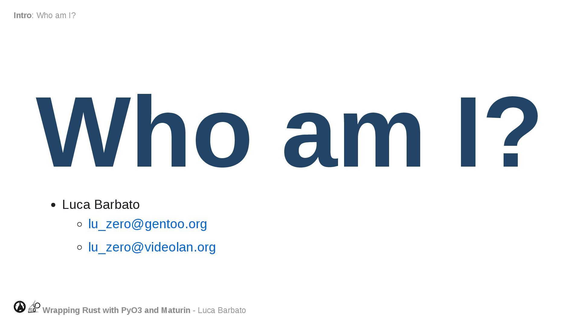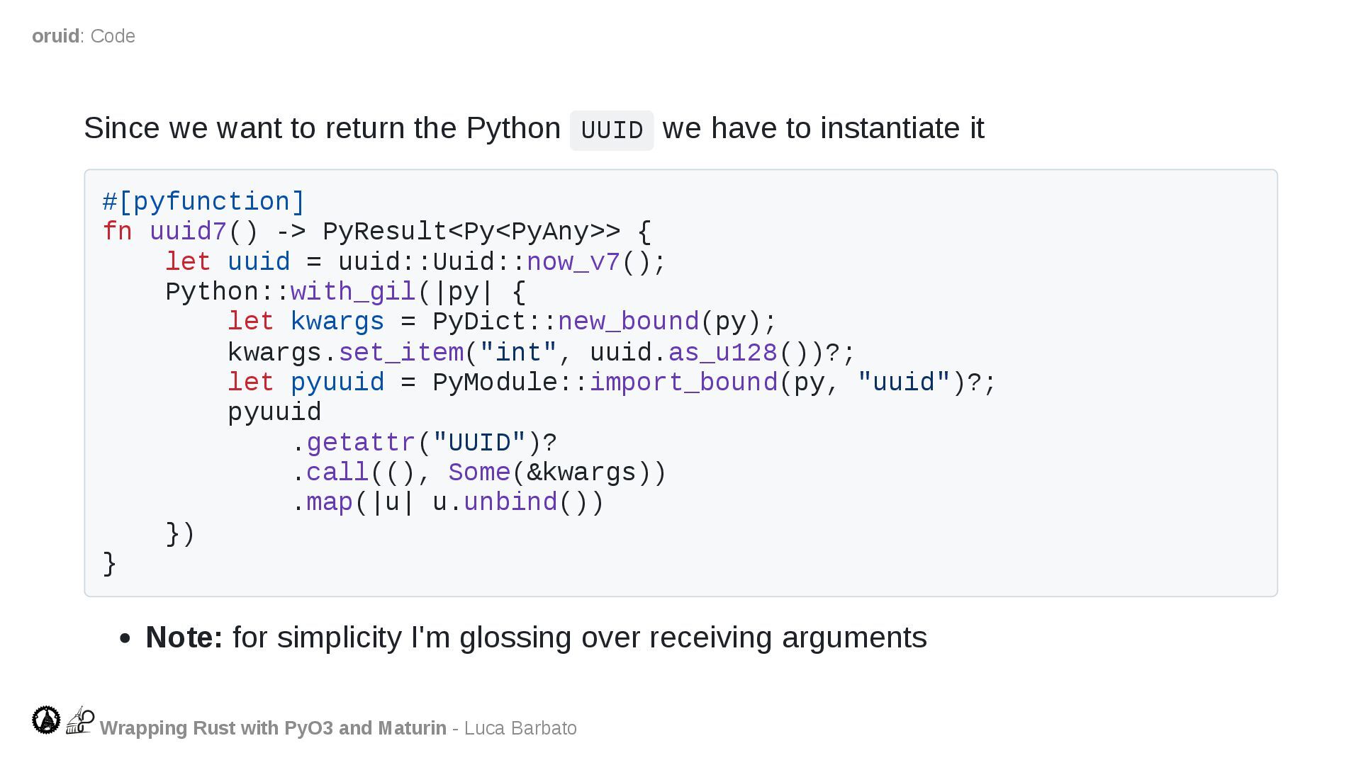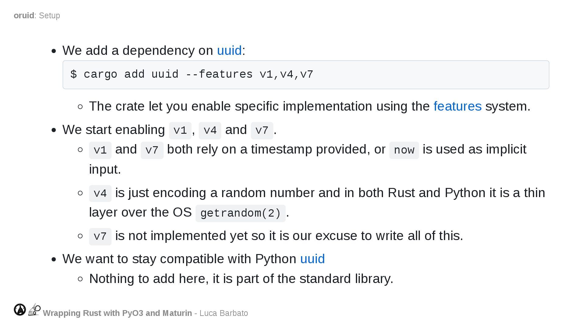 Successivamente, esploreremo insieme alcuni esempi pratici di come utilizzare queste librerie per avvolgere le nostre rust crate in pacchetti Python. Infine, cercheremo un piccolo crate che possa essere utile da avvolgere e proveremo a farlo insieme durante il workshop.