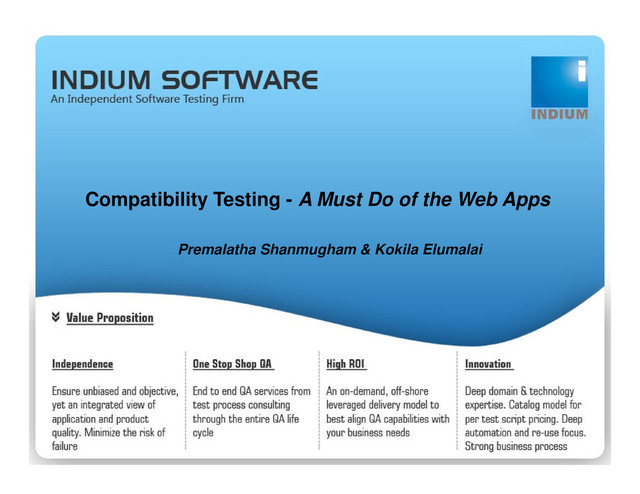Premalatha, Project Manager at Indium Software (India) Ltd., comes with 8 years of experience in the IT industry focusing on software testing and managing delivery. She holds anM.Phil in Computer Science and has experience in education and life sciences domain. This expertise in compatibility testing comes from managing the compatibility testing project management and delivery for many years.