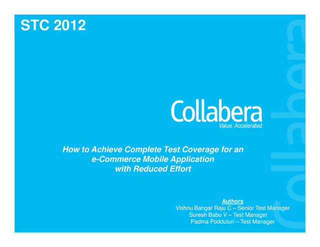 Padma Podduturi is a Test Manager with Collabera in Mobile Testing COE. She has 8 years of experience in the IT industry. Her areas of interest are predominantly in Automation, Performance and Mobile application testing spanning across domains including Financial Services and E-commerce.