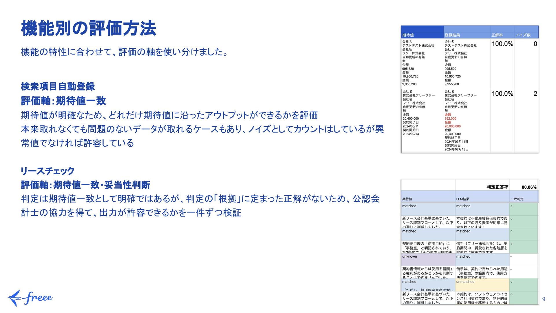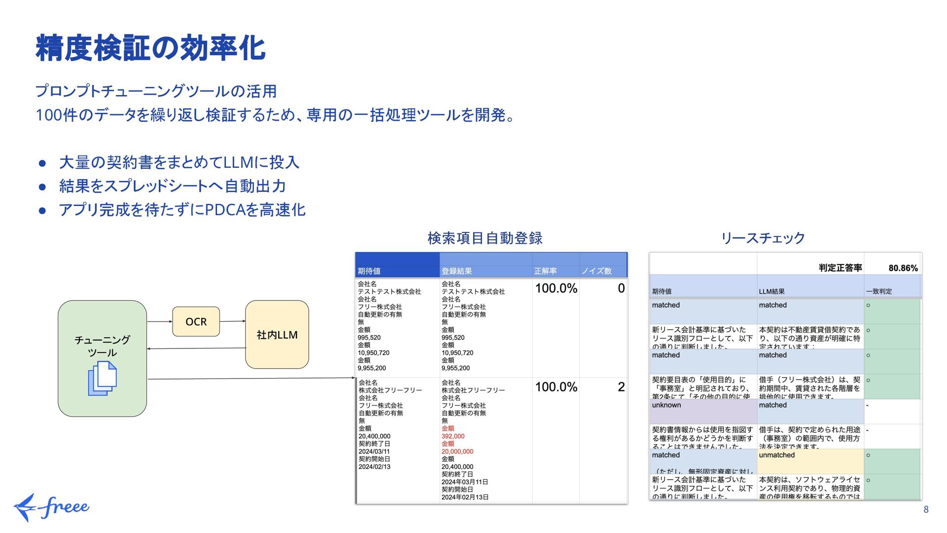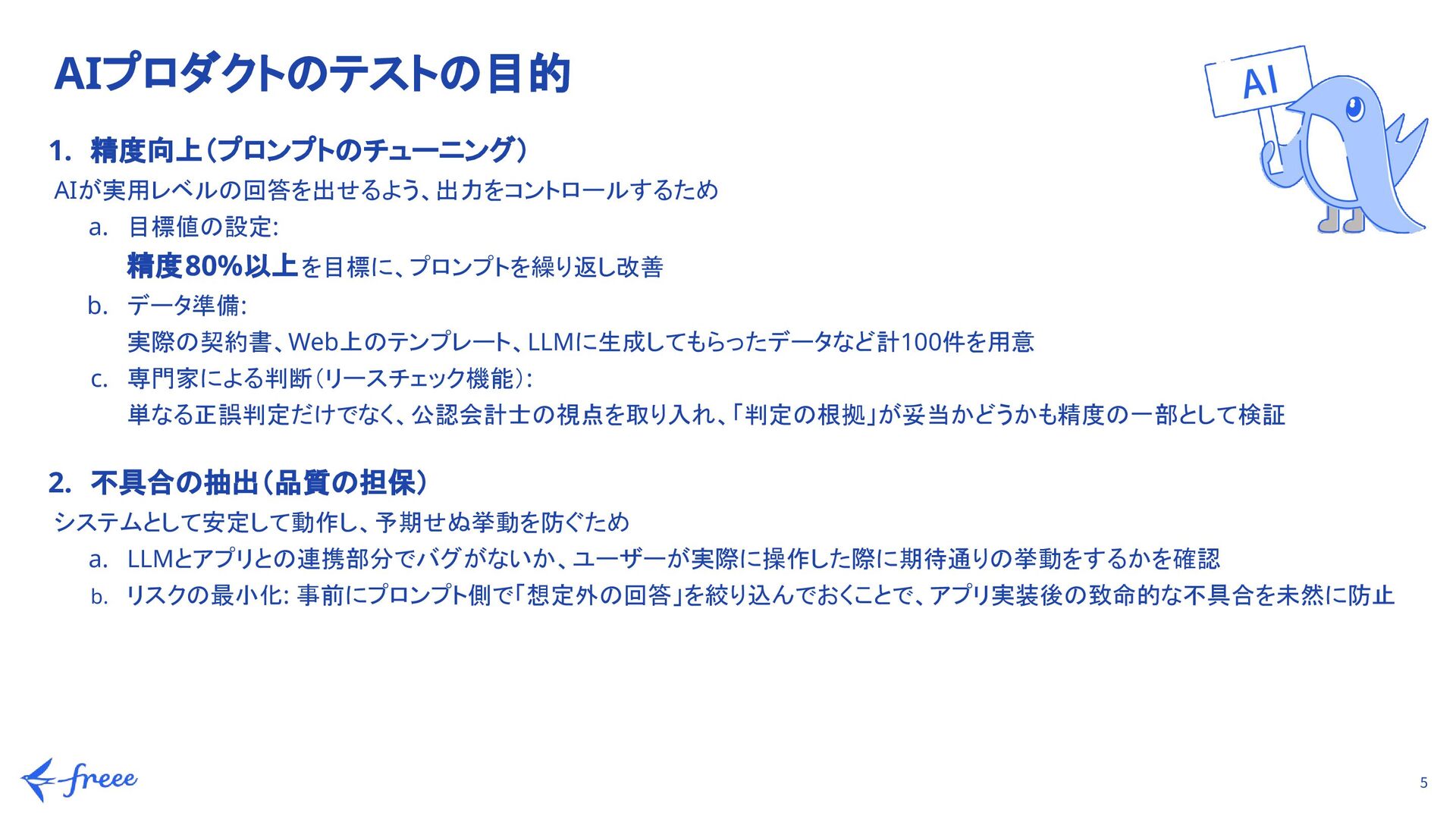 精度80%以上を目標に、プロンプトを繰り返し改善 b. データ準備: 実際の契約書、Web上のテンプレート、LLMに生成してもらったデータなど計100件を用意 c. 専門家による判断(リースチェック機能): 単なる正誤判定だけでなく、公認会計士の視点を取り入れ、「判定の根拠」が妥当かどうかも精度の一部として検証 2. 不具合の抽出(品質の担保) システムとして安定して動作し、予期せぬ挙動を防ぐため a. LLMとアプリとの連携部分でバグがないか、ユーザーが実際に操作した際に期待通りの挙動をするかを確認 b. リスクの最小化: 事前にプロンプト側で「想定外の回答」を絞り込んでおくことで、アプリ実装後の致命的な不具合を未然に防止