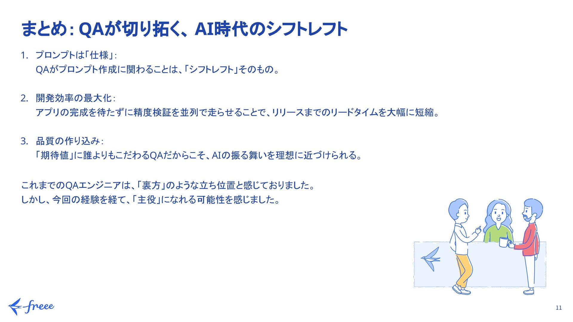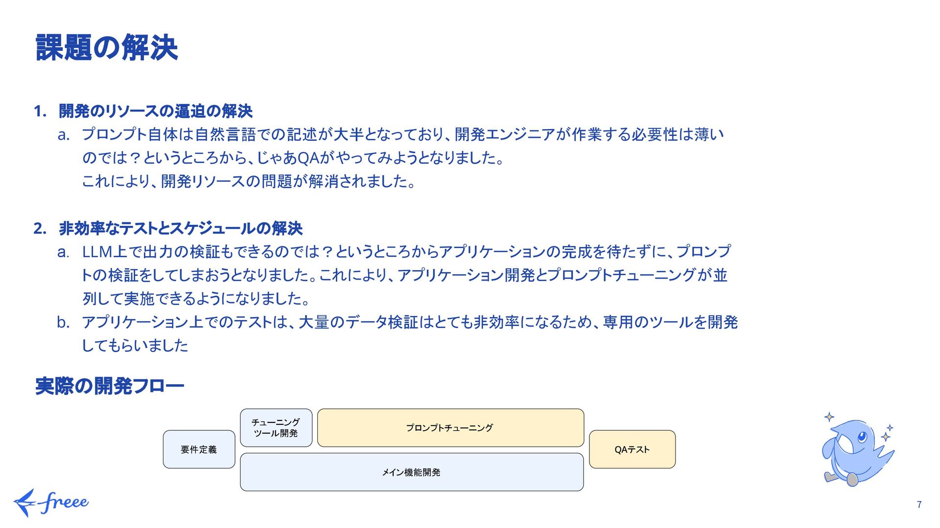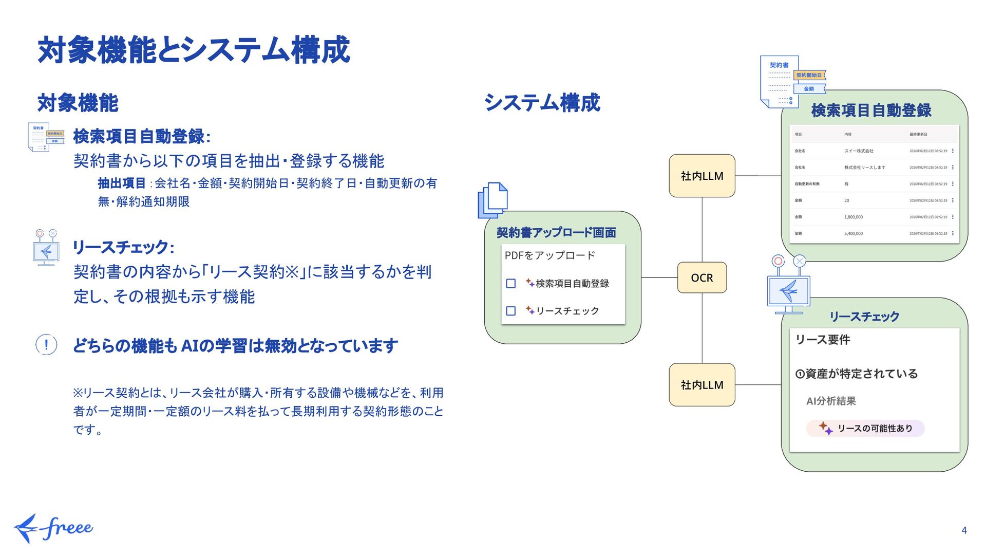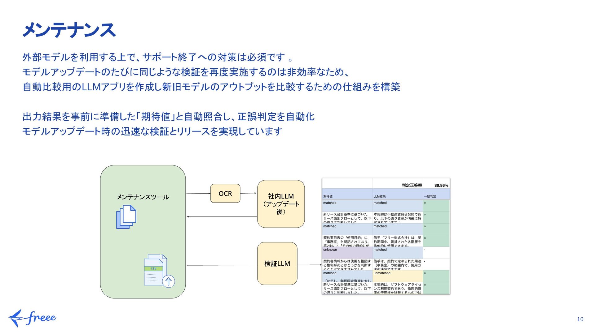 精度80%以上を目標に、プロンプトを繰り返し改善 b. データ準備: 実際の契約書、Web上のテンプレート、LLMに生成してもらったデータなど計100件を用意 c. 専門家による判断(リースチェック機能): 単なる正誤判定だけでなく、公認会計士の視点を取り入れ、「判定の根拠」が妥当かどうかも精度の一部として検証 2. 不具合の抽出(品質の担保) システムとして安定して動作し、予期せぬ挙動を防ぐため a. LLMとアプリとの連携部分でバグがないか、ユーザーが実際に操作した際に期待通りの挙動をするかを確認 b. リスクの最小化: 事前にプロンプト側で「想定外の回答」を絞り込んでおくことで、アプリ実装後の致命的な不具合を未然に防止