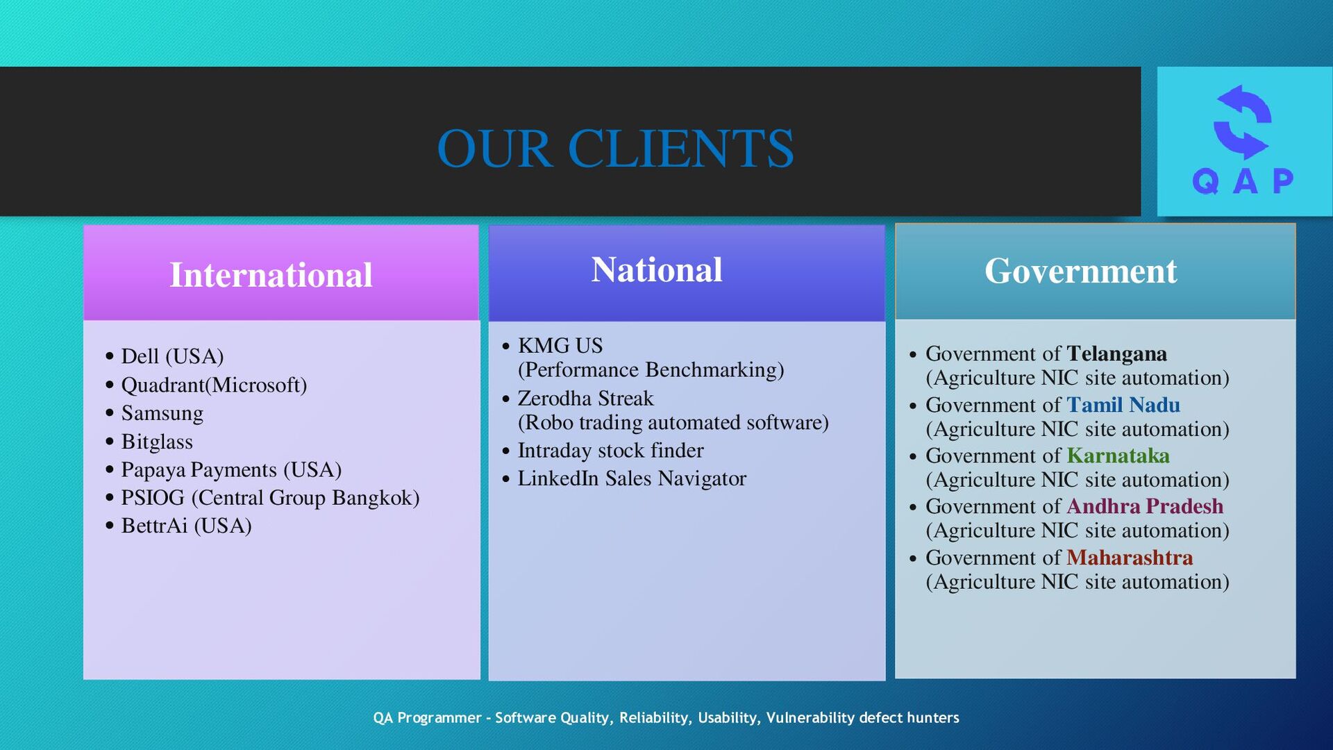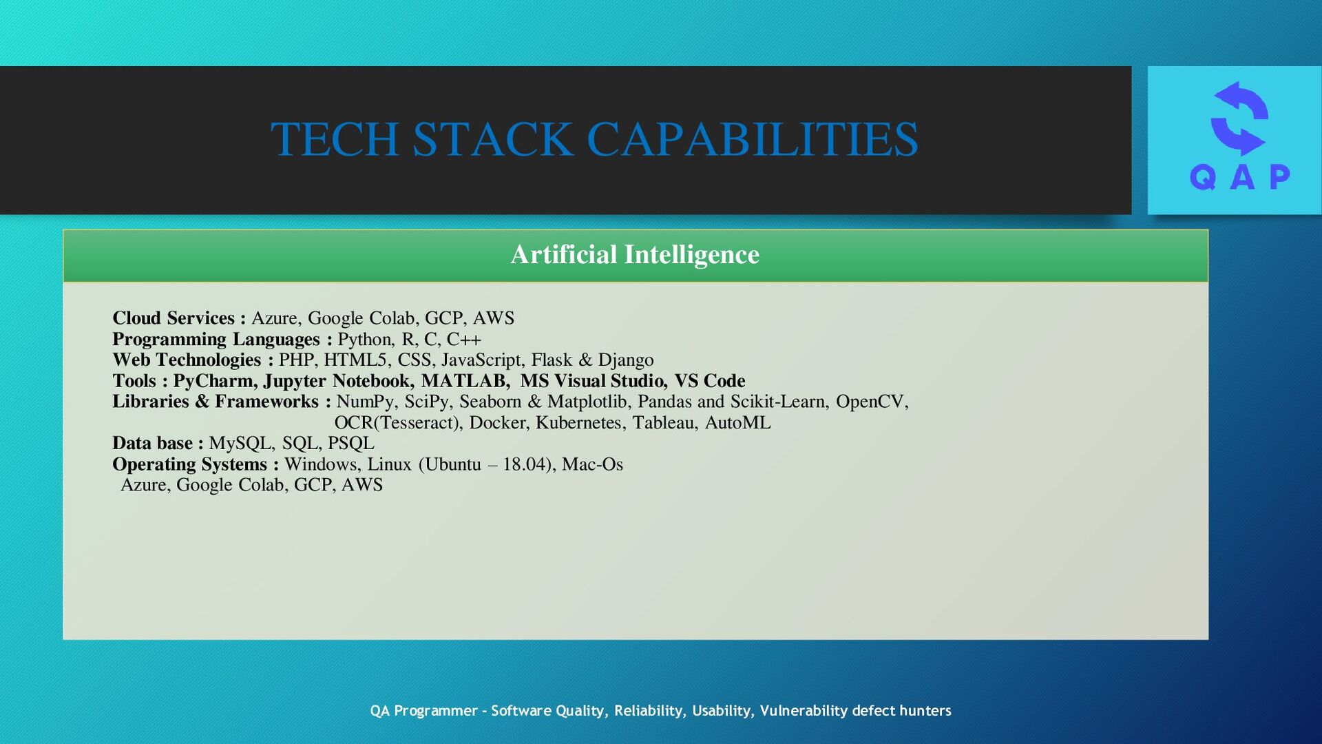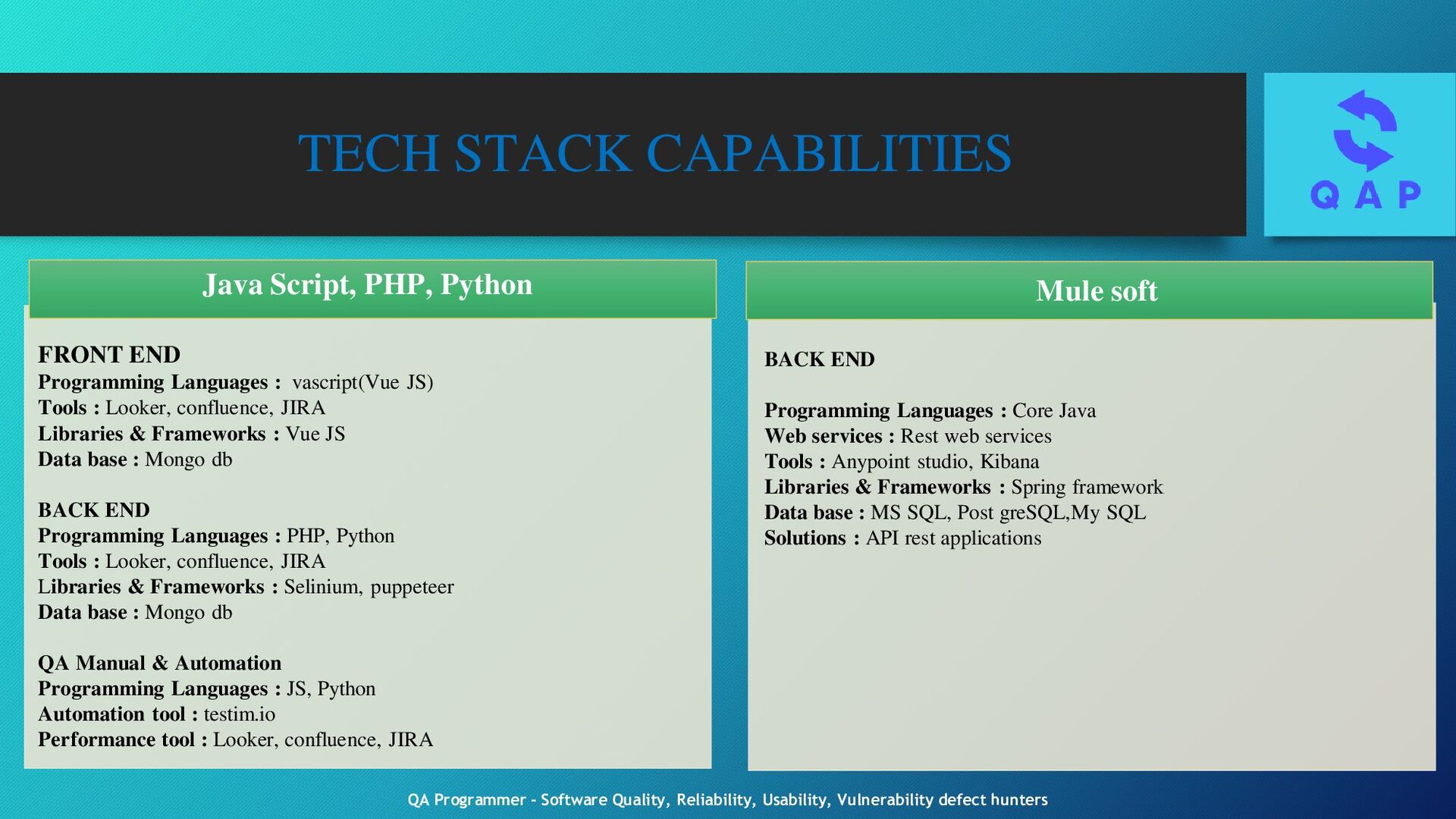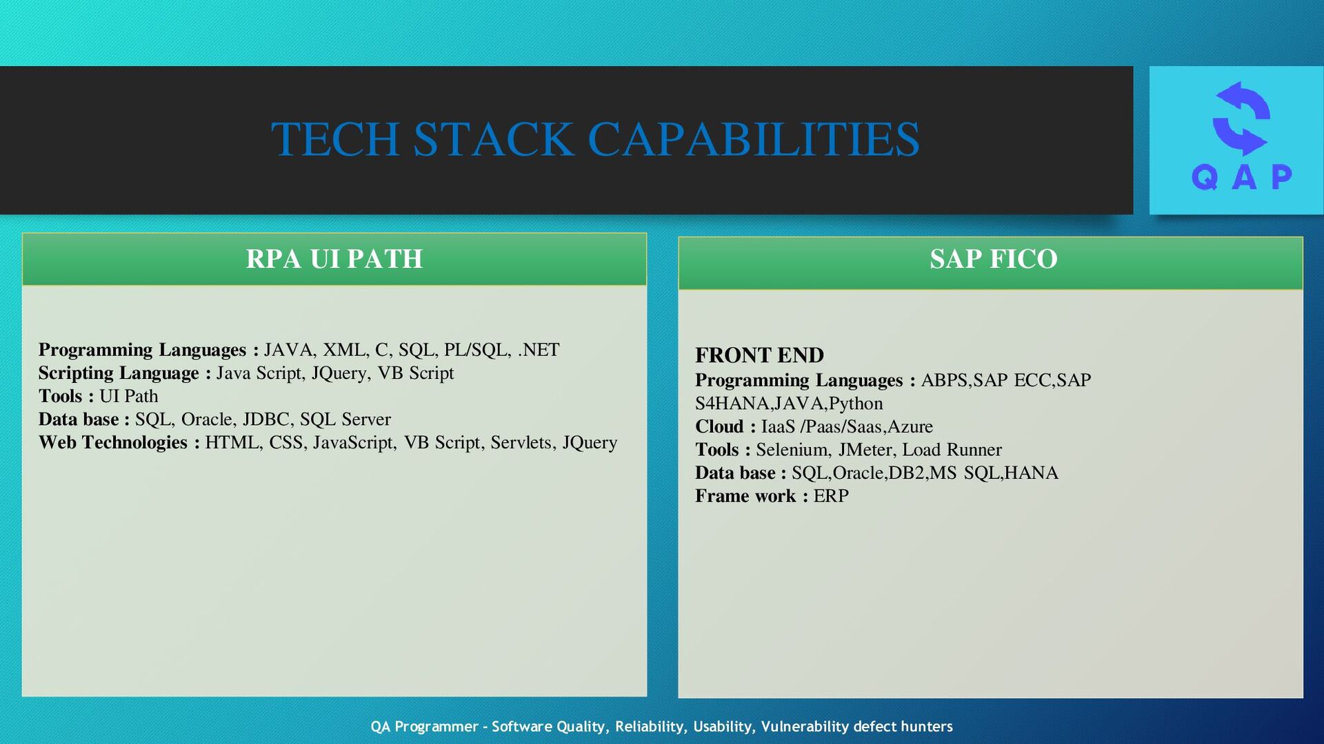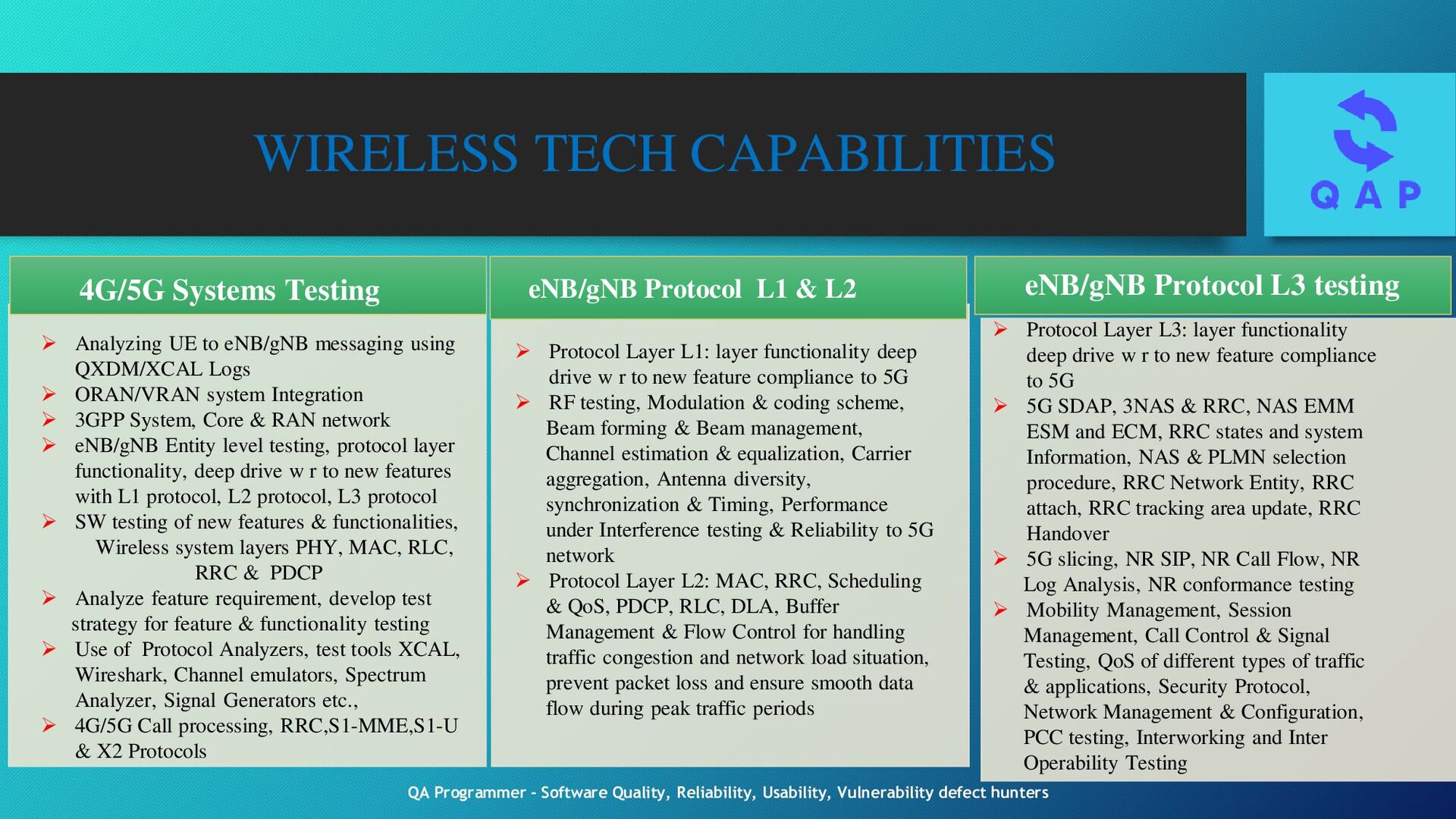 Testing eNB/gNB Protocol L3 testing Analyzing UE to eNB/gNB messaging using QXDM/XCAL Logs ORAN/VRAN system Integration 3GPP System, Core & RAN network eNB/gNB Entity level testing, protocol layer functionality, deep drive w r to new features with L1 protocol, L2 protocol, L3 protocol SW testing of new features & functionalities, Wireless system layers PHY, MAC, RLC, RRC & PDCP Analyze feature requirement, develop test strategy for feature & functionality testing Use of Protocol Analyzers, test tools XCAL, Wireshark, Channel emulators, Spectrum Analyzer, Signal Generators etc., 4G/5G Call processing, RRC,S1-MME,S1-U & X2 Protocols Protocol Layer L1: layer functionality deep drive w r to new feature compliance to 5G RF testing, Modulation & coding scheme, Beam forming & Beam management, Channel estimation & equalization, Carrier aggregation, Antenna diversity, synchronization & Timing, Performance under Interference testing & Reliability to 5G network Protocol Layer L2: MAC, RRC, Scheduling & QoS, PDCP, RLC, DLA, Buffer Management & Flow Control for handling traffic congestion and network load situation, prevent packet loss and ensure smooth data flow during peak traffic periods Protocol Layer L3: layer functionality deep drive w r to new feature compliance to 5G 5G SDAP, 3NAS & RRC, NAS EMM ESM and ECM, RRC states and system Information, NAS & PLMN selection procedure, RRC Network Entity, RRC attach, RRC tracking area update, RRC Handover 5G slicing, NR SIP, NR Call Flow, NR Log Analysis, NR conformance testing Mobility Management, Session Management, Call Control & Signal Testing, QoS of different types of traffic & applications, Security Protocol, Network Management & Configuration, PCC testing, Interworking and Inter Operability Testing QA Programmer - Software Quality, Reliability, Usability, Vulnerability defect hunters