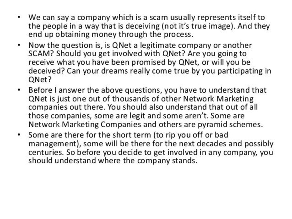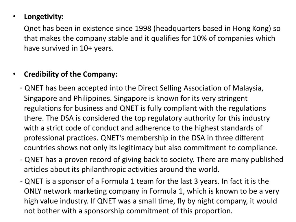 based in Hong Kong) so that makes the company stable and it qualifies for 10% of companies which have survived in 10+ years. • Credibility of the Company: - QNET has been accepted into the Direct Selling Association of Malaysia, Singapore and Philippines. Singapore is known for its very stringent regulations for business and QNET is fully compliant with the regulations there. The DSA is considered the top regulatory authority for this industry with a strict code of conduct and adherence to the highest standards of professional practices. QNET's membership in the DSA in three different countries shows not only its legitimacy but also commitment to compliance. - QNET has a proven record of giving back to society. There are many published articles about its philanthropic activities around the world. - QNET is a sponsor of a Formula 1 team for the last 3 years. In fact it is the ONLY network marketing company in Formula 1, which is known to be a very high value industry. If QNET was a small time, fly by night company, it would not bother with a sponsorship commitment of this proportion.