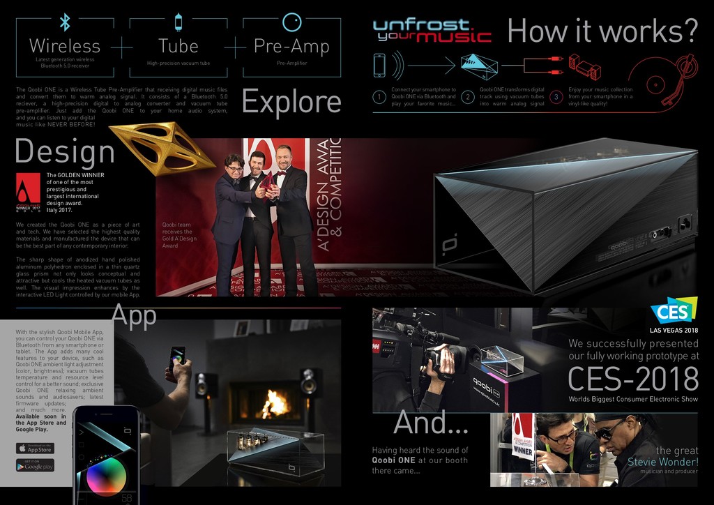 you make Amazon a successful marketplace…” “…It was great to meet you at CES and see your demo. The product does look premium, and unique…” “…First of all, it's absolutely stunning and on a museum level of design…” “…we are very keen to progress and are very interested in your product. In fact… WE LOVE YOUR PRODUCT!” “…Big kudos on the design of the product - super impressive…” “…I really liked you product Qoobi ONE at the CES…” Created in partnership with Qoobi uses authentic Sovtek tubes. Sovtek is a registered trademark of New Sensor Corp. Qoobi B.V. Herenstraat 100, 3431CB Nieuwegein, the Netherlands +31 855 400 155