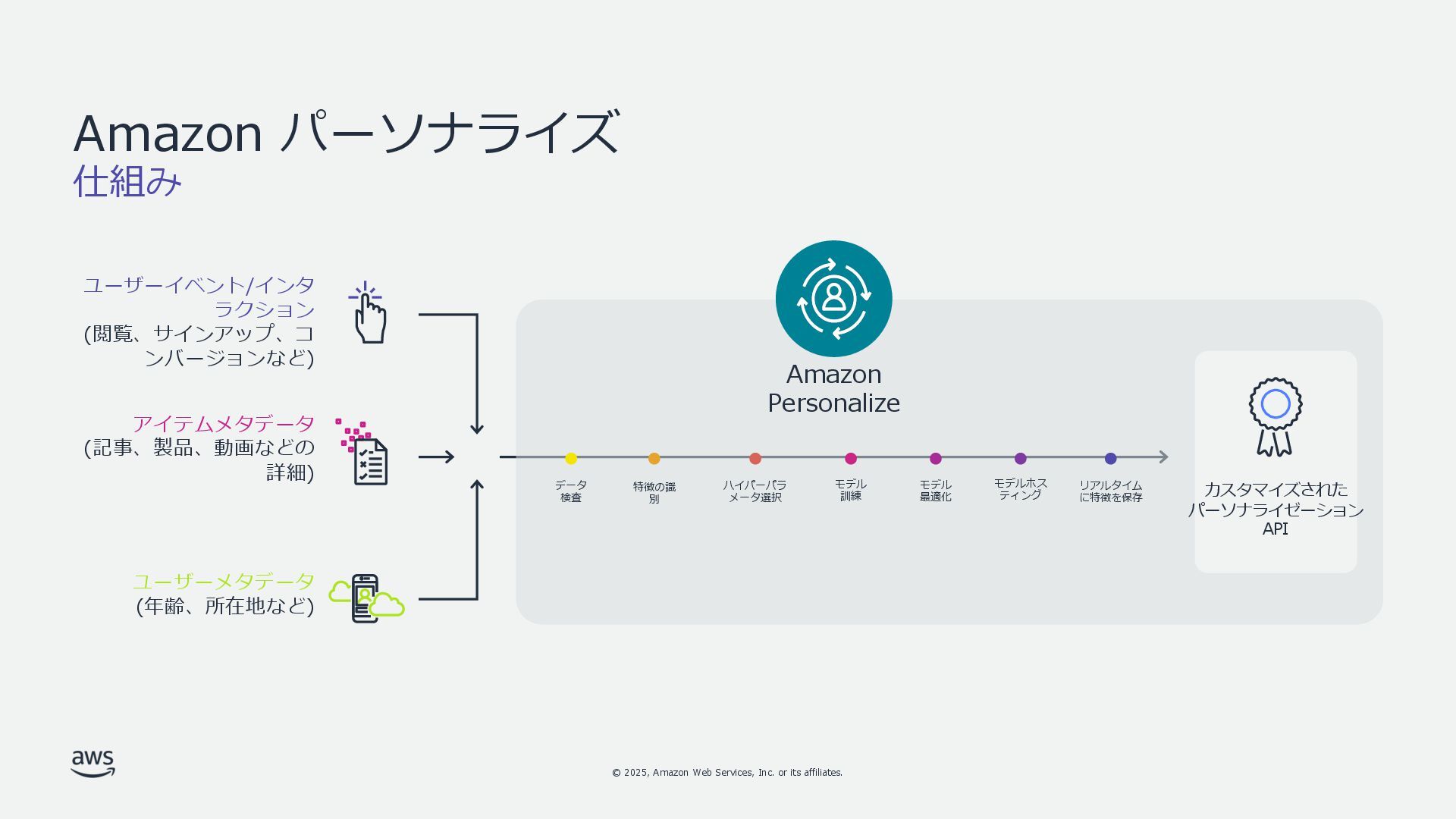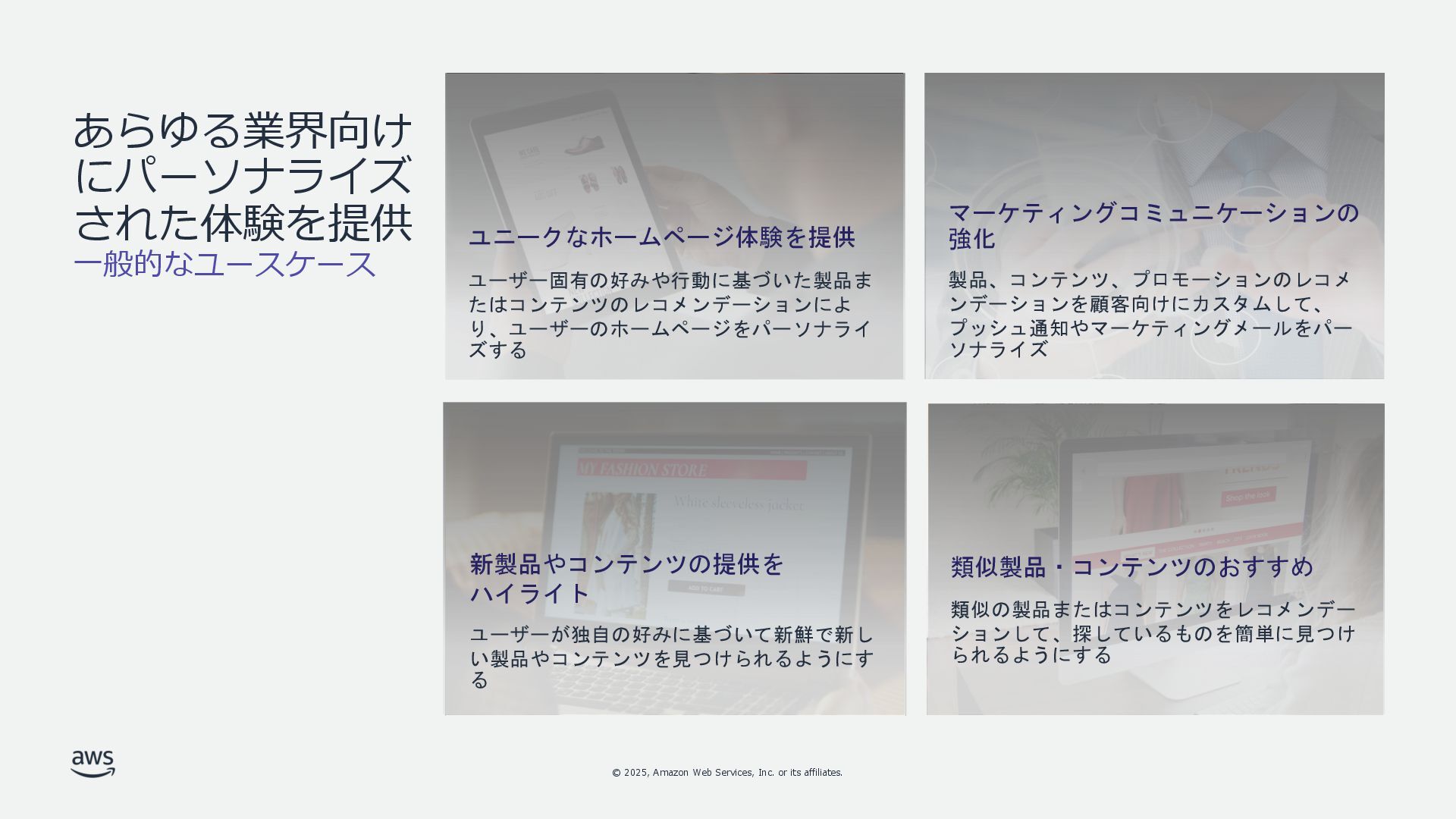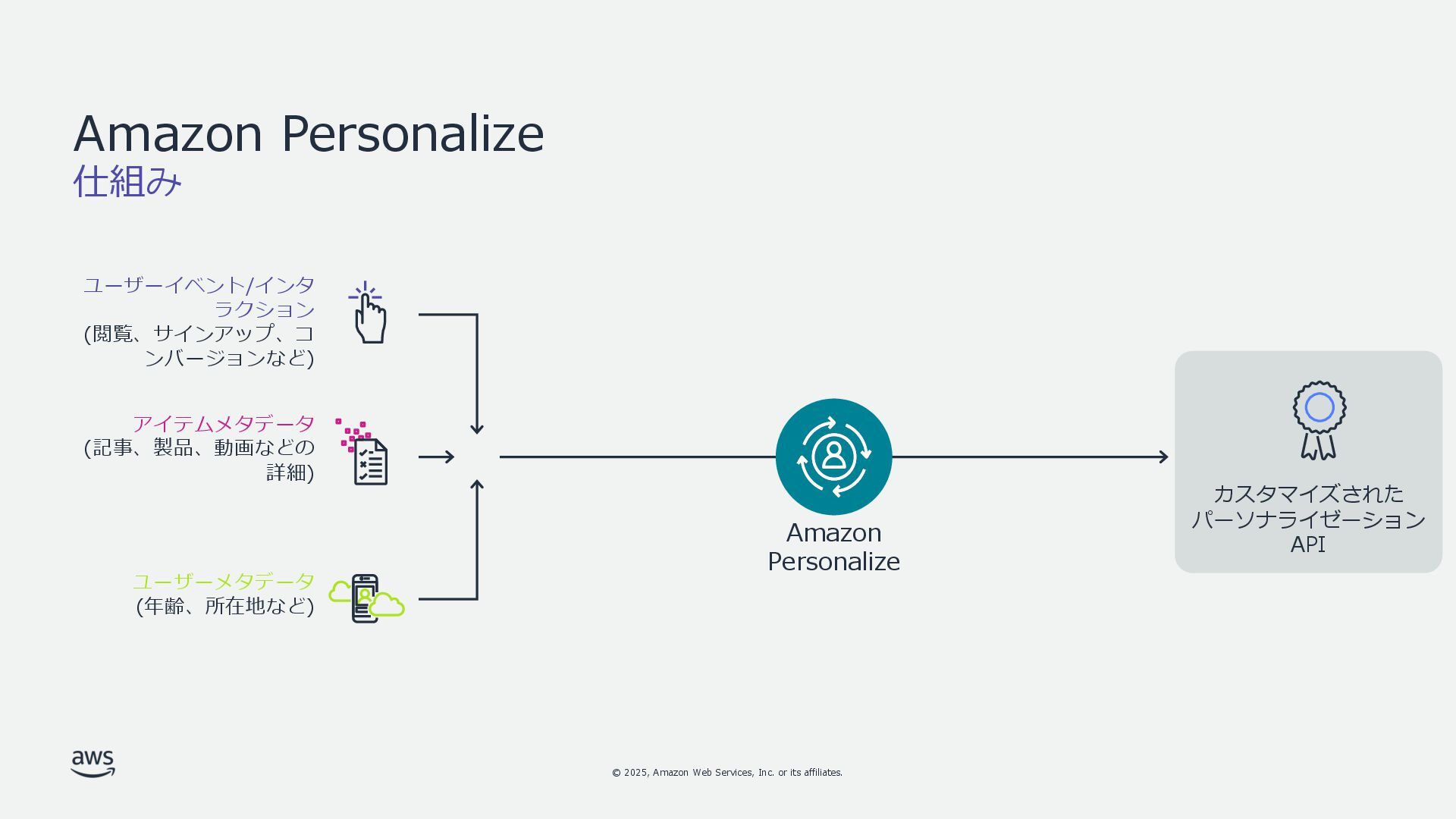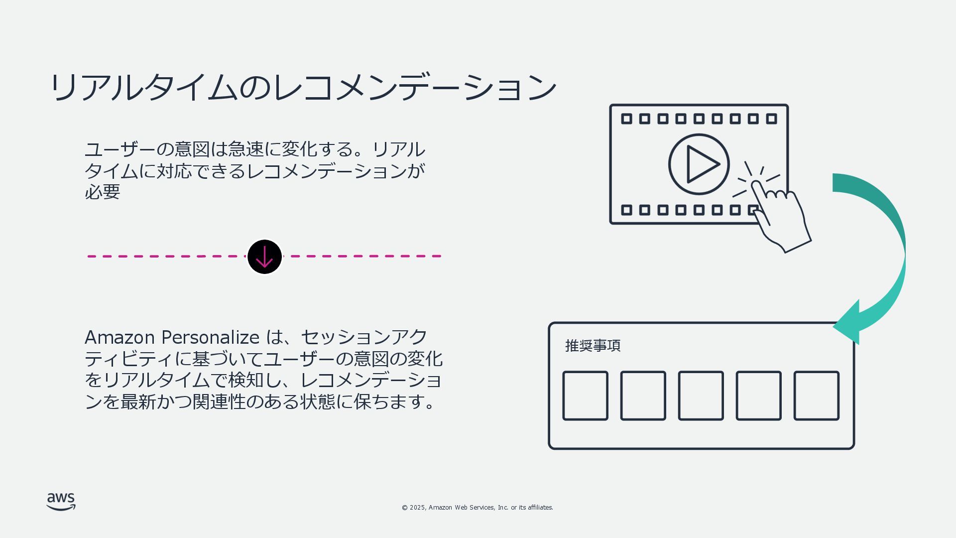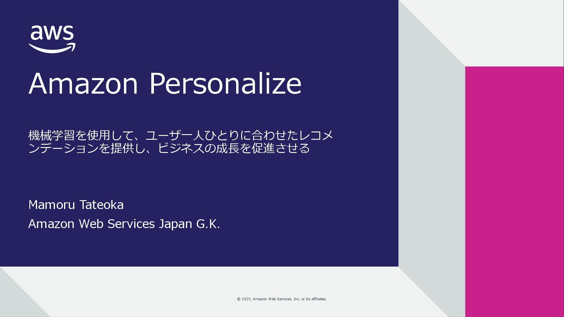 2025, Amazon Web Services, Inc. or its affiliates. Amazon Personalize 機械学習を使⽤して、ユーザ⼀⼈ひとりに合わせたレコメ ンデーションを提供し、ビジネスの成⻑を促進させる Mamoru Tateoka Amazon Web Services Japan G.K.