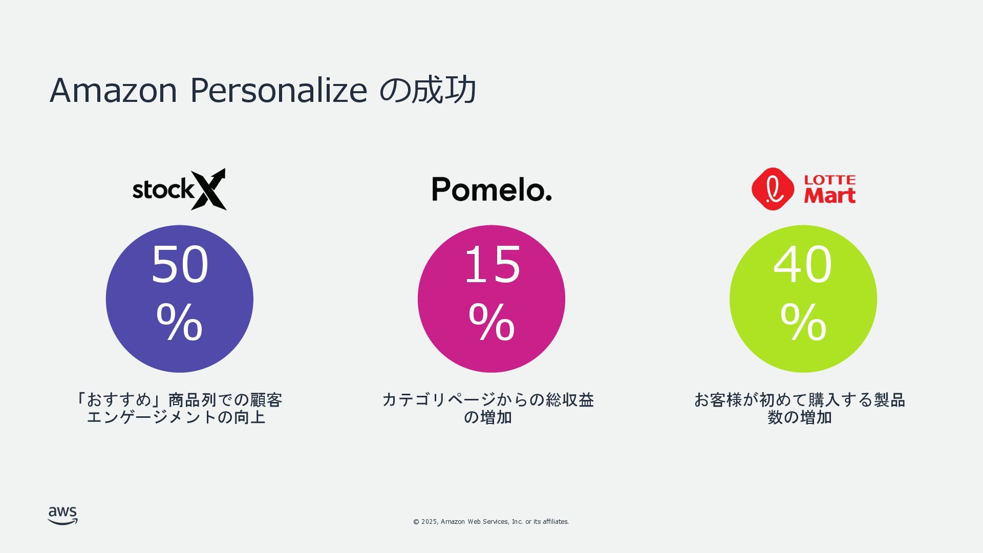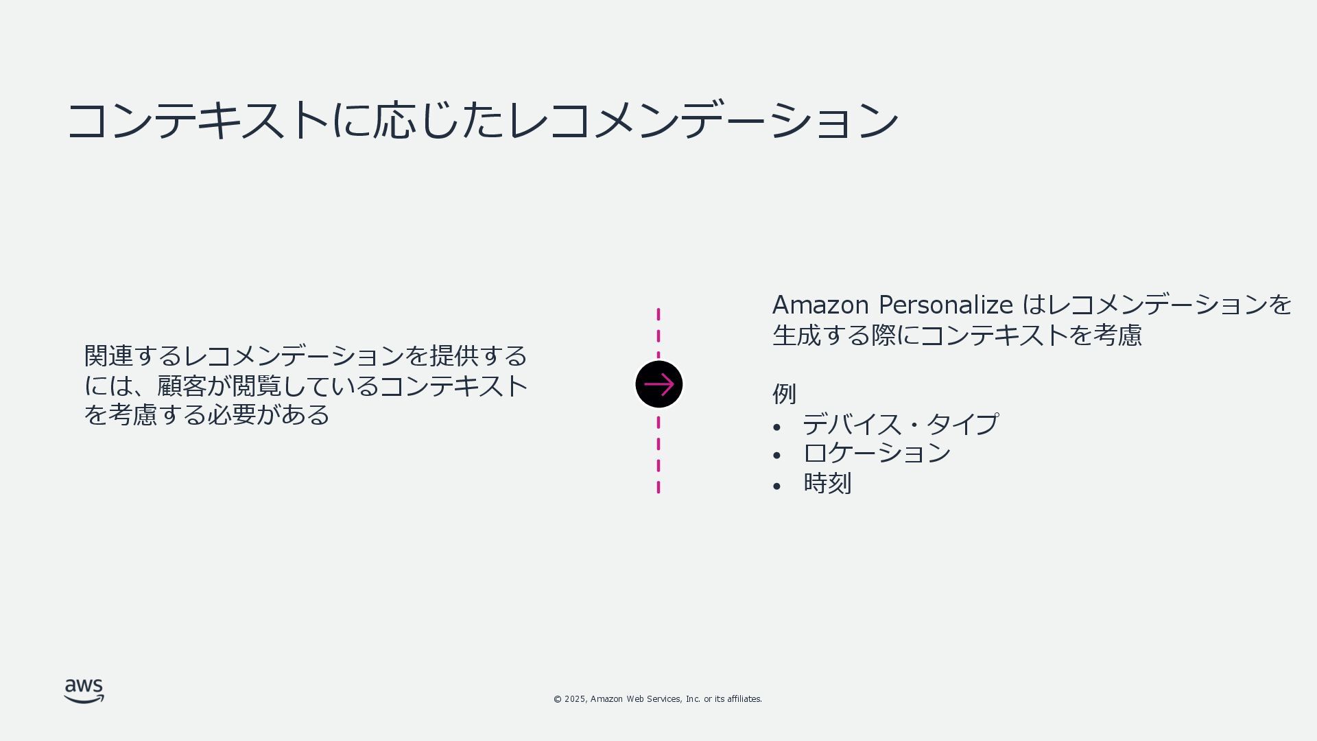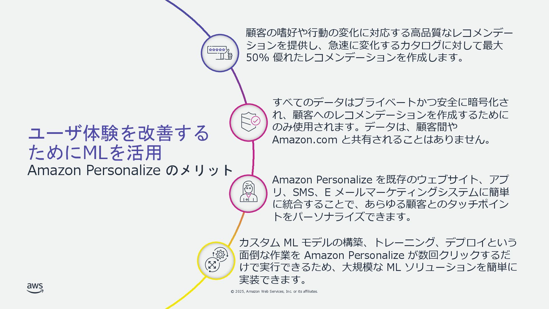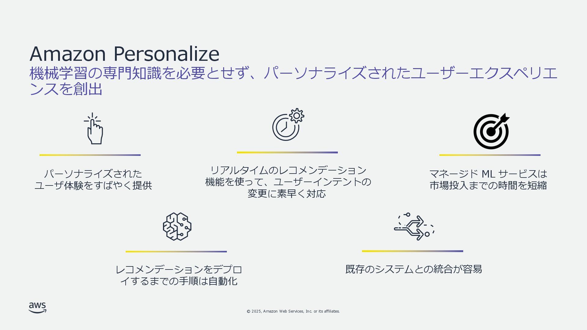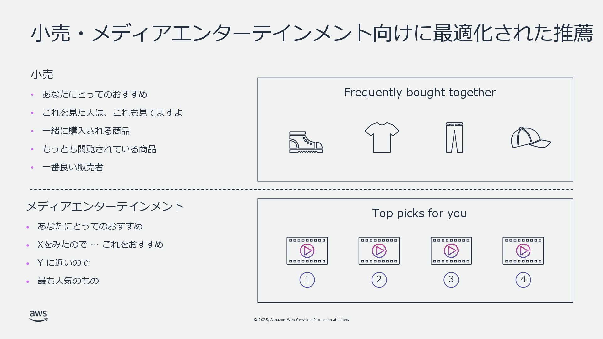 2025, Amazon Web Services, Inc. or its affiliates. Amazon Personalize 機械学習を使⽤して、ユーザ⼀⼈ひとりに合わせたレコメ ンデーションを提供し、ビジネスの成⻑を促進させる Mamoru Tateoka Amazon Web Services Japan G.K.