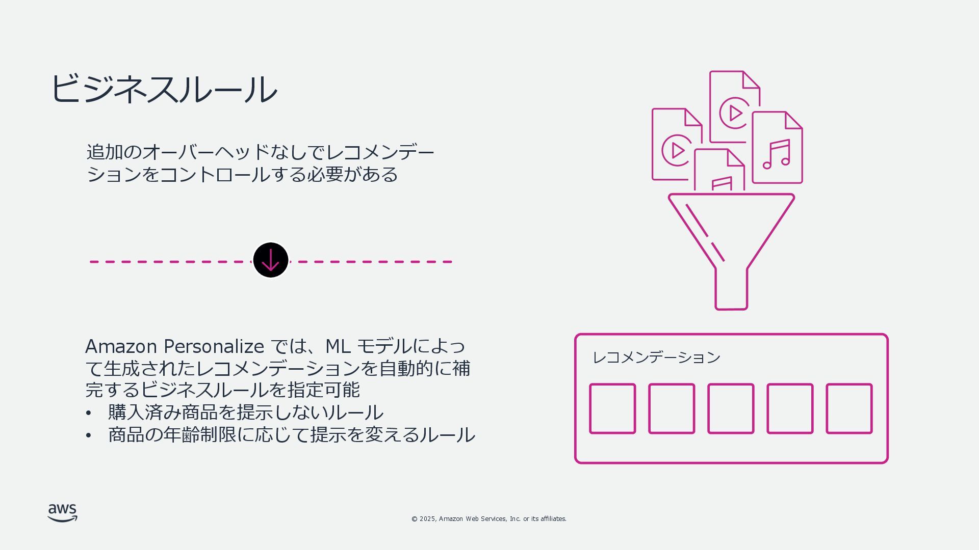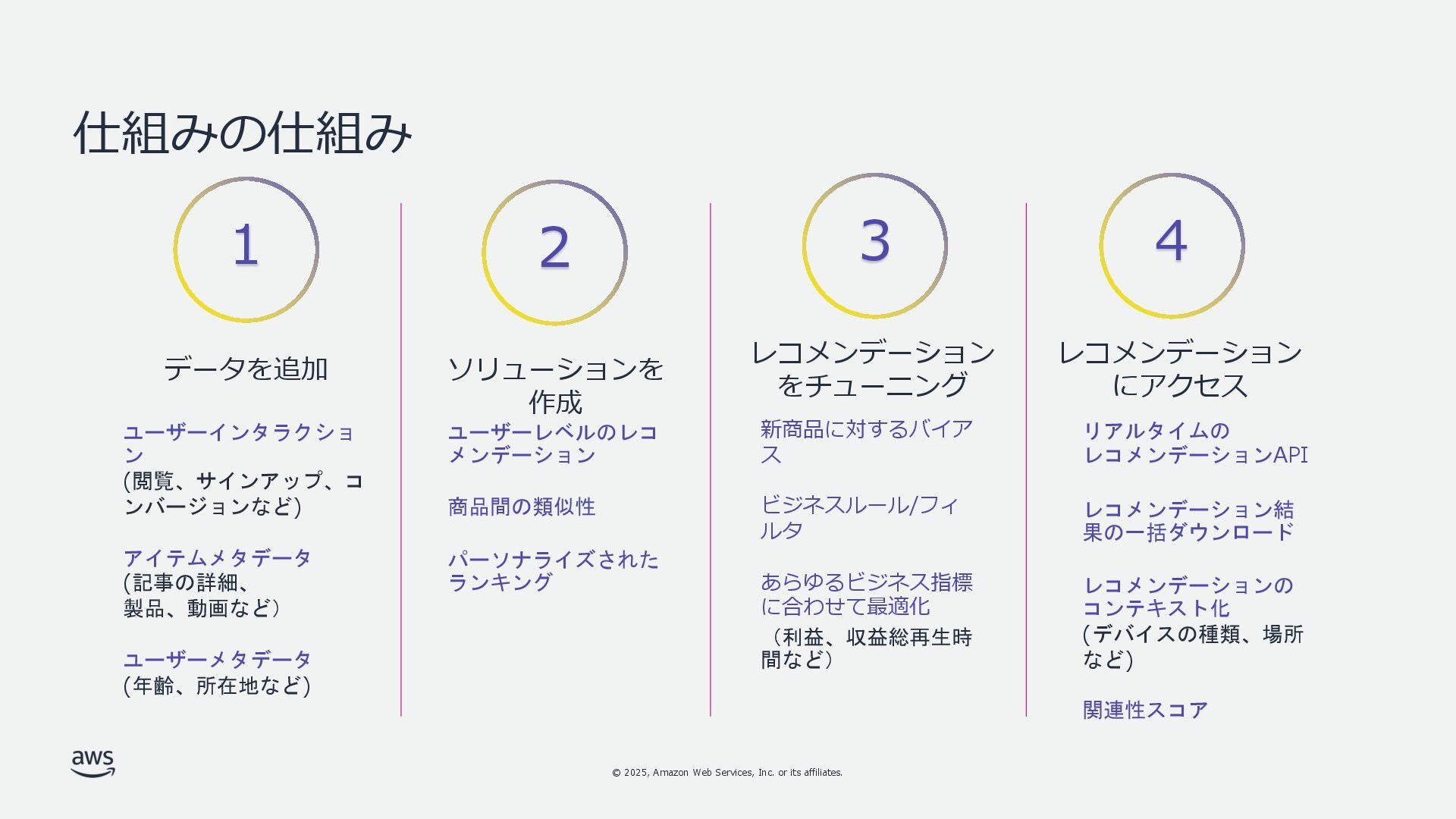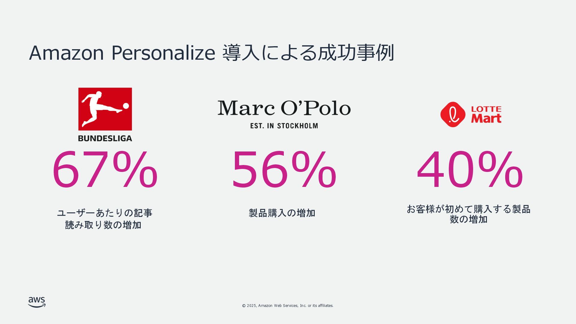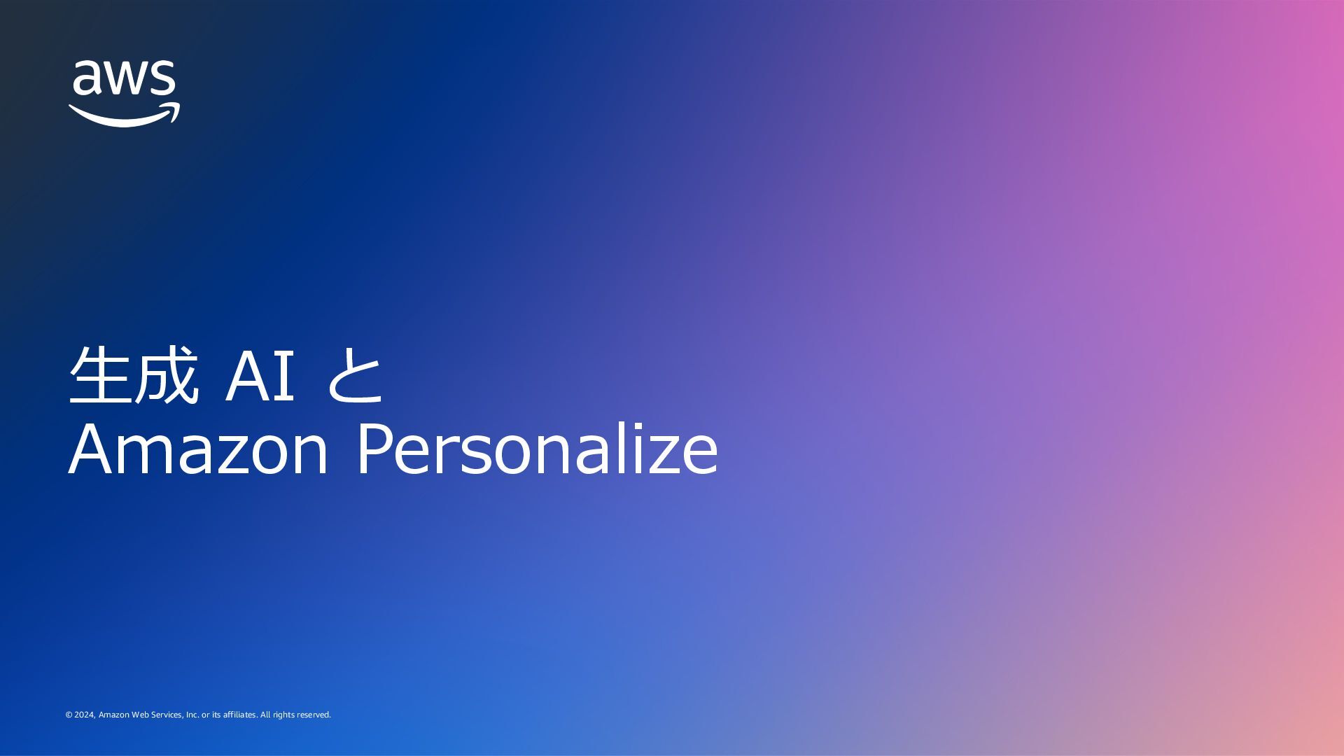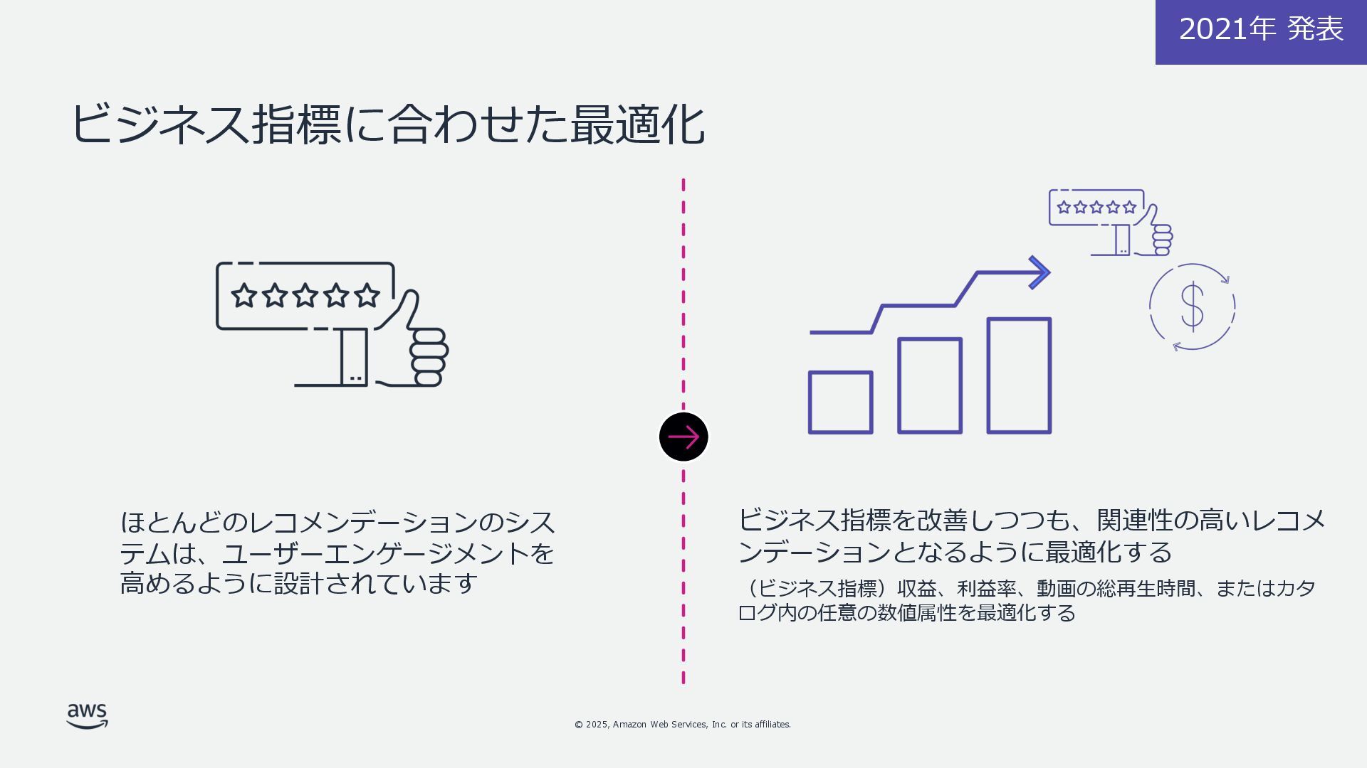 2025, Amazon Web Services, Inc. or its affiliates. Amazon Personalize 機械学習を使⽤して、ユーザ⼀⼈ひとりに合わせたレコメ ンデーションを提供し、ビジネスの成⻑を促進させる Mamoru Tateoka Amazon Web Services Japan G.K.