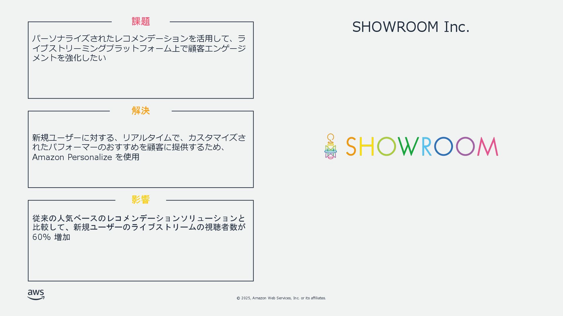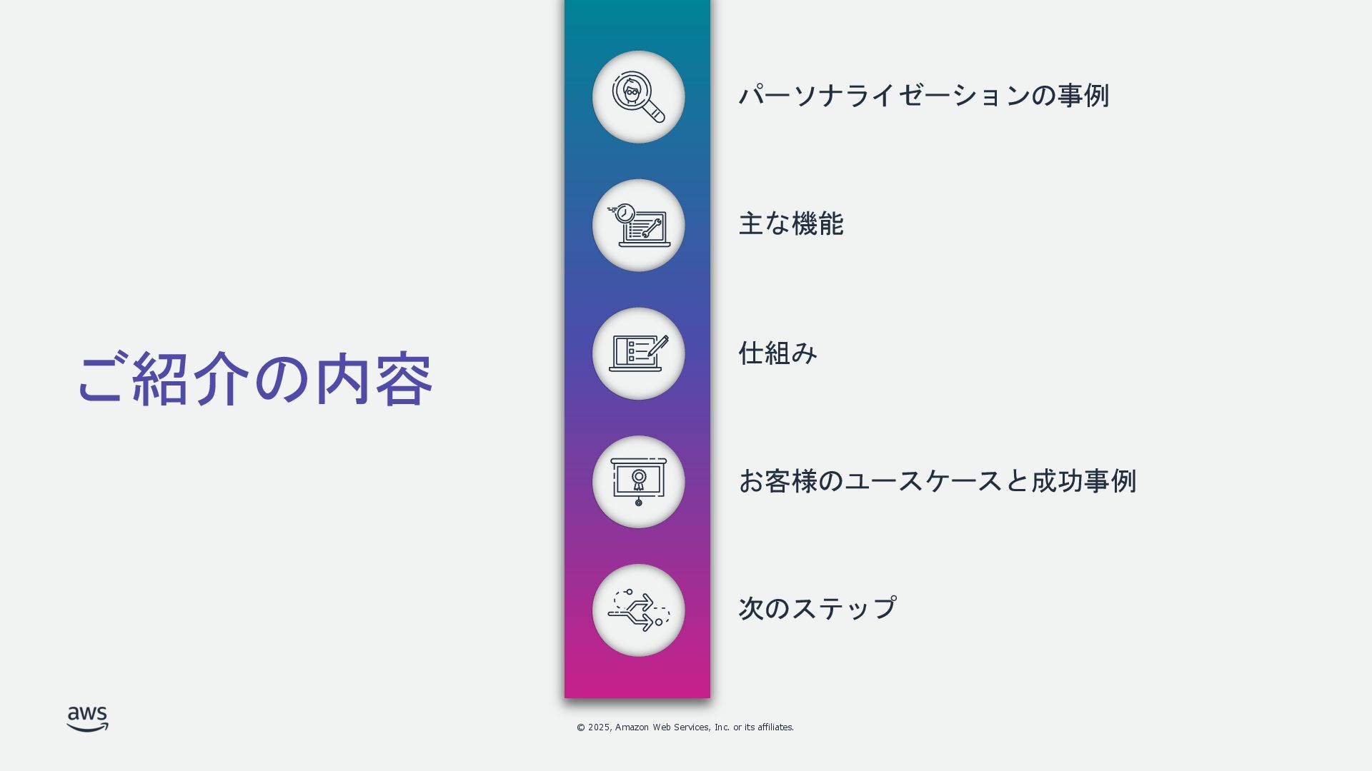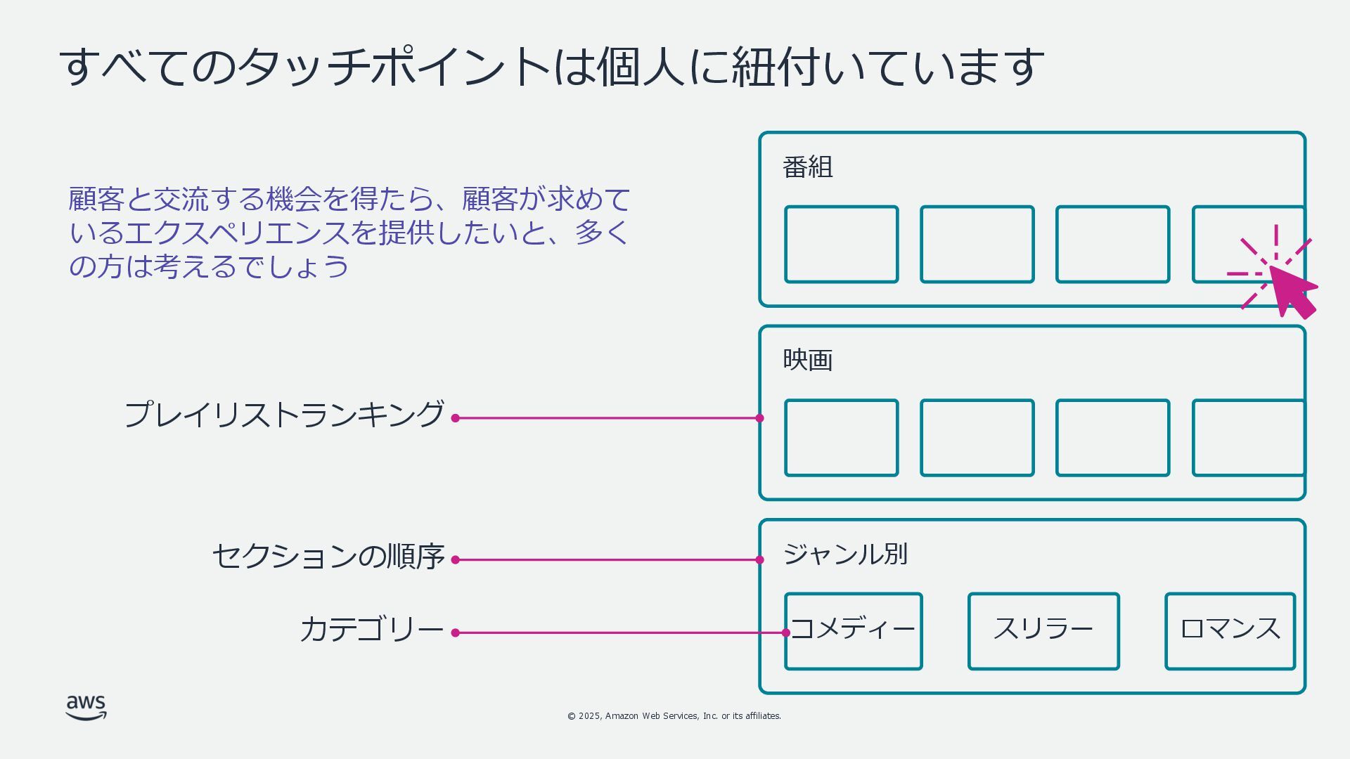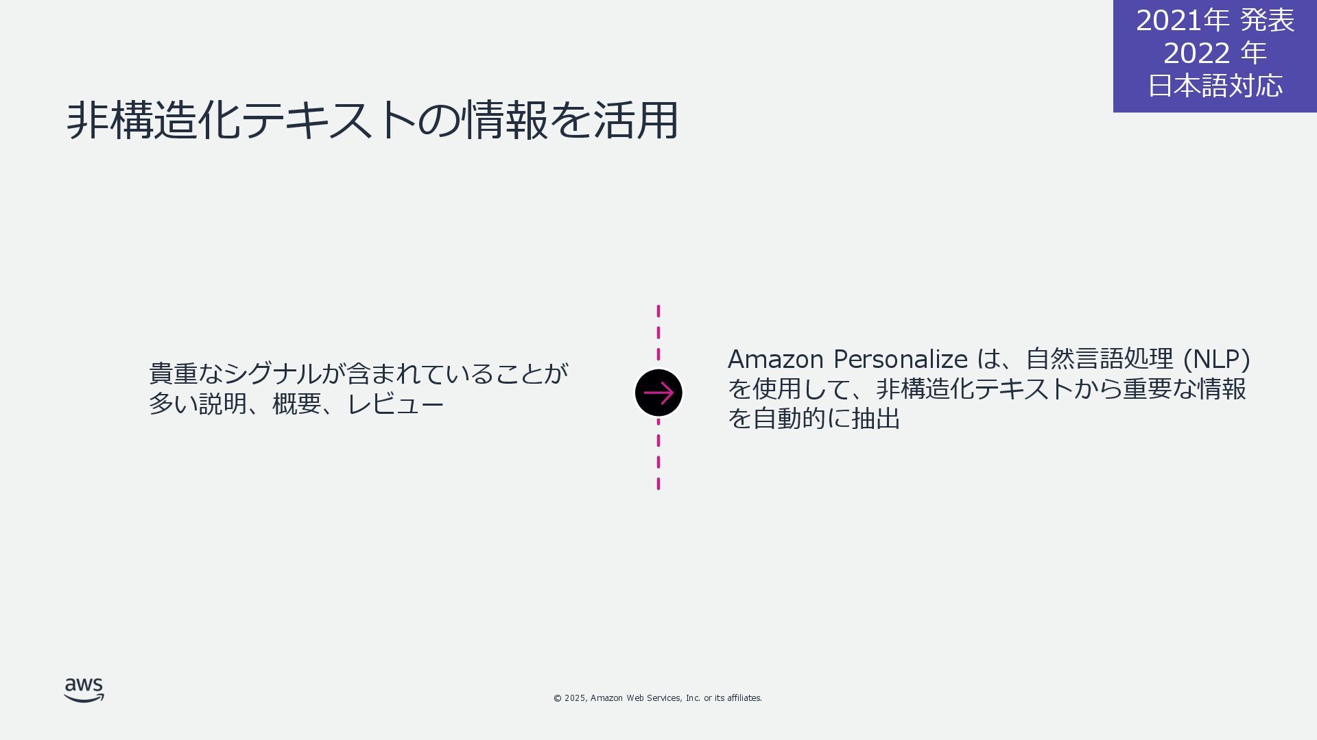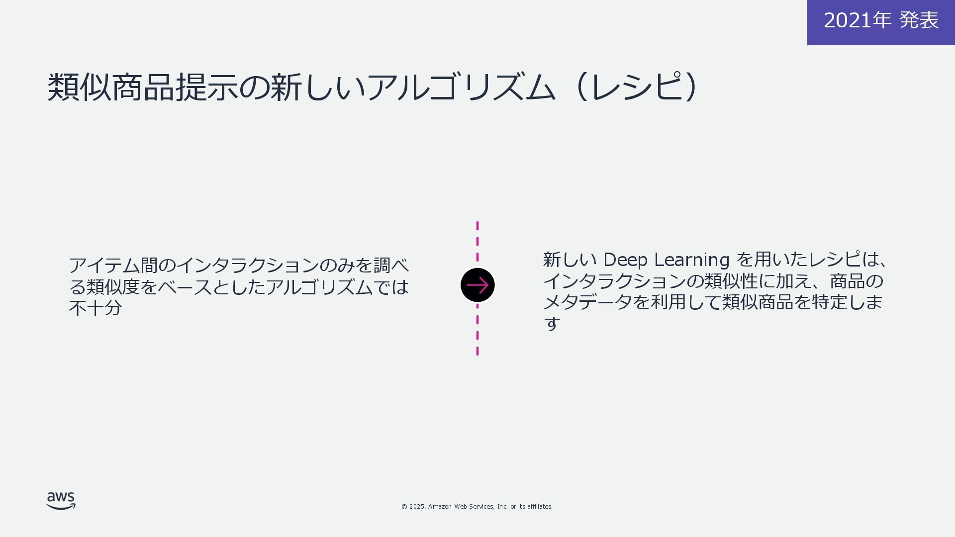 2025, Amazon Web Services, Inc. or its affiliates. Amazon Personalize 機械学習を使⽤して、ユーザ⼀⼈ひとりに合わせたレコメ ンデーションを提供し、ビジネスの成⻑を促進させる Mamoru Tateoka Amazon Web Services Japan G.K.