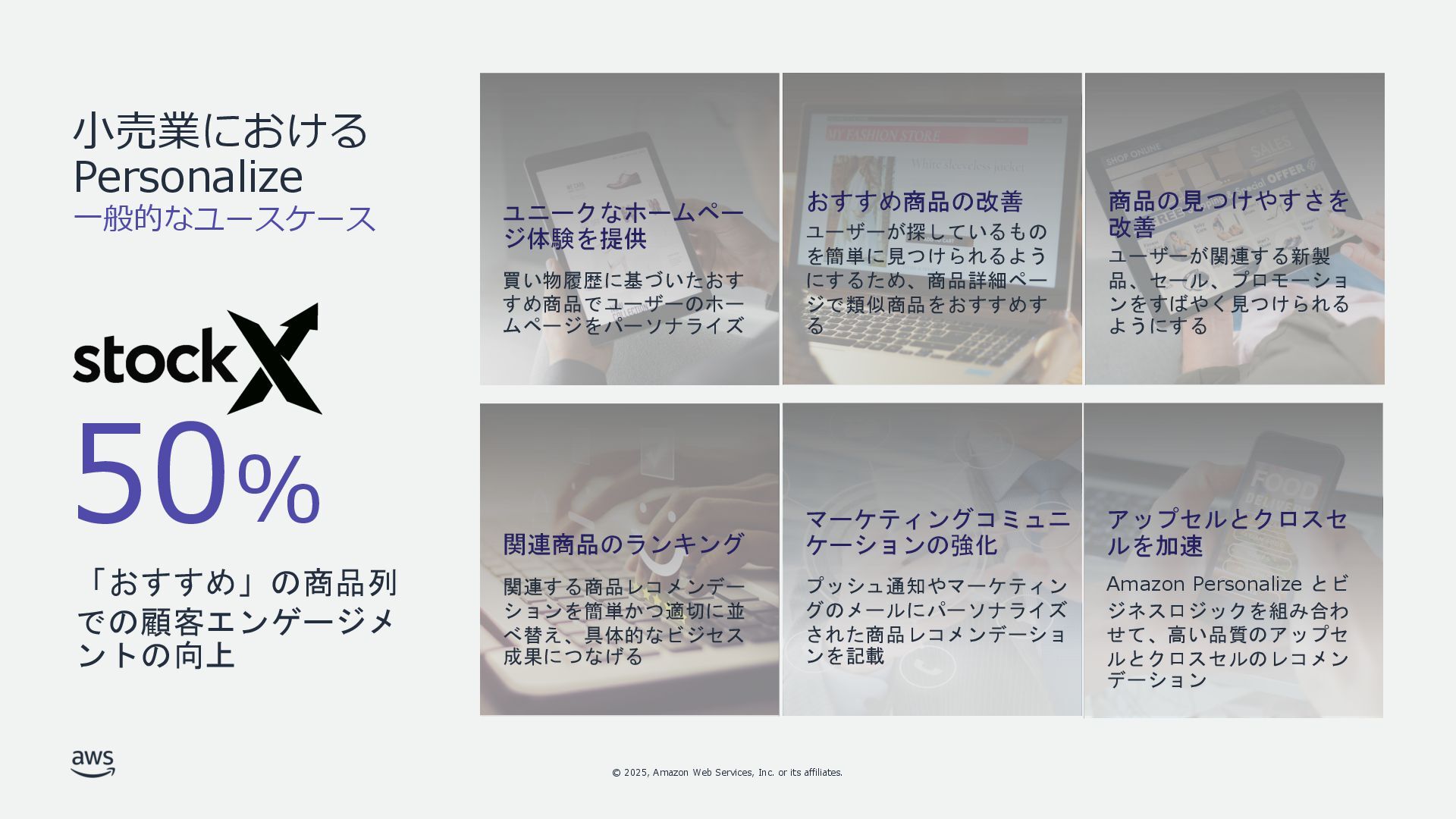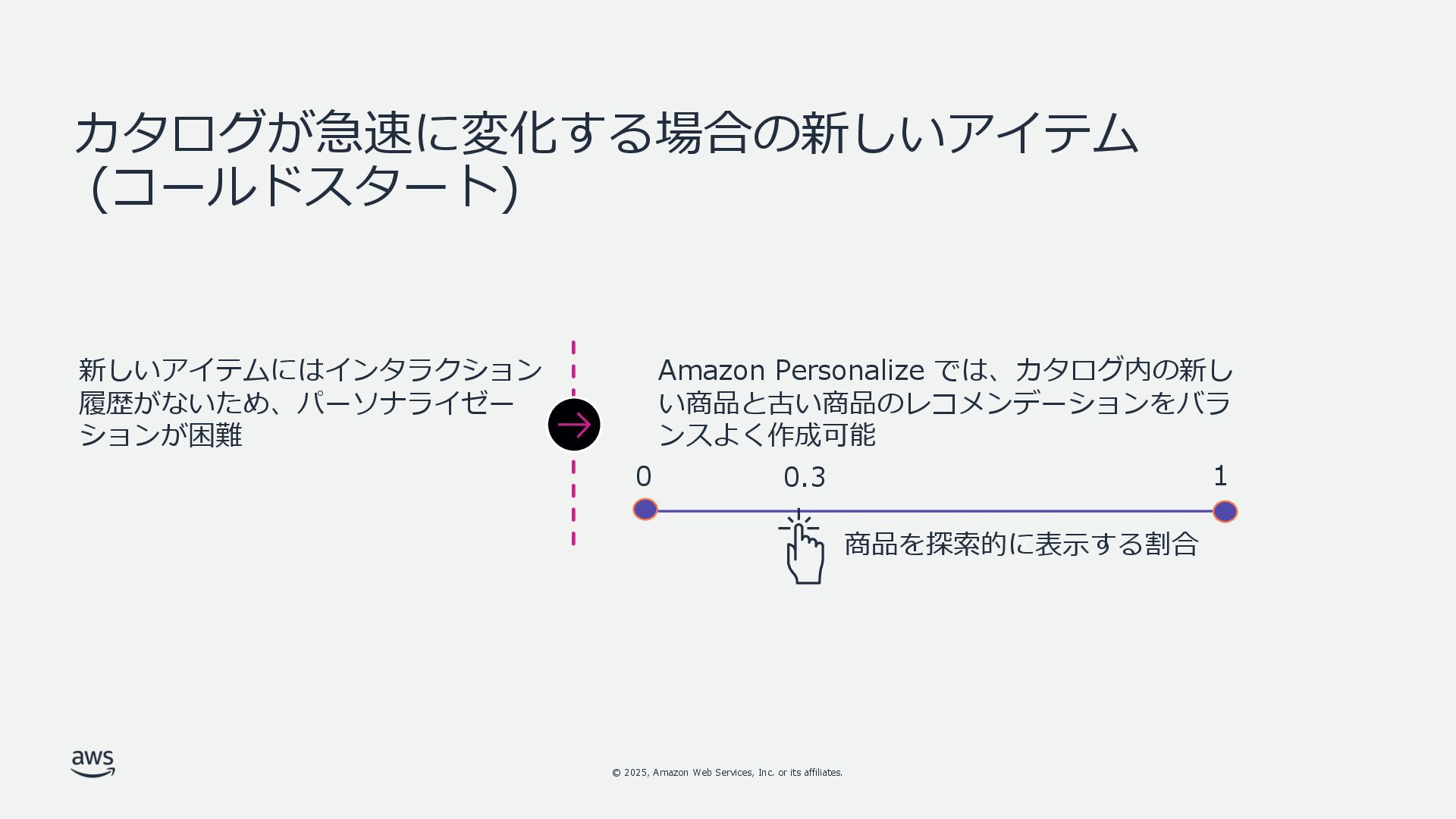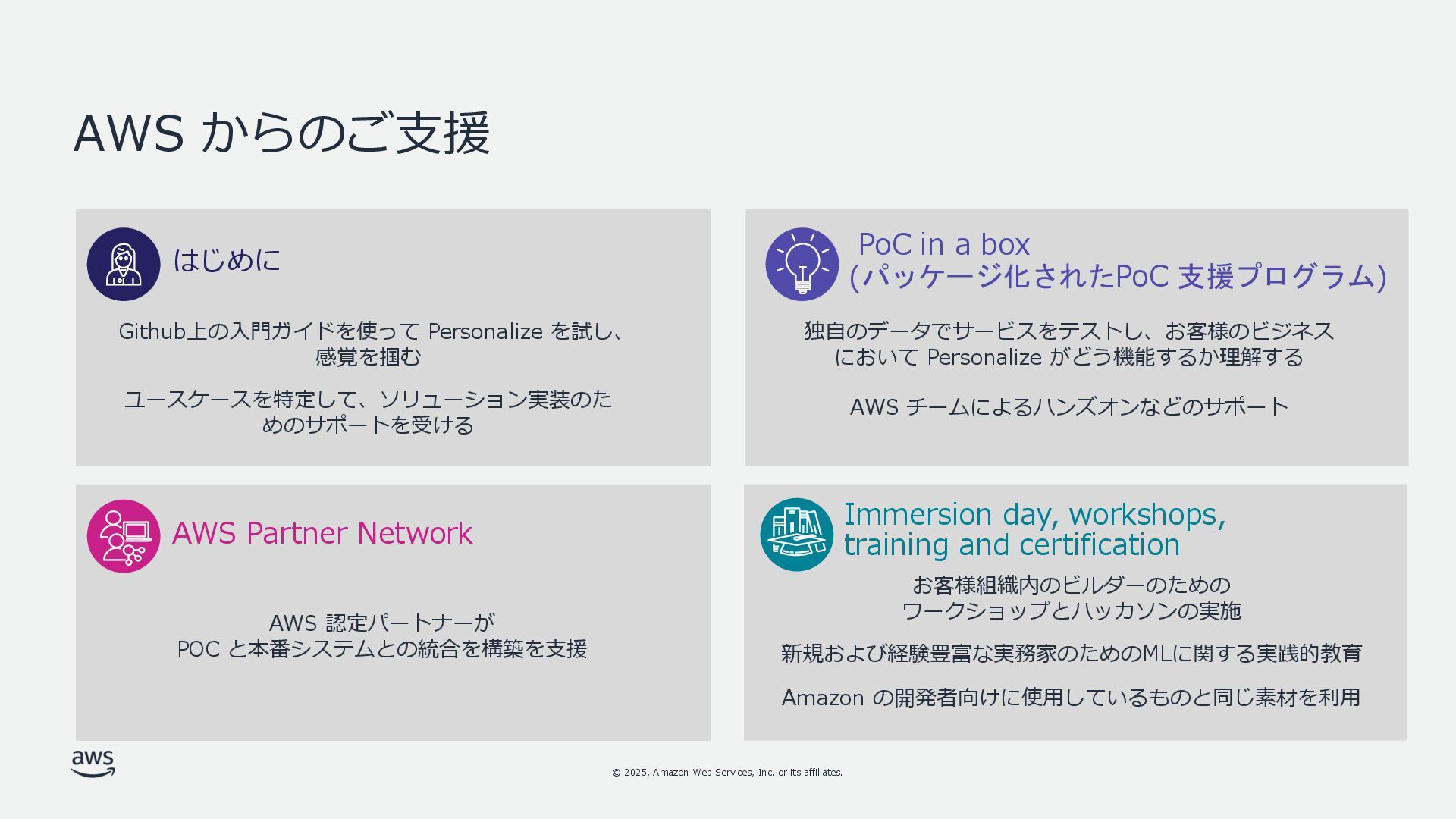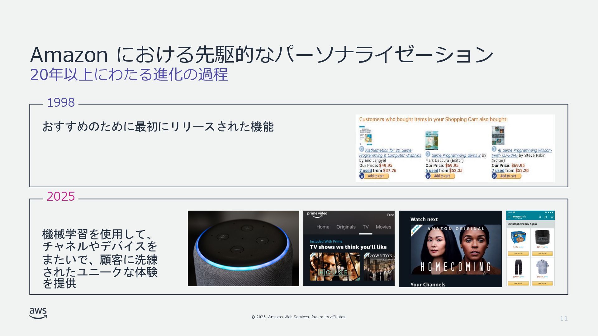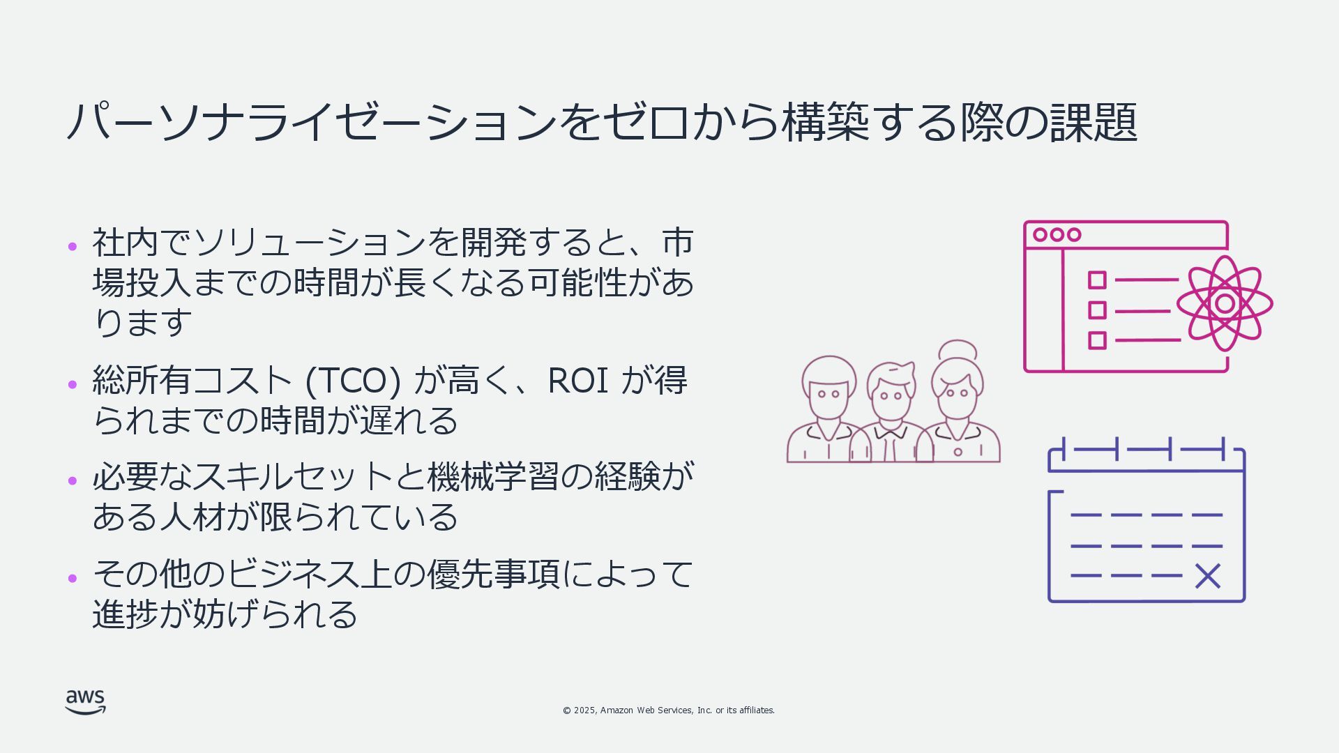 2025, Amazon Web Services, Inc. or its affiliates. Amazon Personalize 機械学習を使⽤して、ユーザ⼀⼈ひとりに合わせたレコメ ンデーションを提供し、ビジネスの成⻑を促進させる Mamoru Tateoka Amazon Web Services Japan G.K.