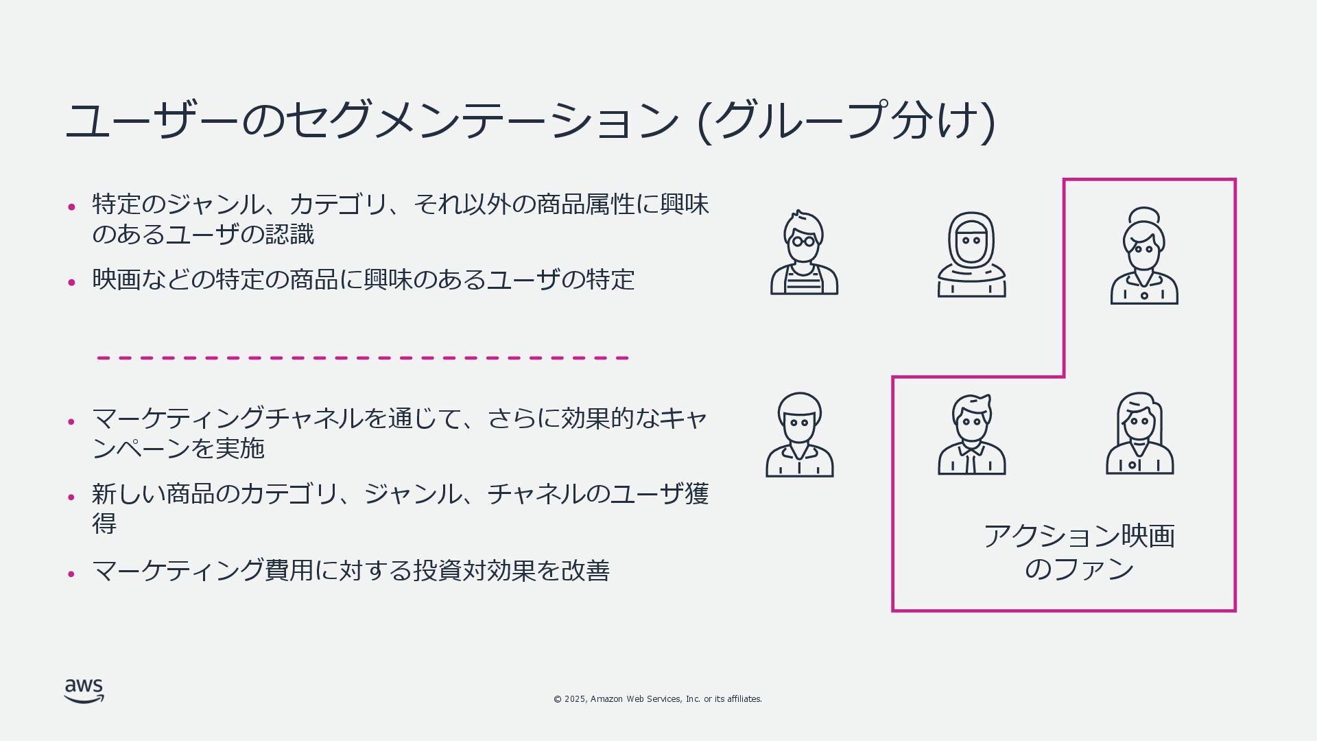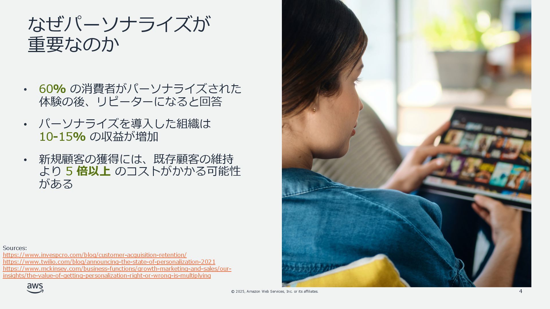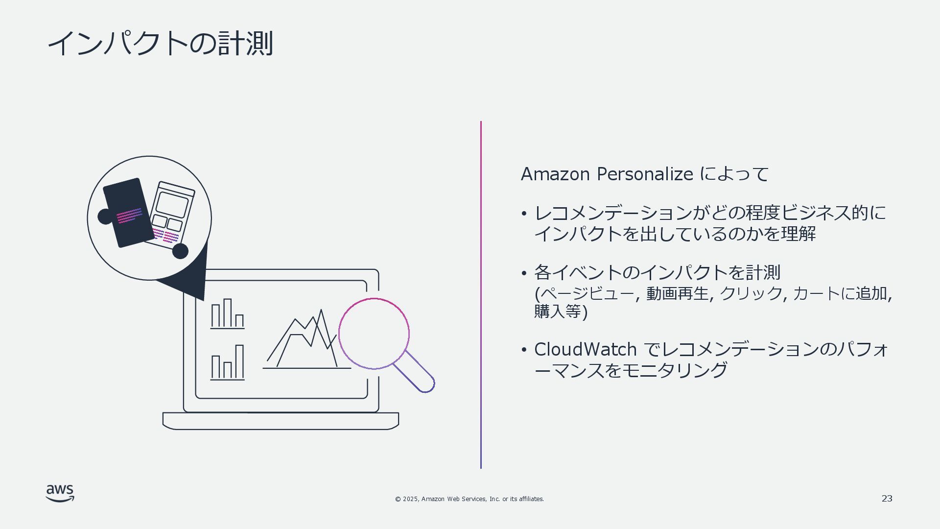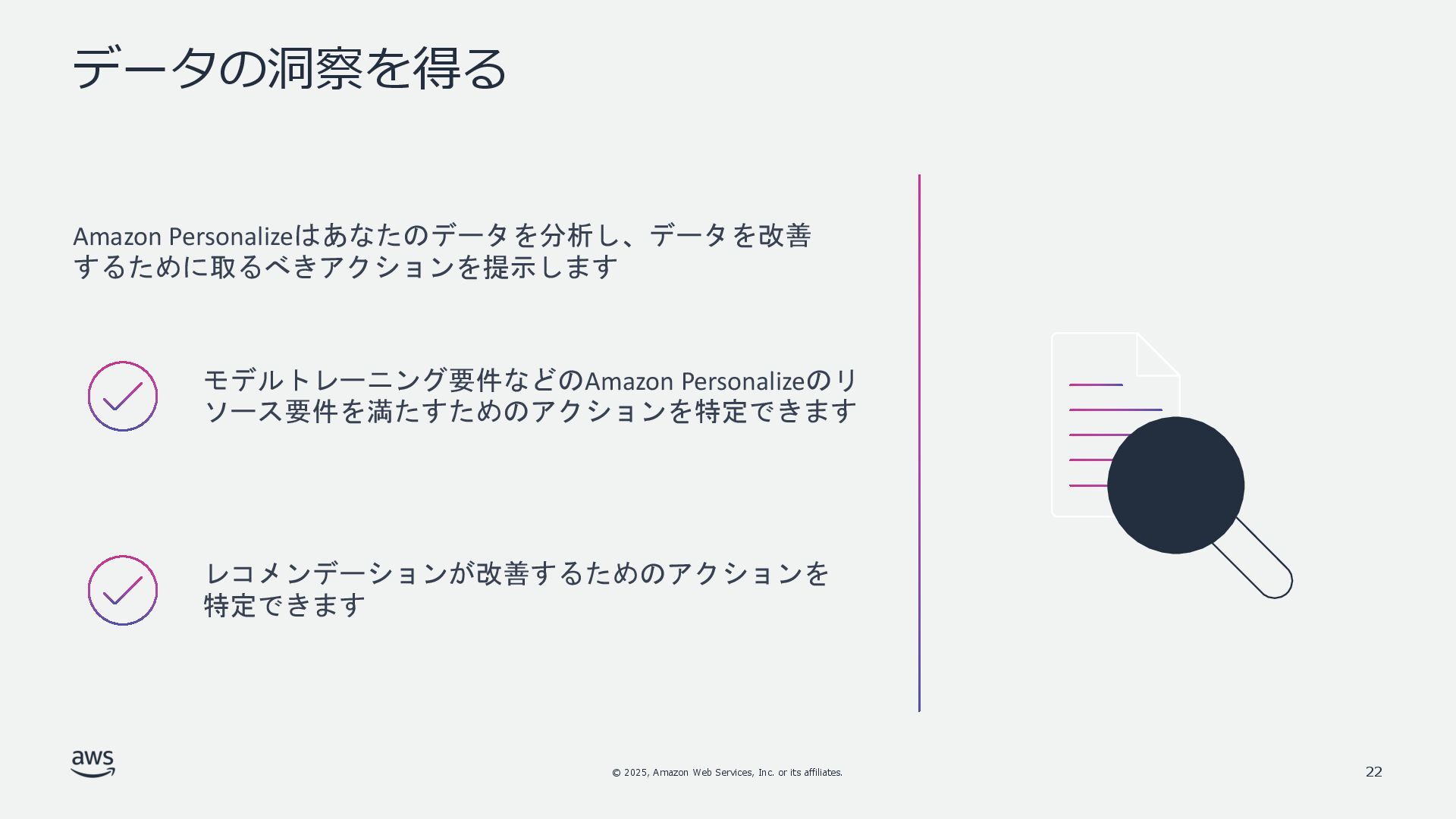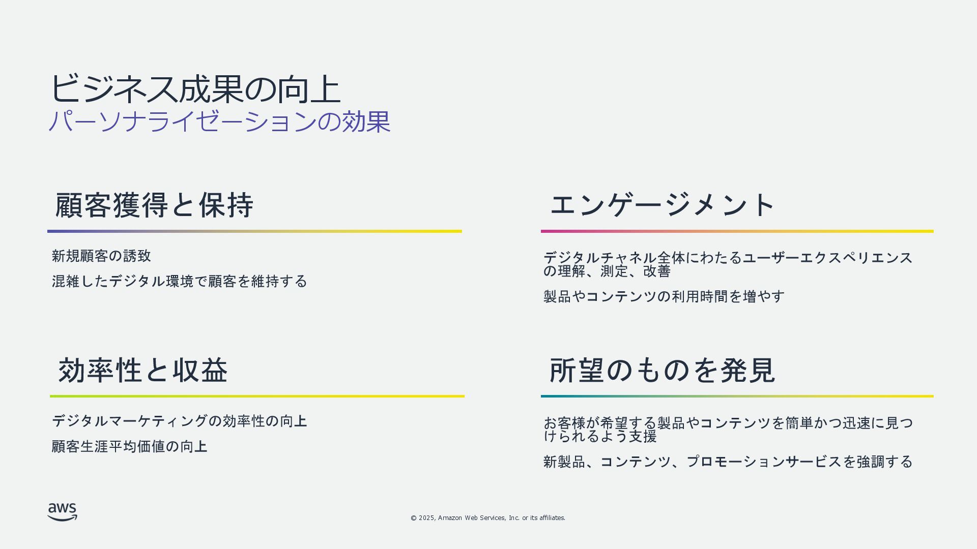 2025, Amazon Web Services, Inc. or its affiliates. Amazon Personalize 機械学習を使⽤して、ユーザ⼀⼈ひとりに合わせたレコメ ンデーションを提供し、ビジネスの成⻑を促進させる Mamoru Tateoka Amazon Web Services Japan G.K.