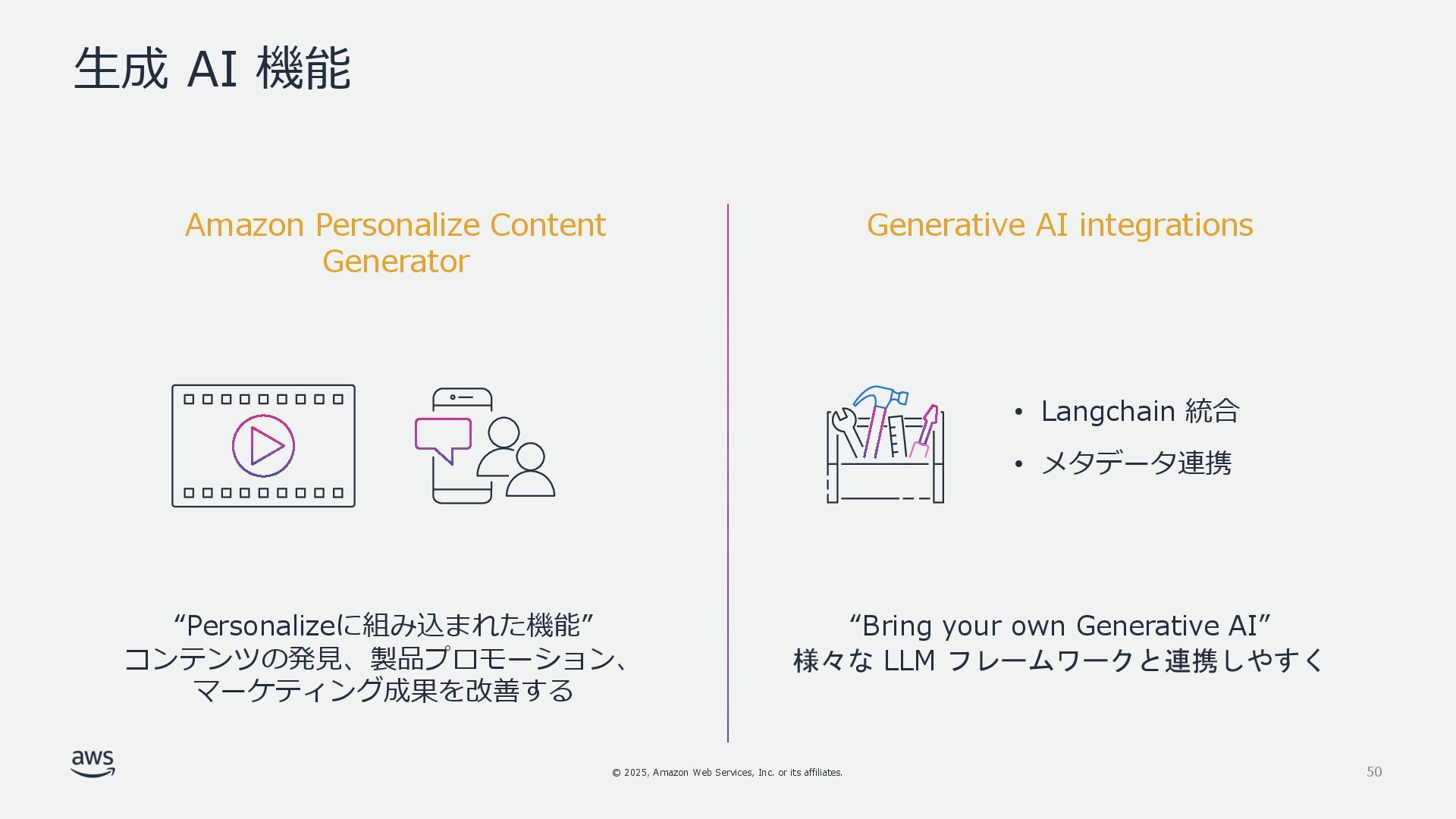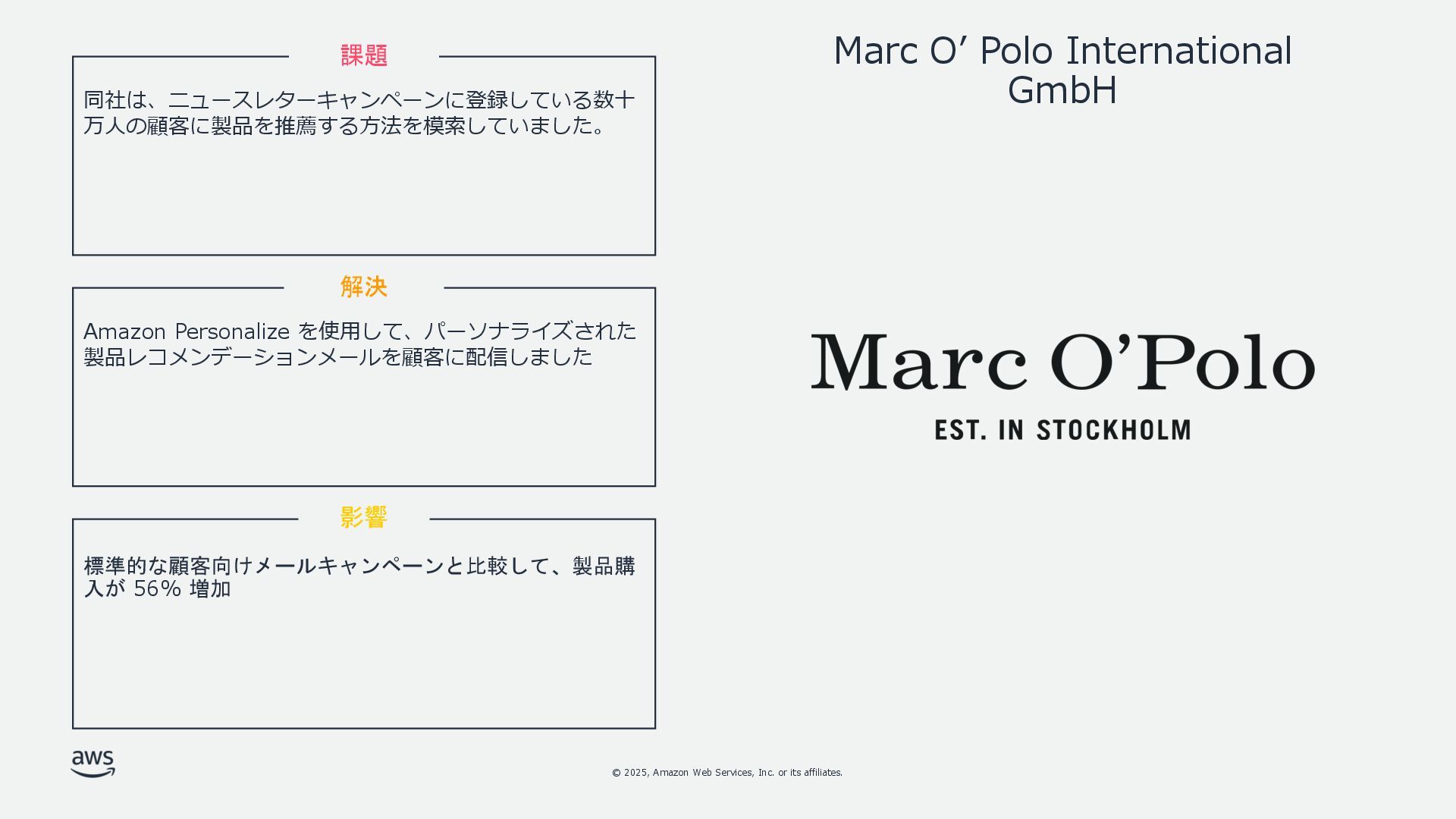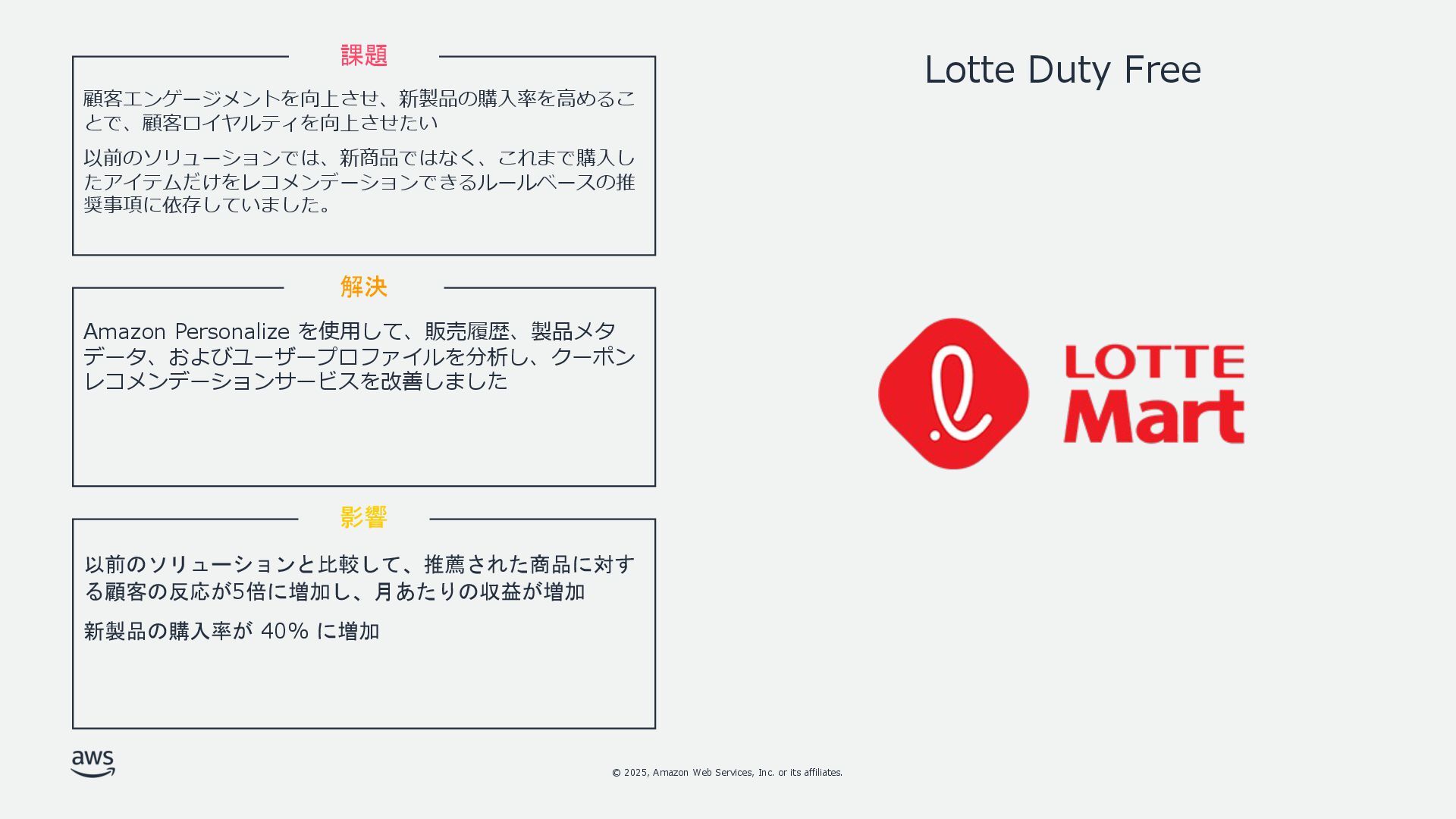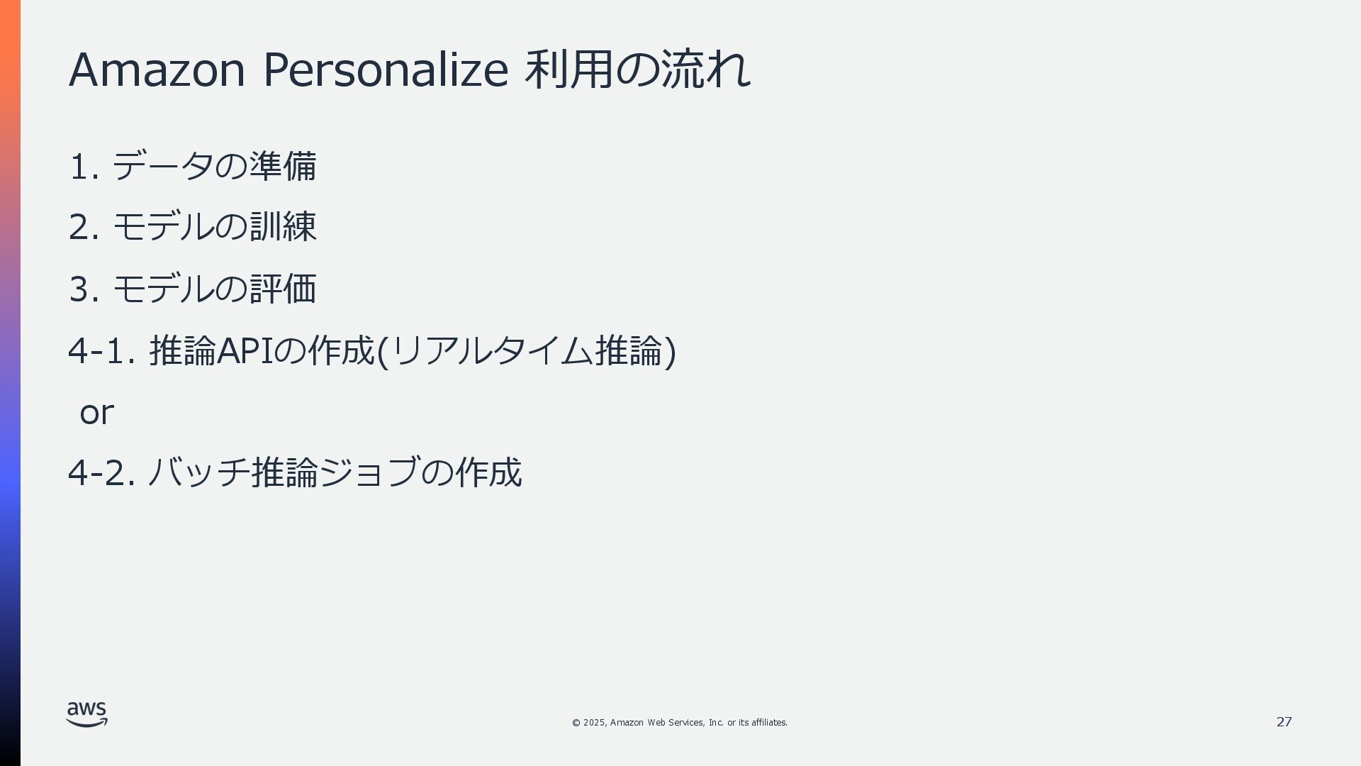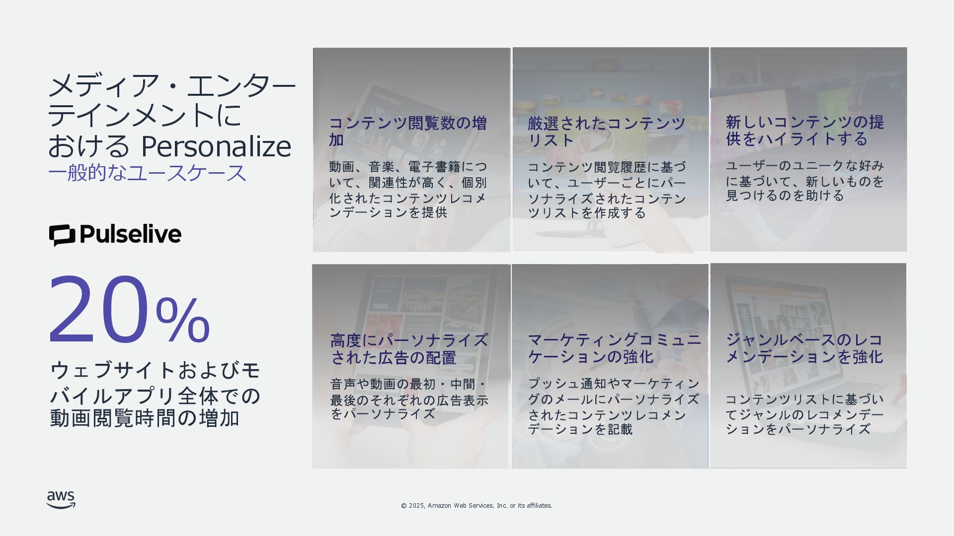 2025, Amazon Web Services, Inc. or its affiliates. Amazon Personalize 機械学習を使⽤して、ユーザ⼀⼈ひとりに合わせたレコメ ンデーションを提供し、ビジネスの成⻑を促進させる Mamoru Tateoka Amazon Web Services Japan G.K.