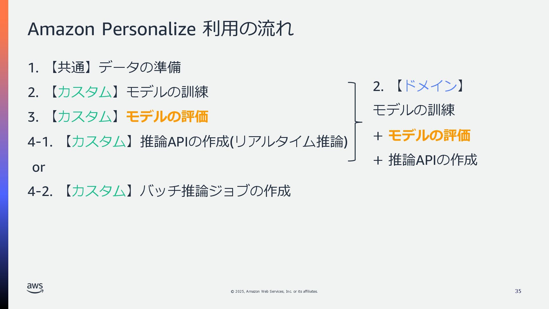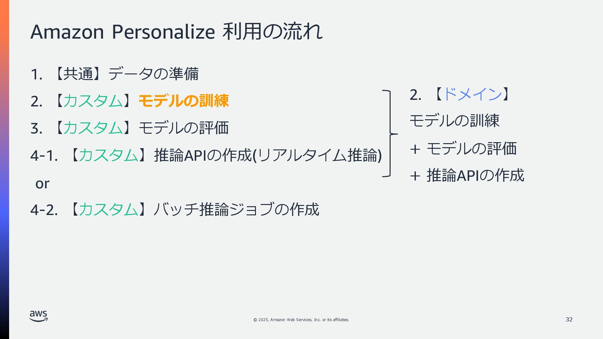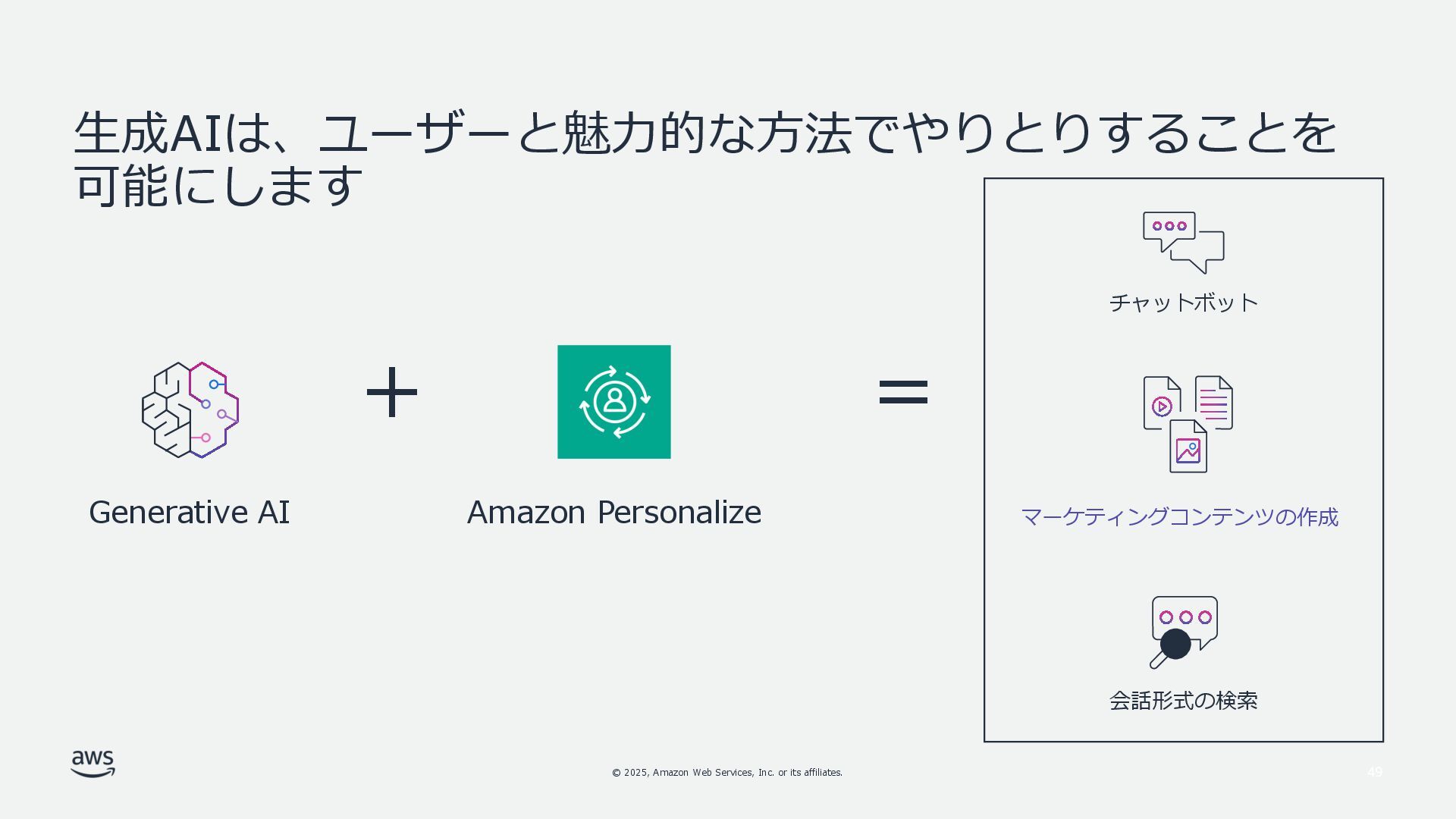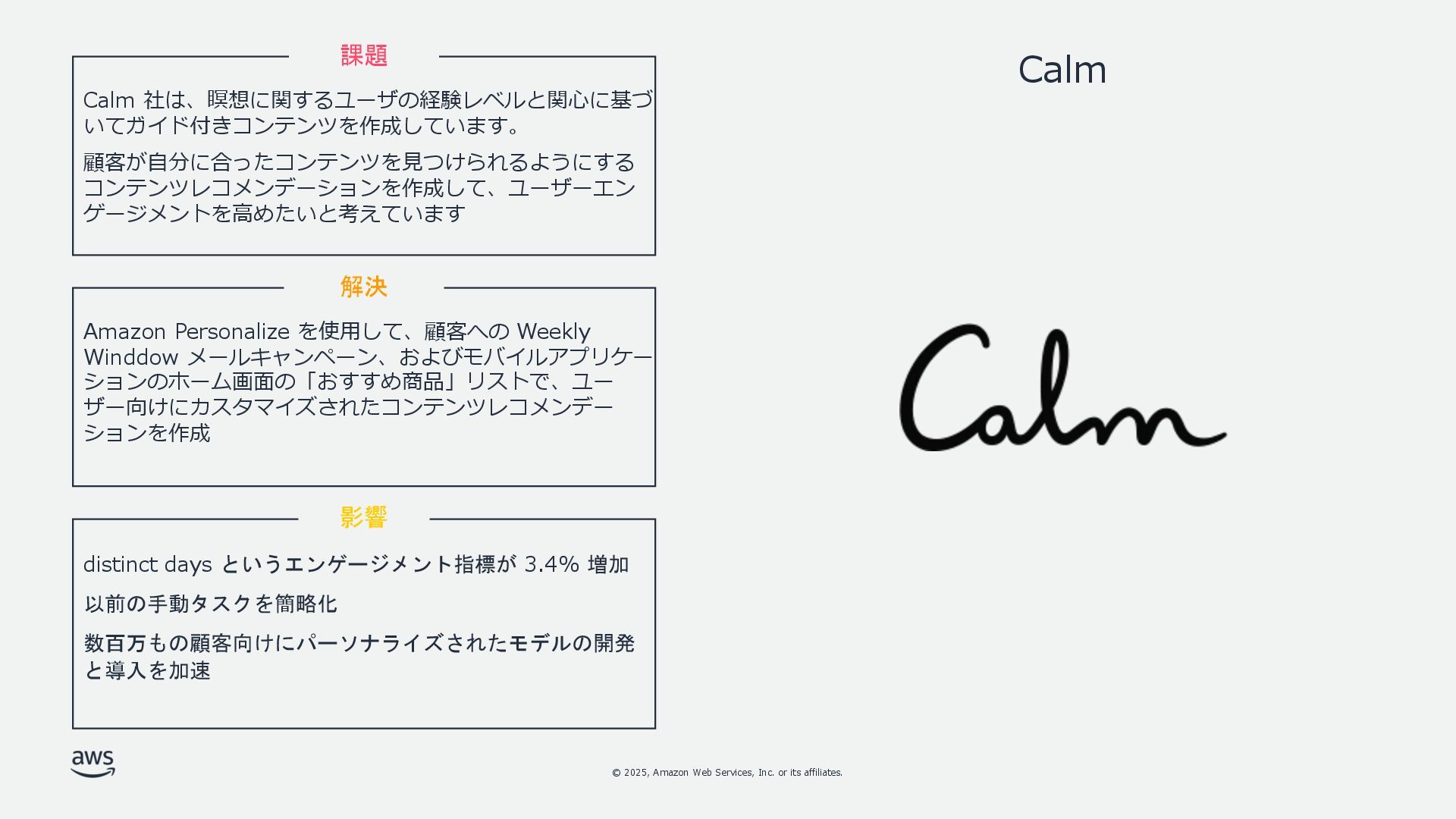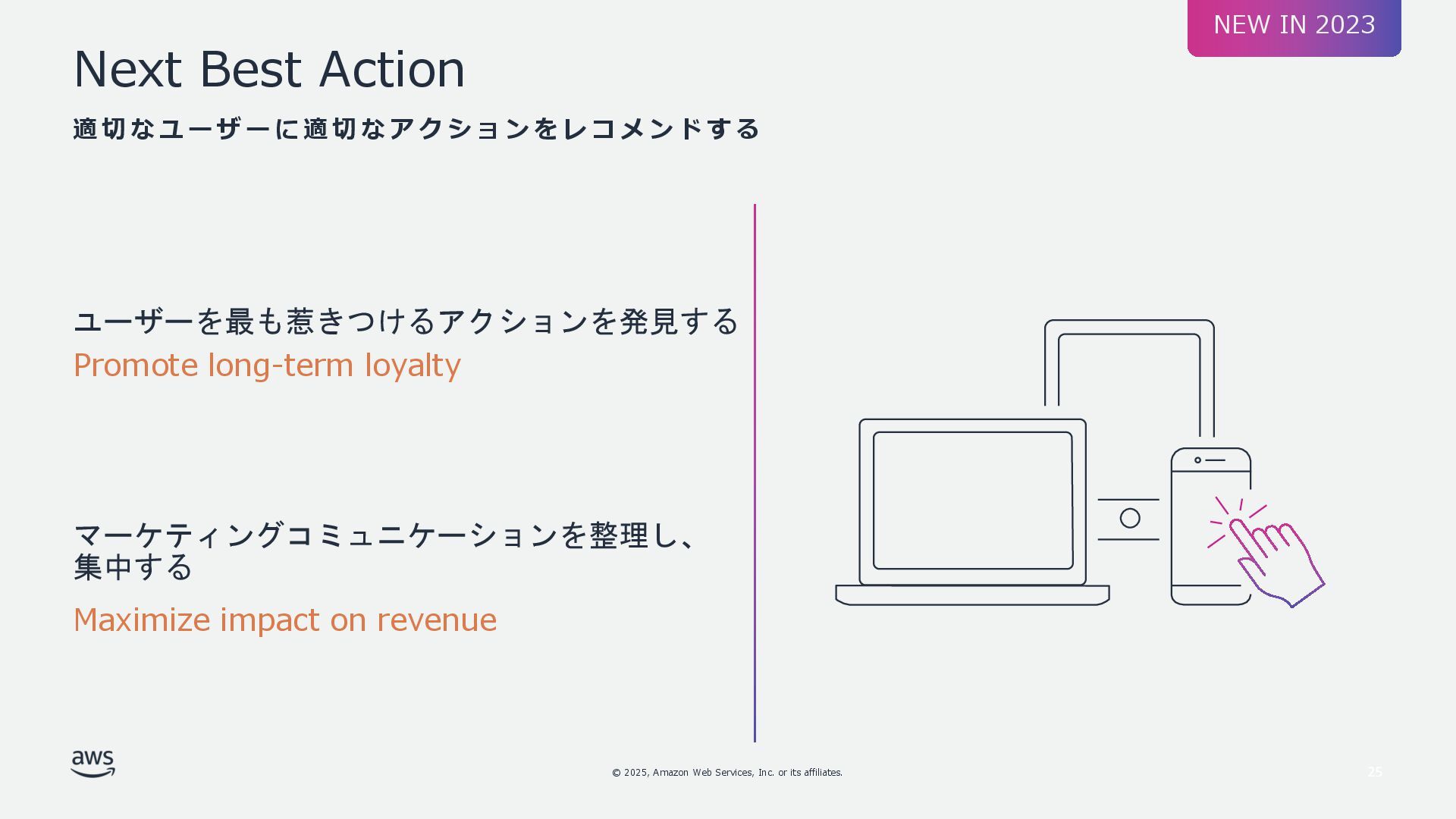 2025, Amazon Web Services, Inc. or its affiliates. Amazon Personalize 機械学習を使⽤して、ユーザ⼀⼈ひとりに合わせたレコメ ンデーションを提供し、ビジネスの成⻑を促進させる Mamoru Tateoka Amazon Web Services Japan G.K.