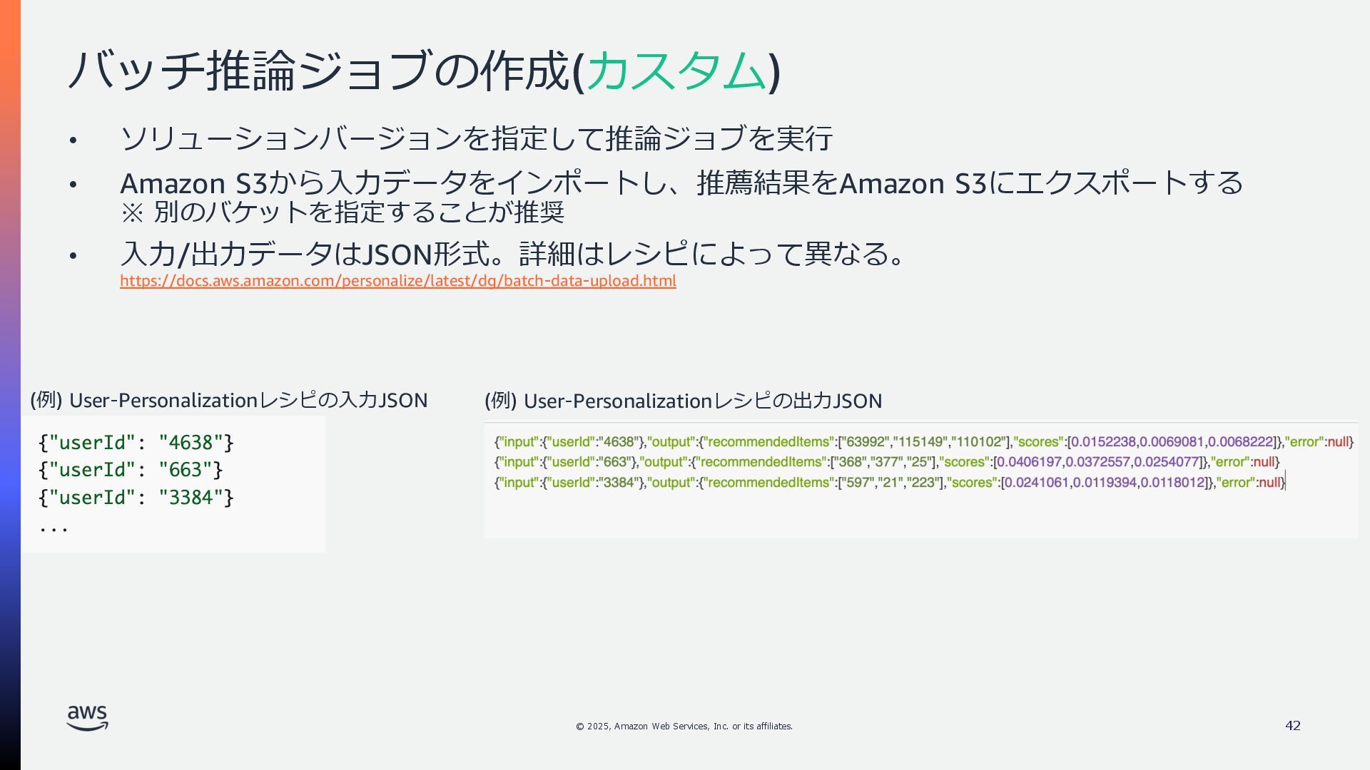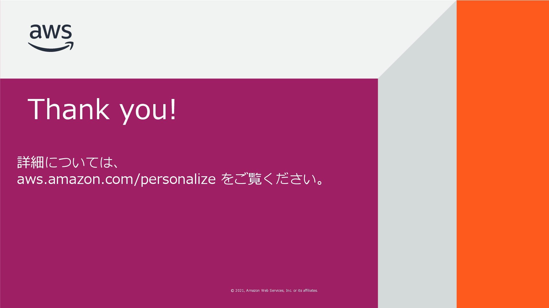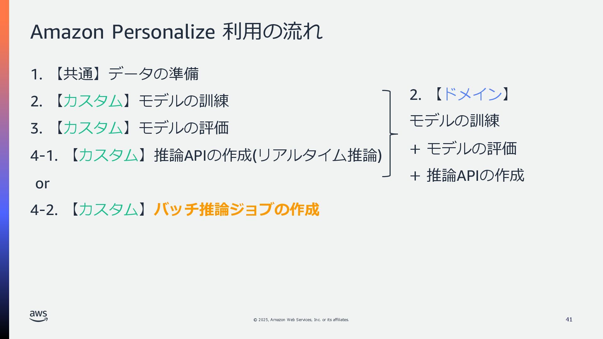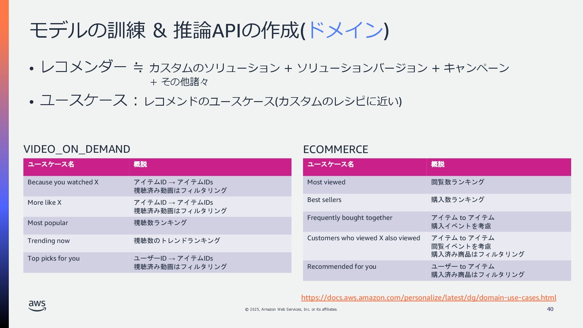 & 推論APIの作成(ドメイン) • レコメンダー ≒ カスタムのソリューション + ソリューションバージョン + キャンペーン + その他諸々 • ユースケース : レコメンドのユースケース(カスタムのレシピに近い) 40 VIDEO_ON_DEMAND ユースケース名 概説 Because you watched X アイテムID → アイテムIDs 視聴済み動画はフィルタリング More like X アイテムID → アイテムIDs 視聴済み動画はフィルタリング Most popular 視聴数ランキング Trending now 視聴数のトレンドランキング Top picks for you ユーザーID → アイテムIDs 視聴済み動画はフィルタリング ECOMMERCE ユースケース名 概説 Most viewed 閲覧数ランキング Best sellers 購入数ランキング Frequently bought together アイテム to アイテム 購入イベントを考慮 Customers who viewed X also viewed アイテム to アイテム 閲覧イベントを考慮 購入済み商品はフィルタリング Recommended for you ユーザー to アイテム 購入済み商品はフィルタリング https://docs.aws.amazon.com/personalize/latest/dg/domain-use-cases.html