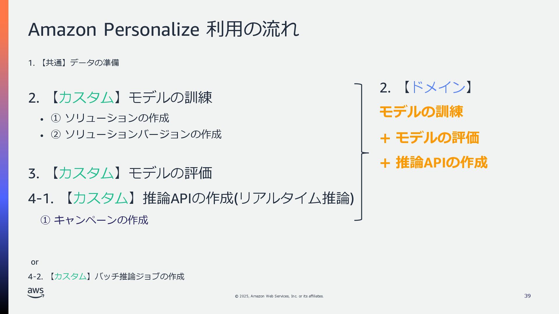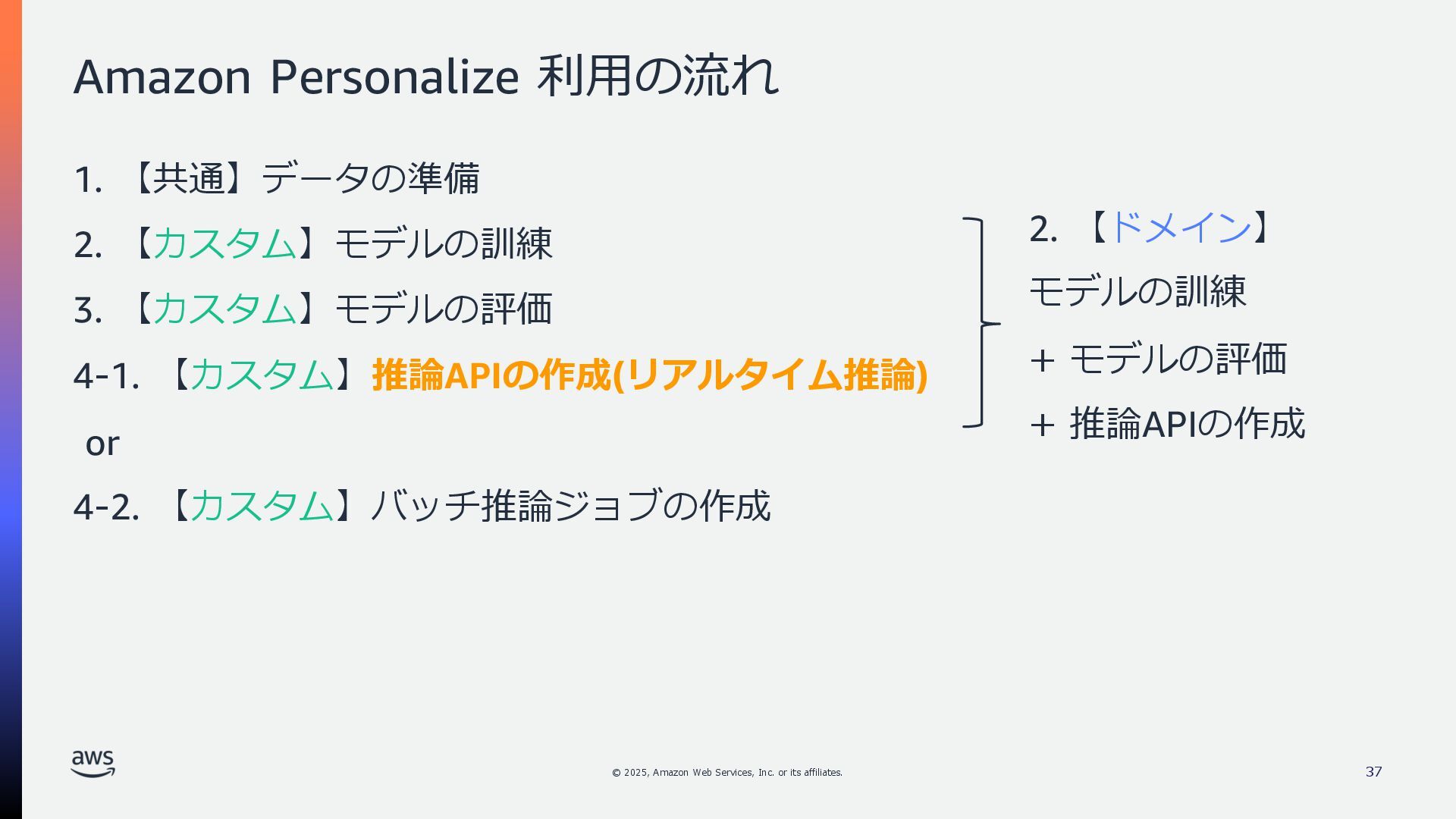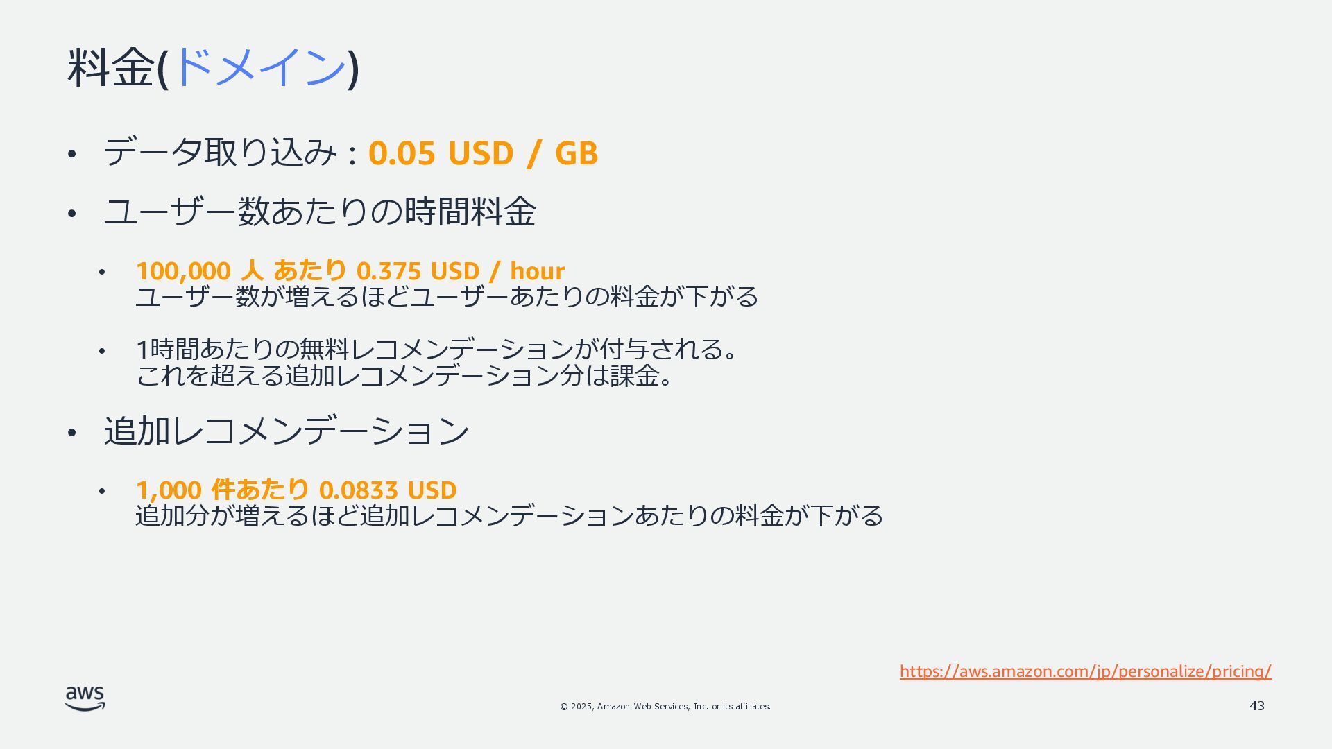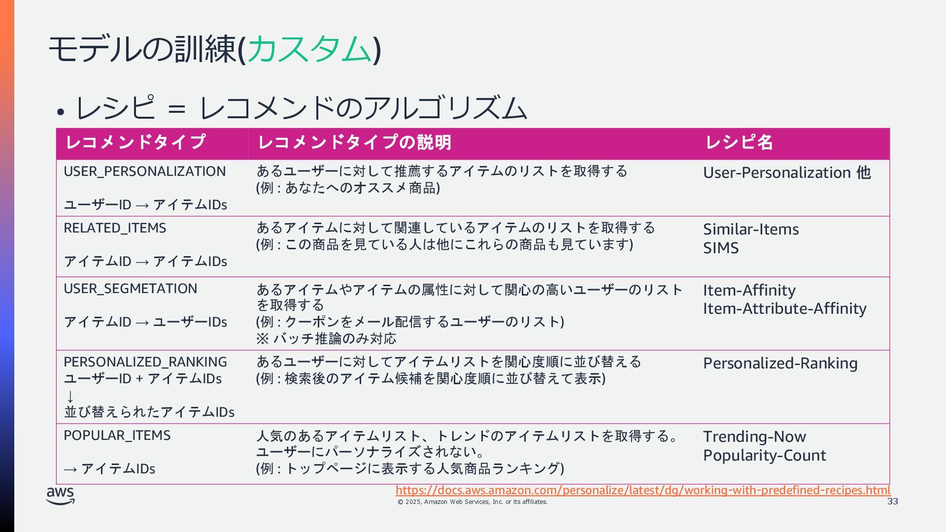& 推論APIの作成(ドメイン) • レコメンダー ≒ カスタムのソリューション + ソリューションバージョン + キャンペーン + その他諸々 • ユースケース : レコメンドのユースケース(カスタムのレシピに近い) 40 VIDEO_ON_DEMAND ユースケース名 概説 Because you watched X アイテムID → アイテムIDs 視聴済み動画はフィルタリング More like X アイテムID → アイテムIDs 視聴済み動画はフィルタリング Most popular 視聴数ランキング Trending now 視聴数のトレンドランキング Top picks for you ユーザーID → アイテムIDs 視聴済み動画はフィルタリング ECOMMERCE ユースケース名 概説 Most viewed 閲覧数ランキング Best sellers 購入数ランキング Frequently bought together アイテム to アイテム 購入イベントを考慮 Customers who viewed X also viewed アイテム to アイテム 閲覧イベントを考慮 購入済み商品はフィルタリング Recommended for you ユーザー to アイテム 購入済み商品はフィルタリング https://docs.aws.amazon.com/personalize/latest/dg/domain-use-cases.html