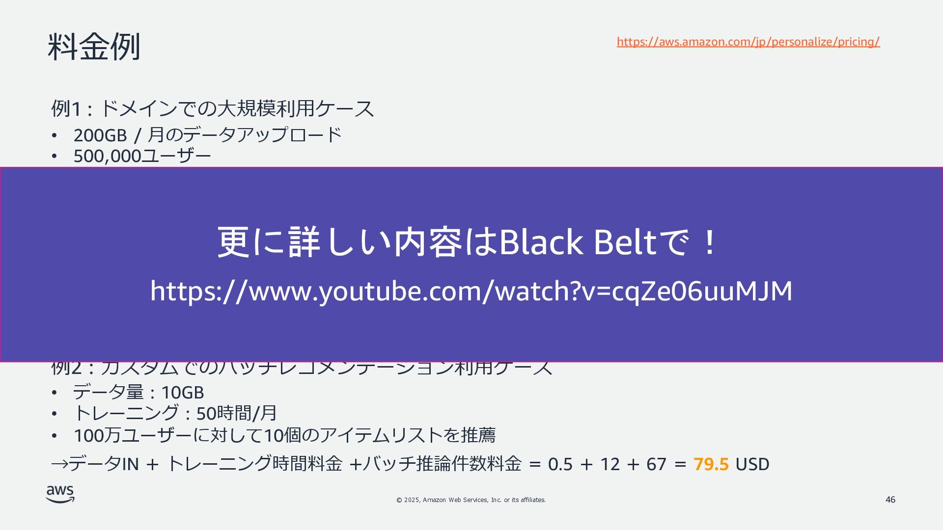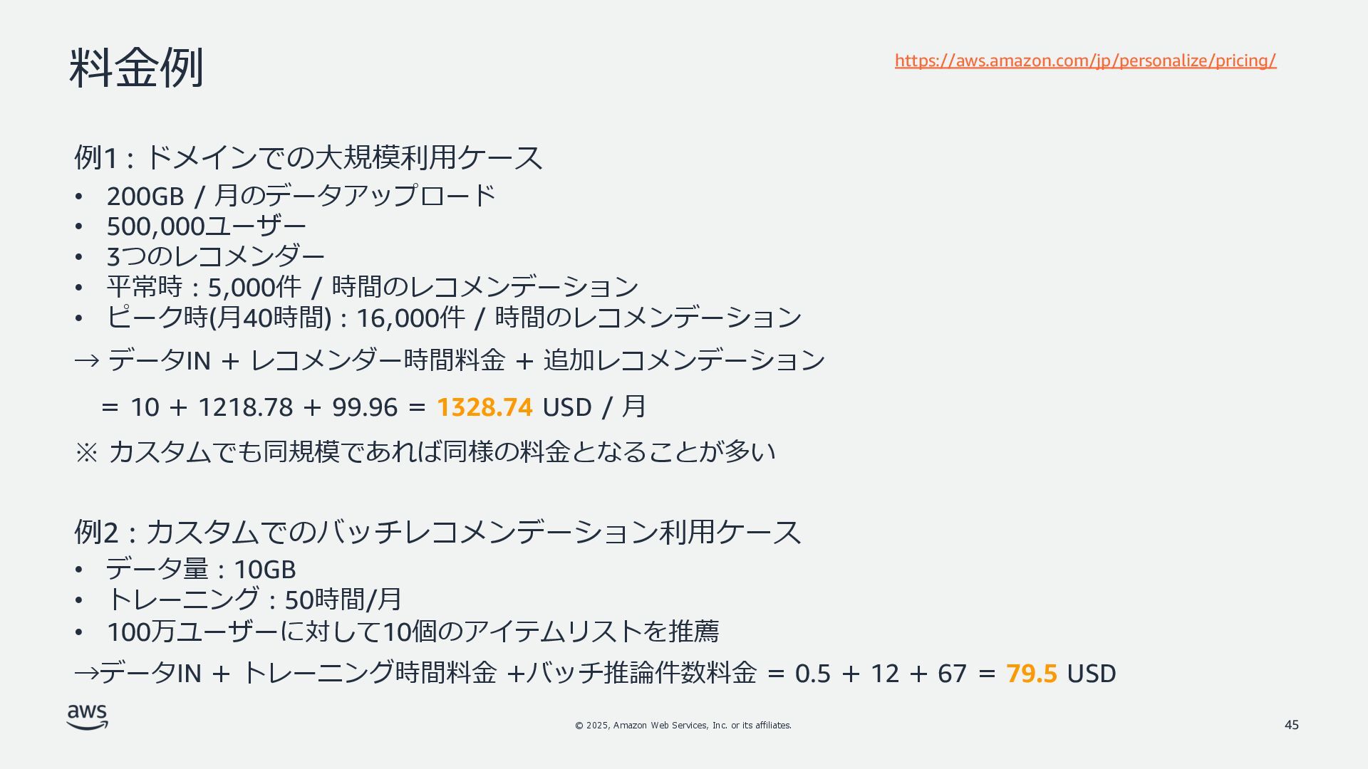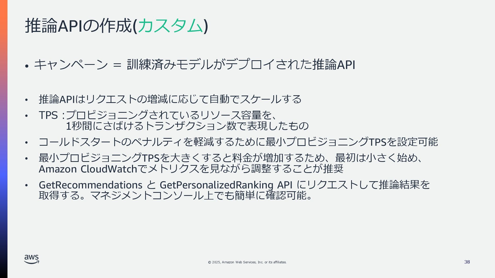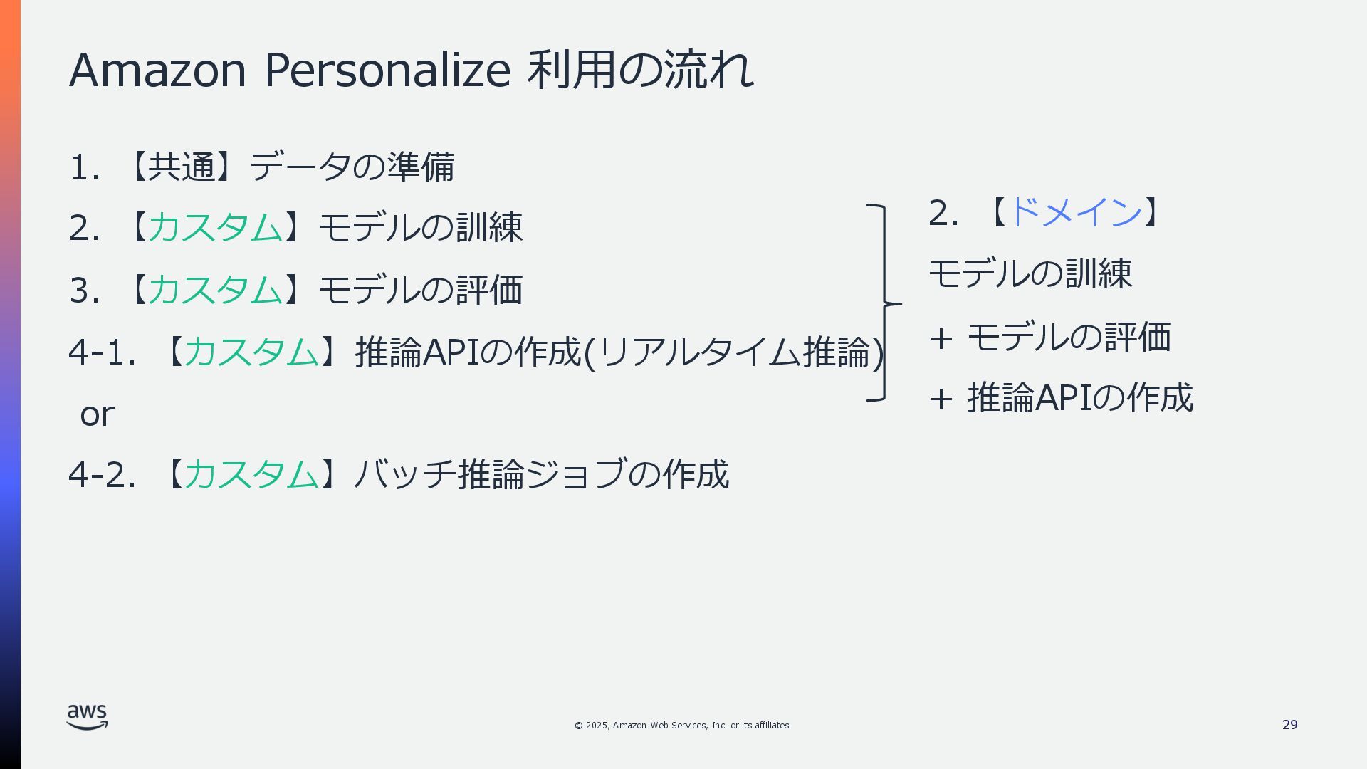 & 推論APIの作成(ドメイン) • レコメンダー ≒ カスタムのソリューション + ソリューションバージョン + キャンペーン + その他諸々 • ユースケース : レコメンドのユースケース(カスタムのレシピに近い) 40 VIDEO_ON_DEMAND ユースケース名 概説 Because you watched X アイテムID → アイテムIDs 視聴済み動画はフィルタリング More like X アイテムID → アイテムIDs 視聴済み動画はフィルタリング Most popular 視聴数ランキング Trending now 視聴数のトレンドランキング Top picks for you ユーザーID → アイテムIDs 視聴済み動画はフィルタリング ECOMMERCE ユースケース名 概説 Most viewed 閲覧数ランキング Best sellers 購入数ランキング Frequently bought together アイテム to アイテム 購入イベントを考慮 Customers who viewed X also viewed アイテム to アイテム 閲覧イベントを考慮 購入済み商品はフィルタリング Recommended for you ユーザー to アイテム 購入済み商品はフィルタリング https://docs.aws.amazon.com/personalize/latest/dg/domain-use-cases.html