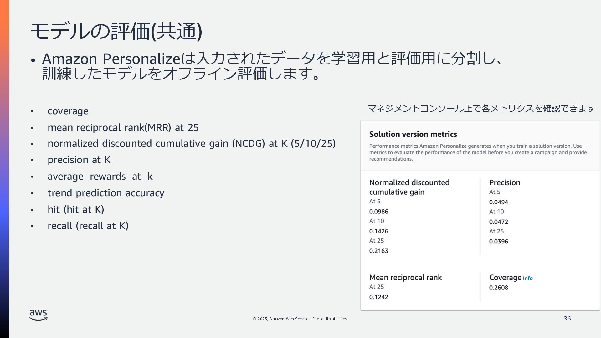 • Amazon Personalizeは⼊⼒されたデータを学習⽤と評価⽤に分割し、 訓練したモデルをオフライン評価します。 • coverage • mean reciprocal rank(MRR) at 25 • normalized discounted cumulative gain (NCDG) at K (5/10/25) • precision at K • average_rewards_at_k • trend prediction accuracy • hit (hit at K) • recall (recall at K) 36 マネジメントコンソール上で各メトリクスを確認できます