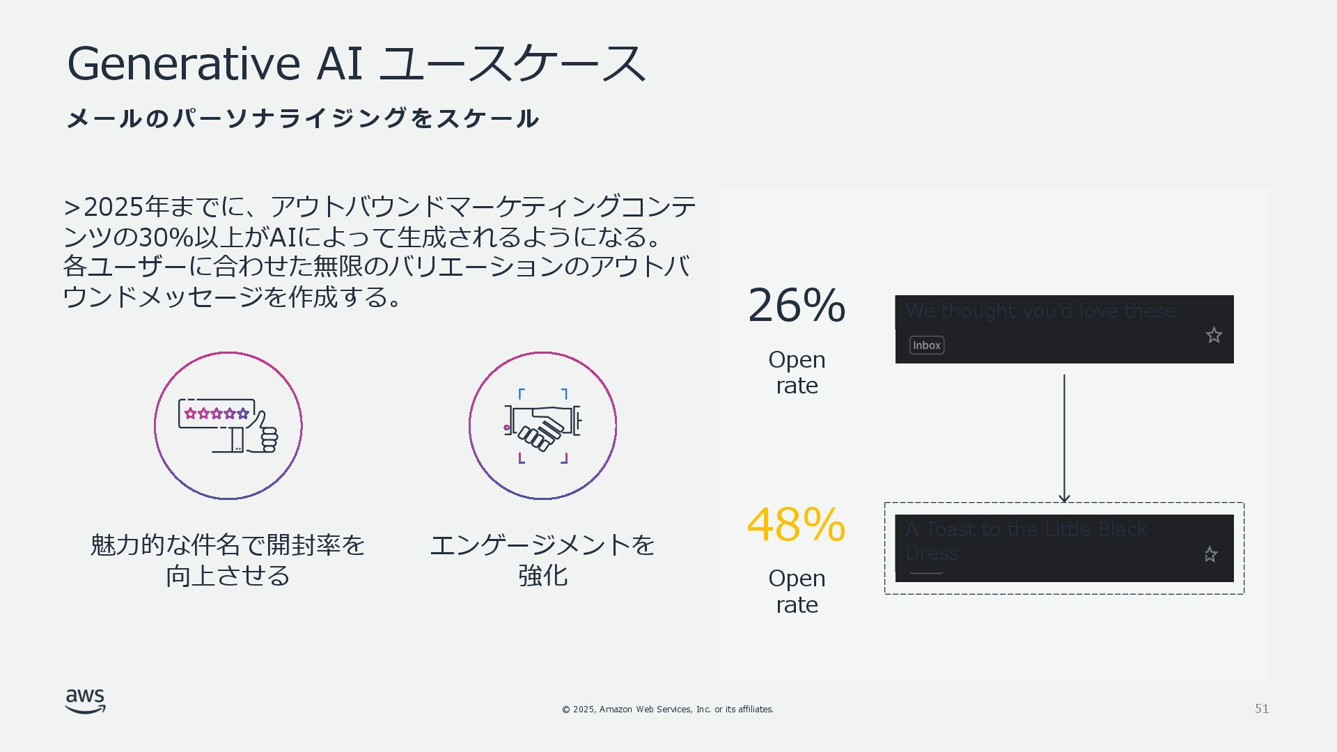 AI ユースケース メ ー ル の パ ー ソ ナ ラ イ ジ ン グ を ス ケ ー ル >2025年までに、アウトバウンドマーケティングコンテ ンツの30%以上がAIによって⽣成されるようになる。 各ユーザーに合わせた無限のバリエーションのアウトバ ウンドメッセージを作成する。 魅⼒的な件名で開封率を 向上させる エンゲージメントを 強化 48% Open rate A Toast to the Little Black Dress 26% Open rate We thought youʼd love these 51