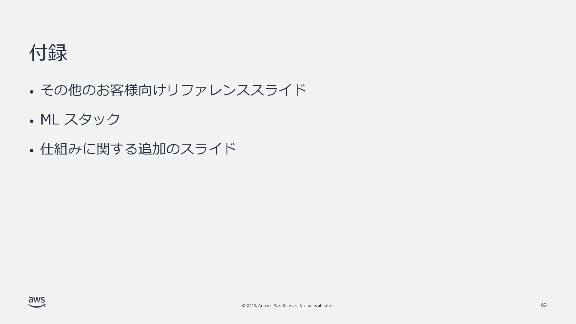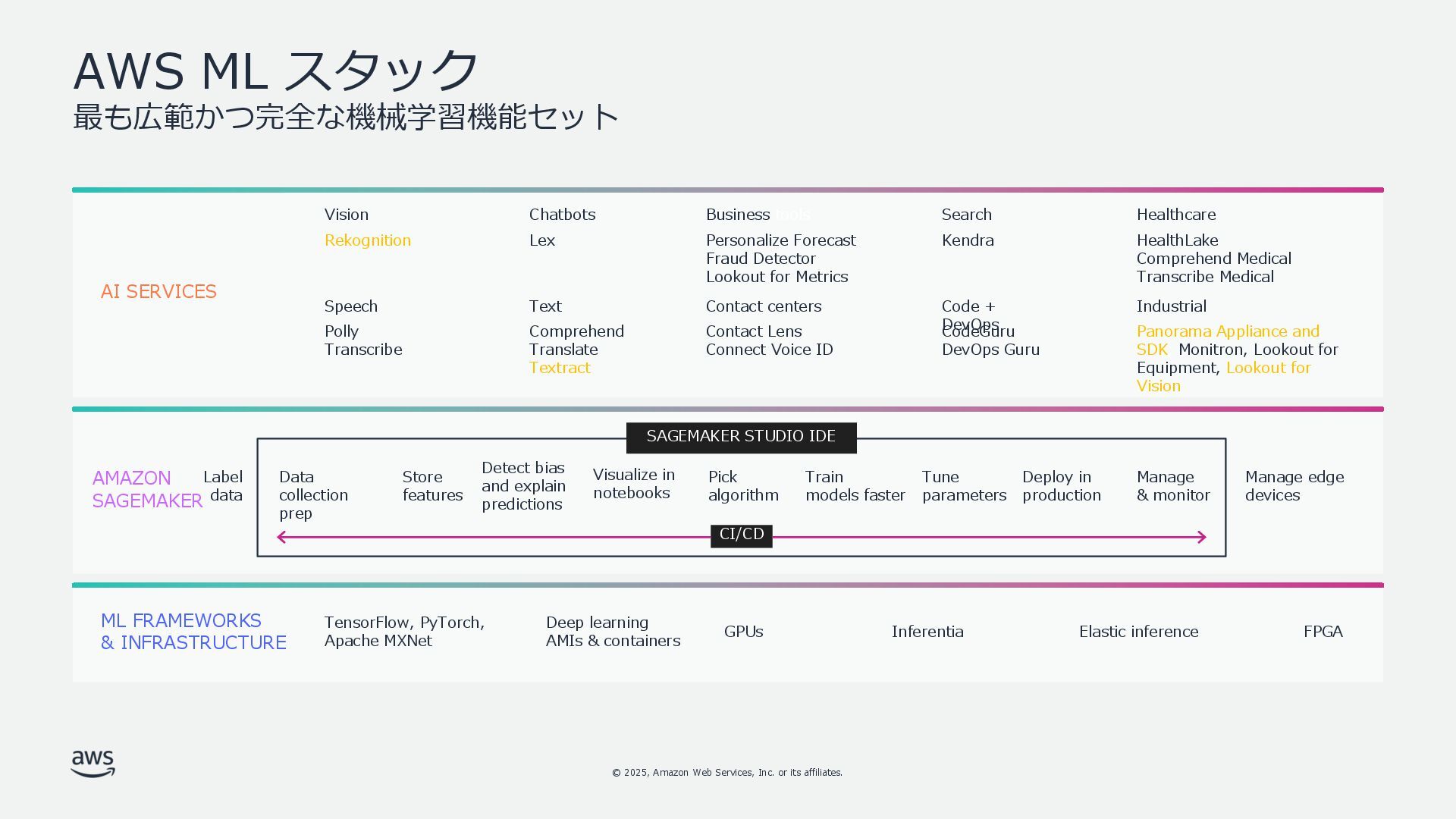 ML スタック 最も広範かつ完全な機械学習機能セット ML FRAMEWORKS & INFRASTRUCTURE TensorFlow, PyTorch, Apache MXNet Deep learning AMIs & containers GPUs Inferentia Elastic inference FPGA AI SERVICES Vision Rekognition Speech Polly Transcribe Chatbots Lex Contact centers Contact Lens Connect Voice ID Code + DevOps CodeGuru DevOps Guru Text Comprehend Translate Textract Business tools Personalize Forecast Fraud Detector Lookout for Metrics Search Kendra Industrial Panorama Appliance and SDK, Monitron, Lookout for Equipment, Lookout for Vision Healthcare HealthLake Comprehend Medical Transcribe Medical Label data Data collection prep Store features Detect bias and explain predictions Visualize in notebooks Pick algorithm Manage & monitor Train models faster Deploy in production Tune parameters Manage edge devices SAGEMAKER STUDIO IDE CI/CD AMAZON SAGEMAKER