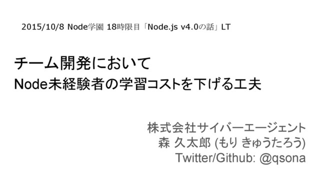チーム開発において Node未経験者の学習コストを下げる工夫 株式会社サイバーエージェント 森 久太郎 (もり きゅうたろう) Twitter/Github: @qsona 2015/10/8