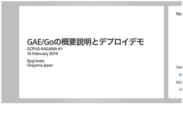 2019年2月16日(土)に香川で開催された「GCPUG KAGAWA #1」での私の発表資料「GAE/Goの概要説明とデプロイデモ」です。オリジナルURL:https://talks.godoc.org/github.com/qt-luigi/talks/2019/gae-go-intro-demo.slide#1