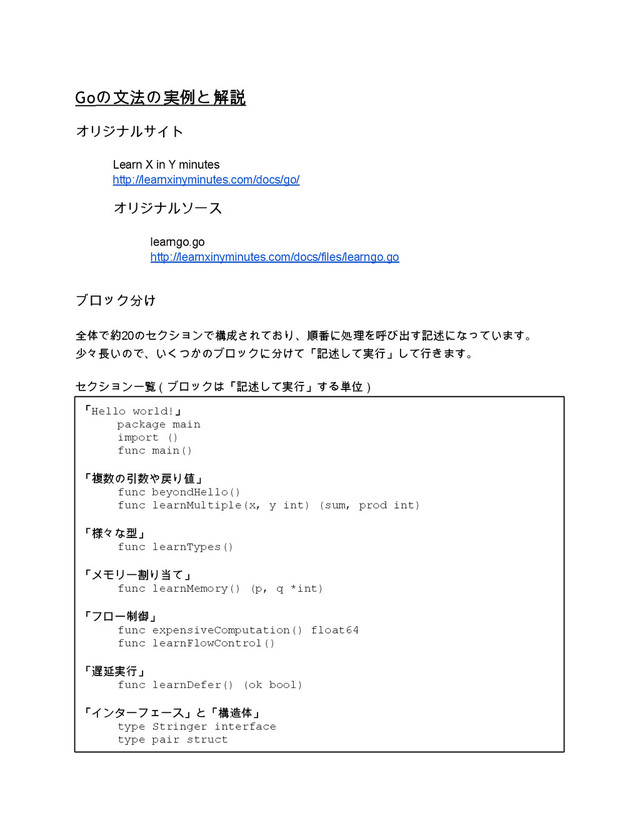 `A "raw" string literal can include line breaks.` g := 'Σ' f := 3.14195 c := 3 + 4i var u uint = 7 var pi float32 = 22. / 7 n := byte('\n') var a4 [4]int a3 := [...]int{3, 1, 5} s3 := []int{4, 5, 9} s4 := make([]int, 4) var d2 [][]float64 bs := []byte("a slice") // p, q := learnMemory() // fmt.Println(*p, *q) m := map[string]int{"three": 3, "four": 4} m["one"] = 1 _, _, _, _, _, _, _, _, _ = s2, g, f, u, pi, n, a3, s4, bs fmt.Println(s, c, a4, s3, d2, m) // learnFlowControl() } 「メモリー割り当て」 learngo04.go func learnMemory() (p, q *int) { p = new(int) s := make([]int, 20) s[3] = 7 r := -2 return &s[3], &r }