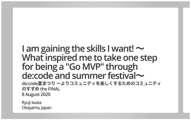 2020年8月8日(土)にオンラインで開催された「de:code夏まつり ~よりコミュニティを楽しくするためのコミュニティのすすめ the FINAL」での私の発表資料「I am gaining the skills I want! 〜What inspired me to take one step for being a "Go MVP" through de:code and summer festival〜」です。私が拝見したde:code 2020のセッションの紹介、感想、Go情報などを紹介しています。オリジナル版:https://talks.godoc.org/github.com/qt-luigi/talks/2020/decode-summer-festival-final.slide#1